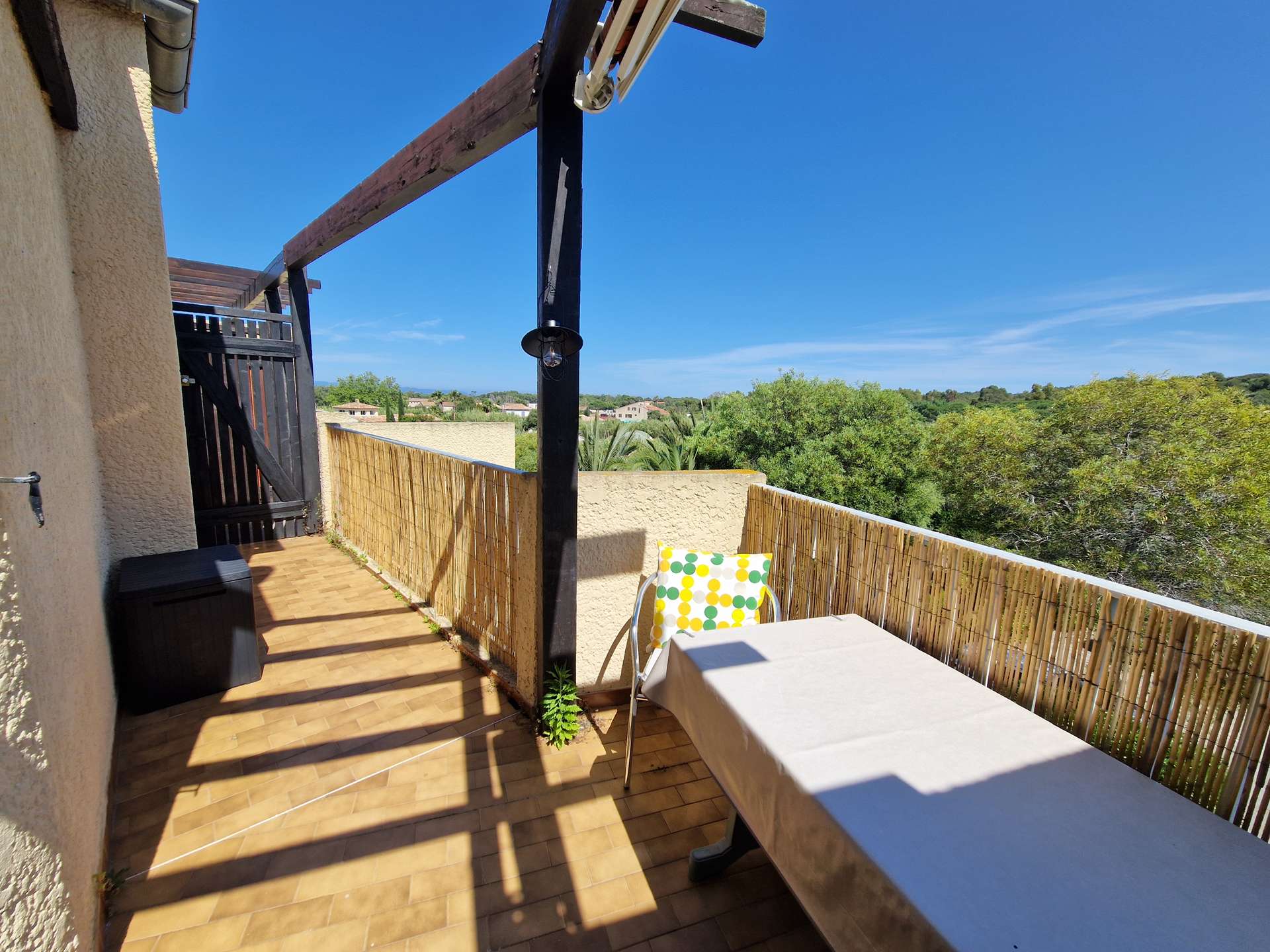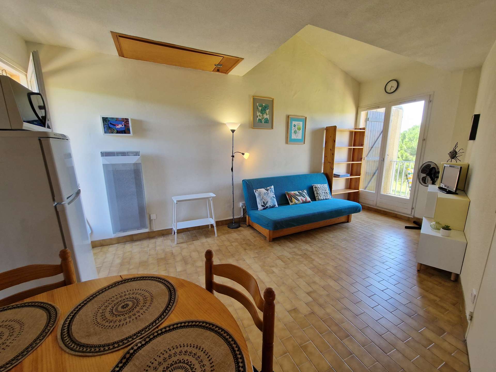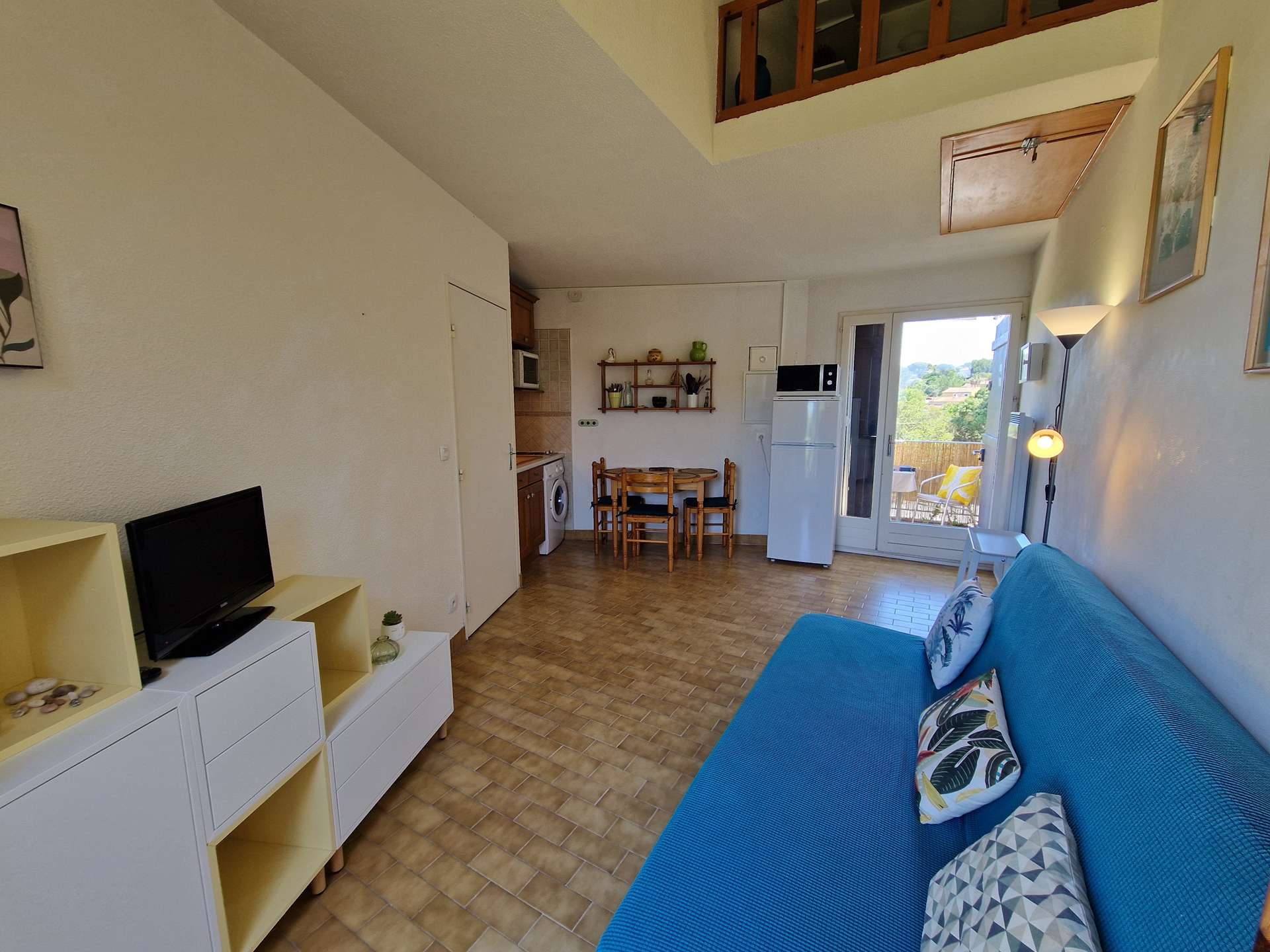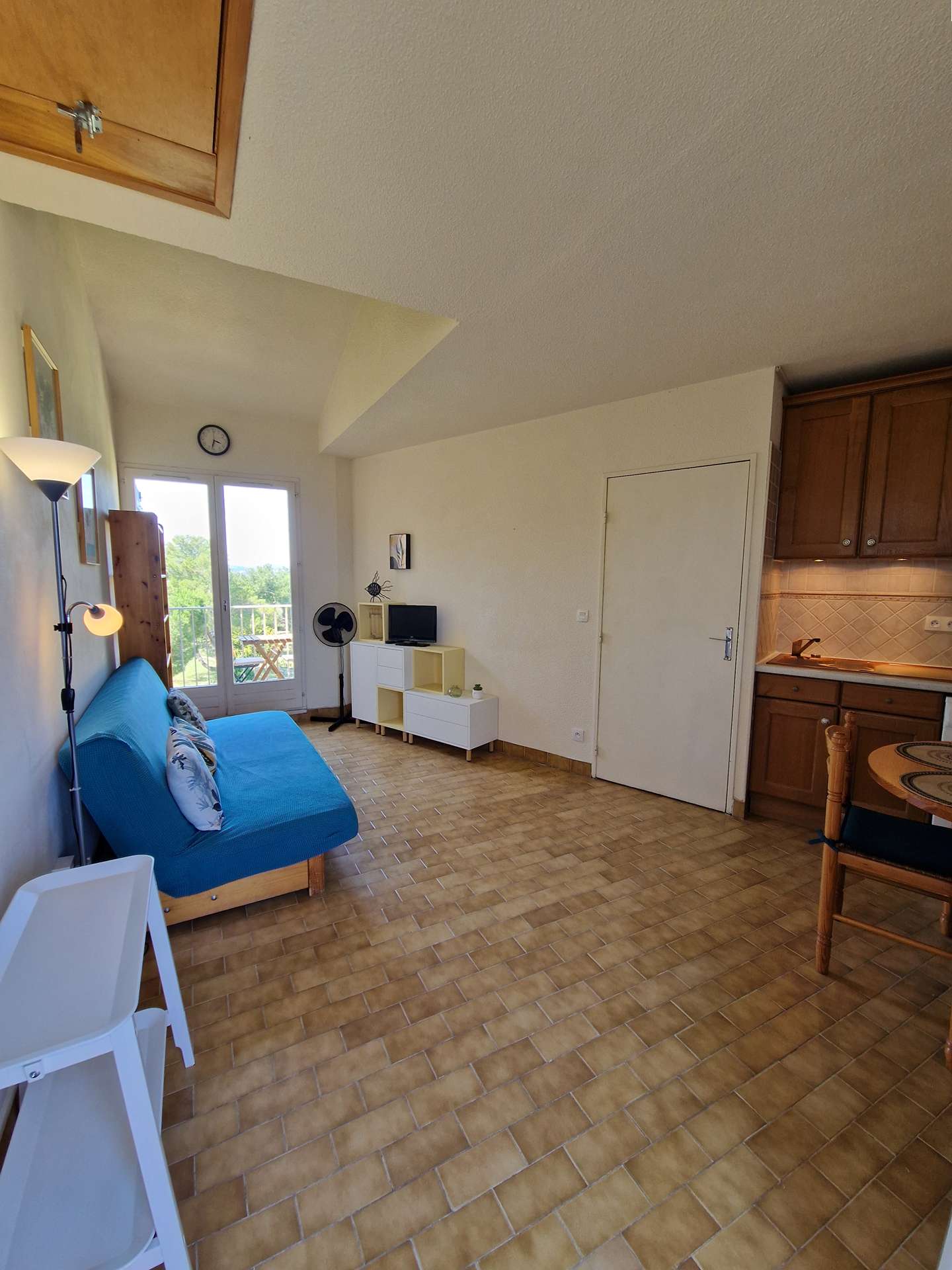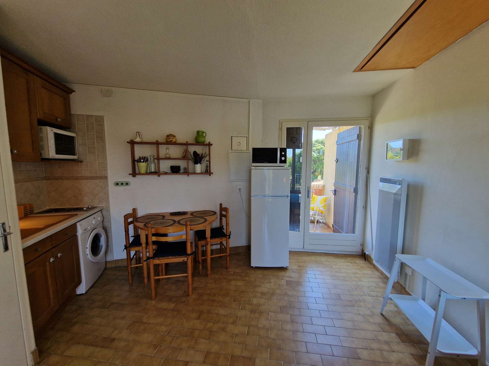 Un séjour avec une kitchenette, une salle d'eau, un WC indépendant, une terrasse exposée sud et un petit balcon donnant sur un parc arboré.