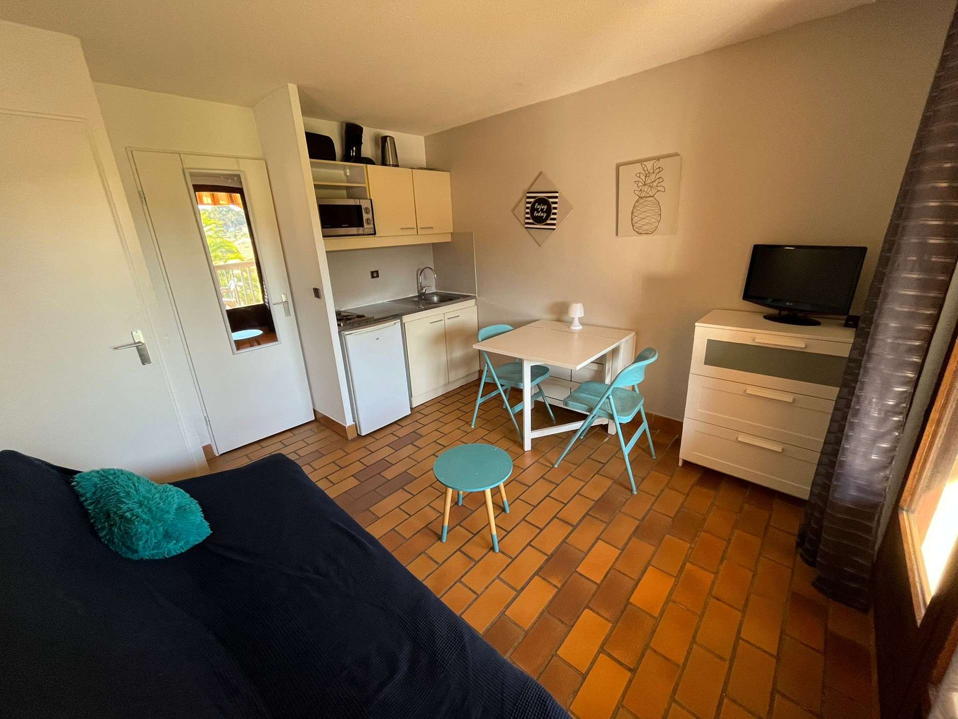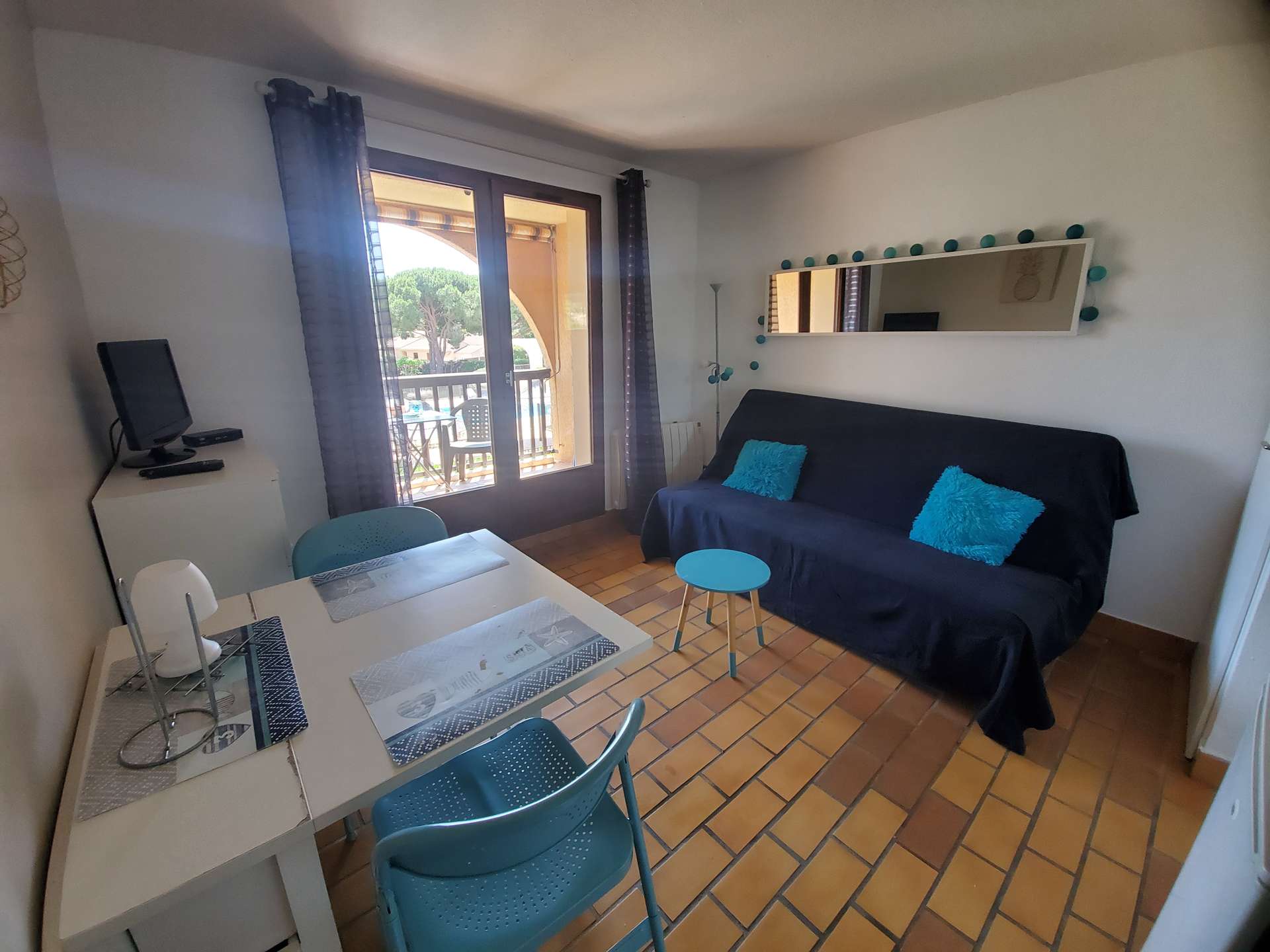 Séjour/coin nuit avec une kitchenette, une alcôve, une salle de bain avec un WC et une terrasse donnant sur la piscine.