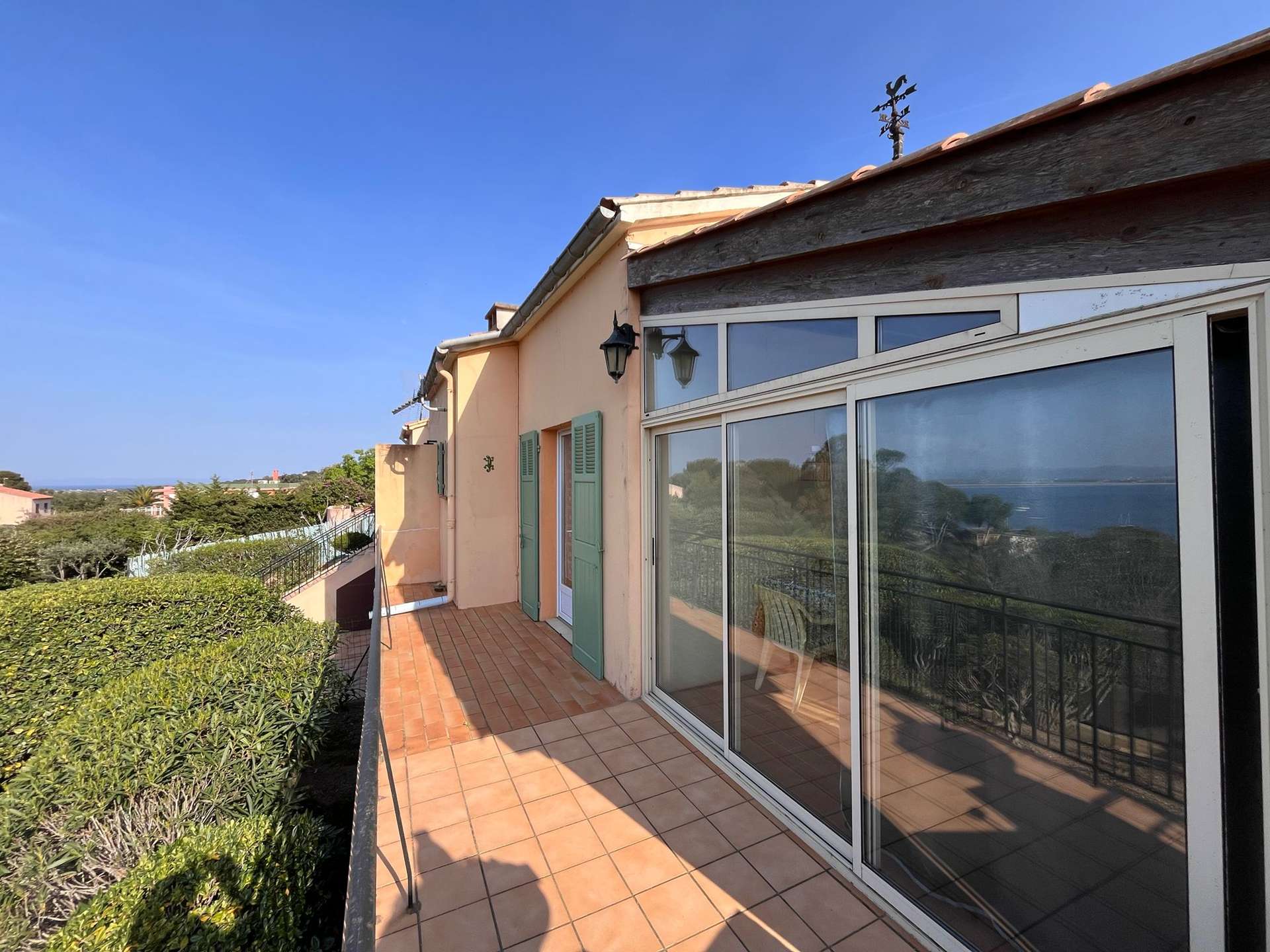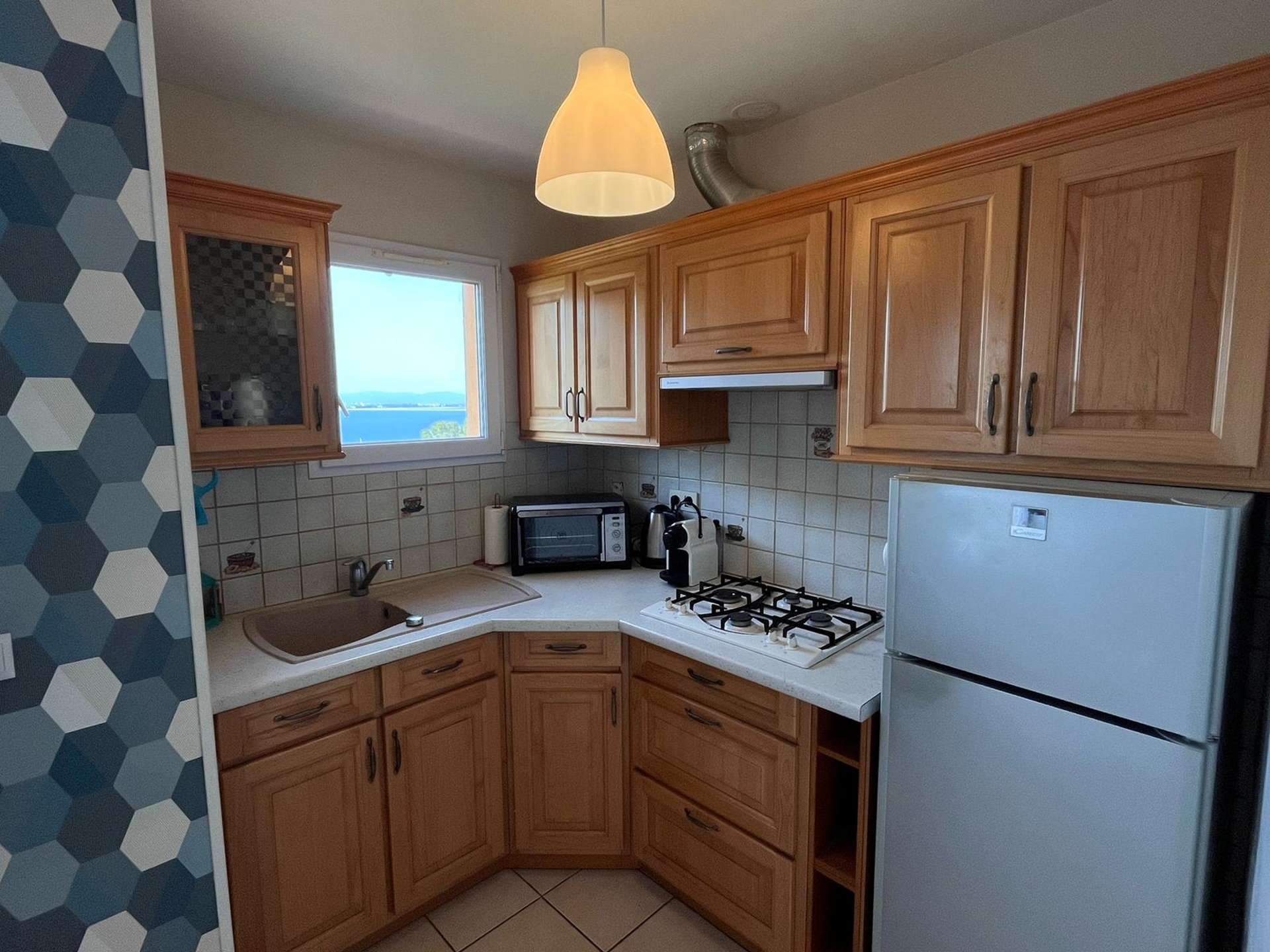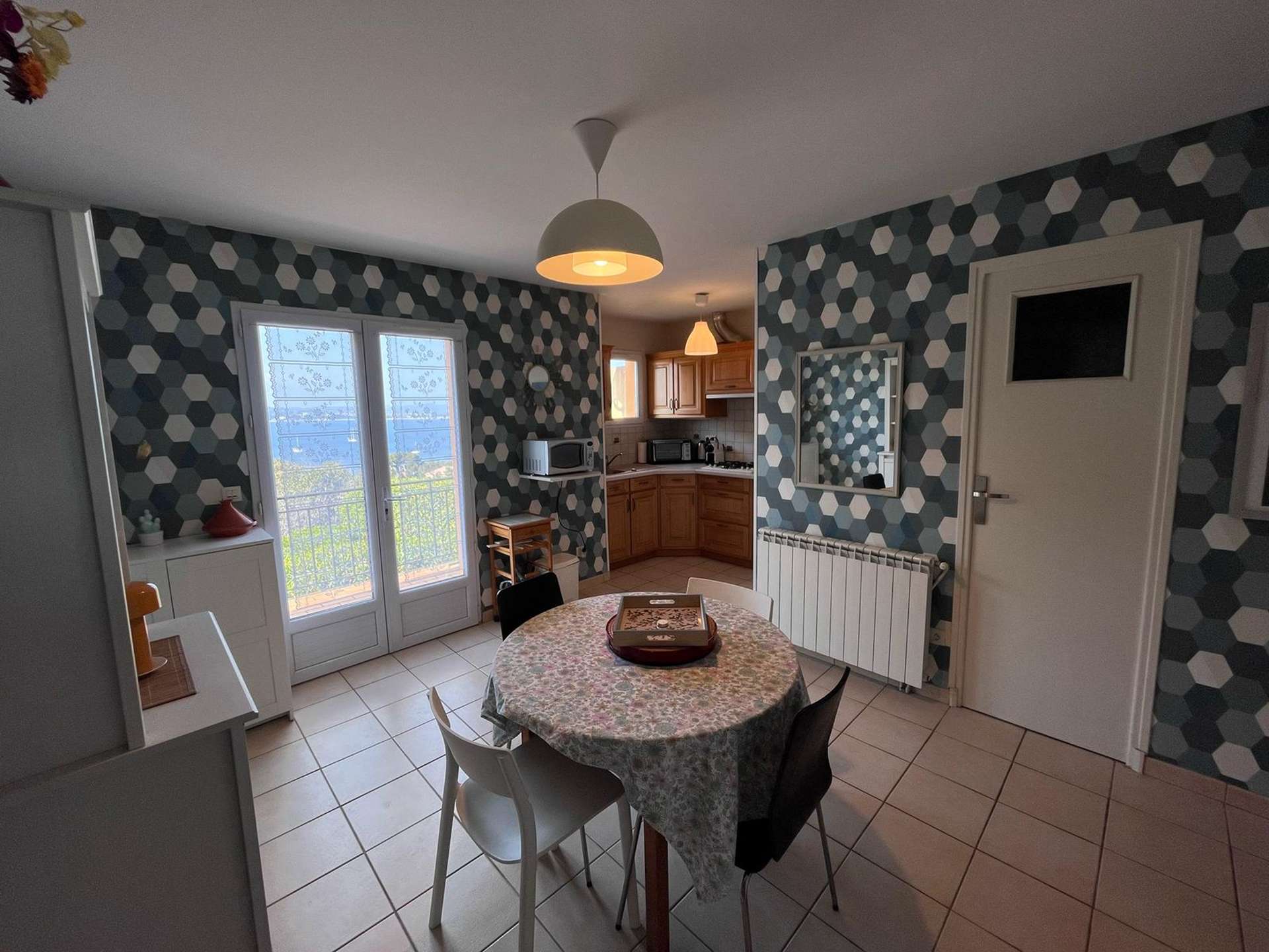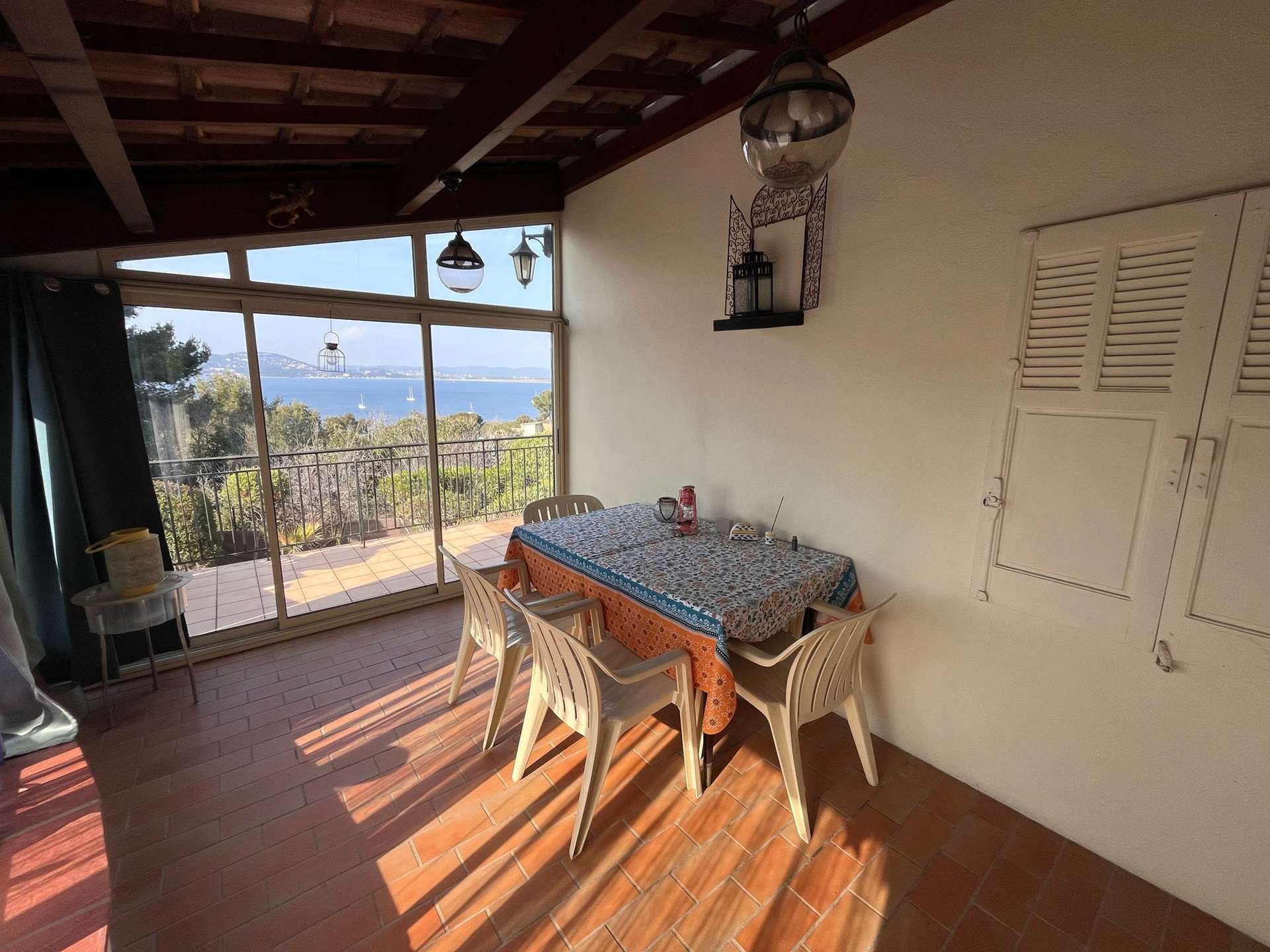 Cuisine ouverte sur la salle à manger donnant sur une terrasse avec vue mer, séjour avec coin nuit, une chambre, une salle d'eau avec un WC, une véranda et une terrasse avec vue mer !