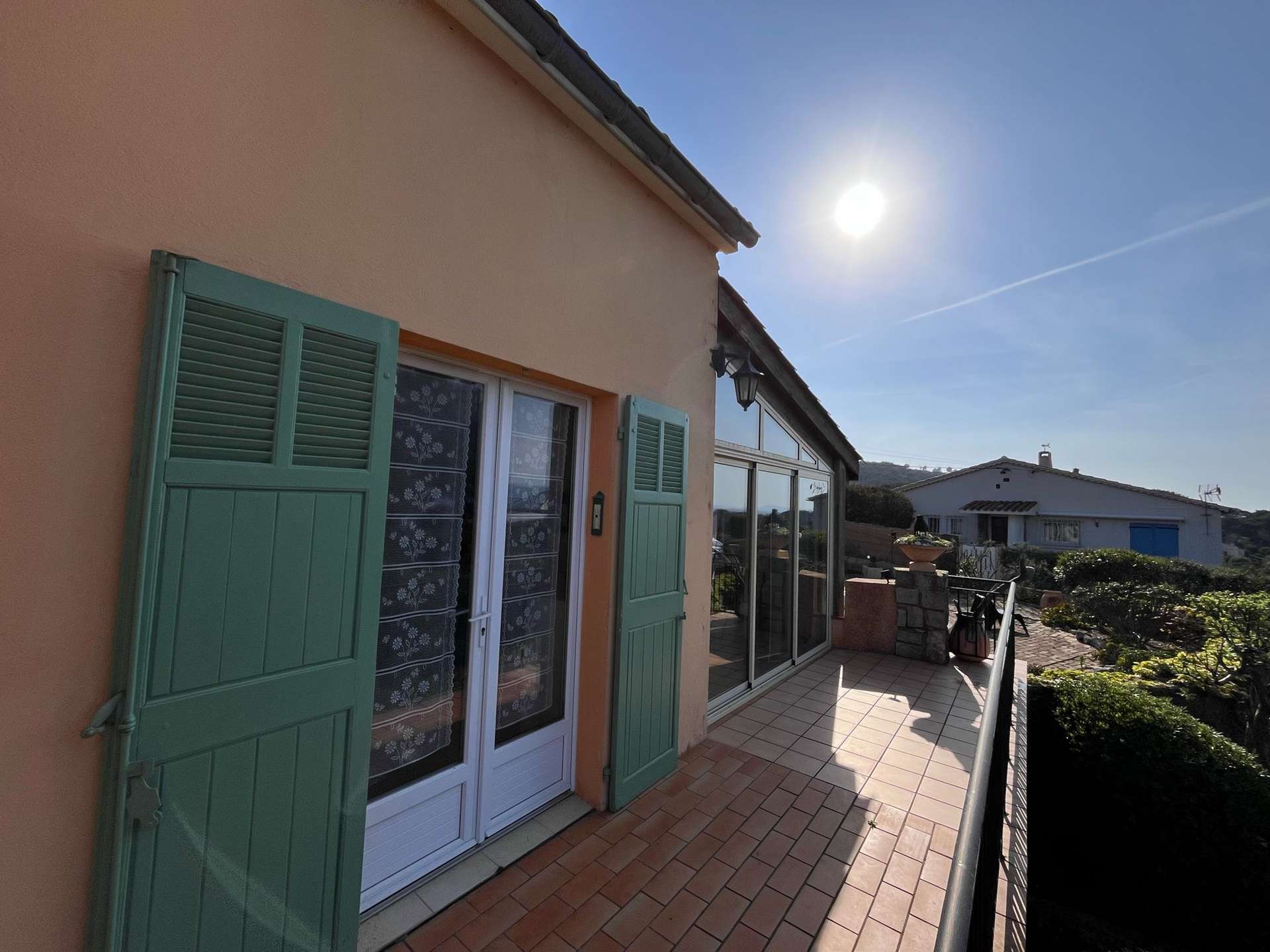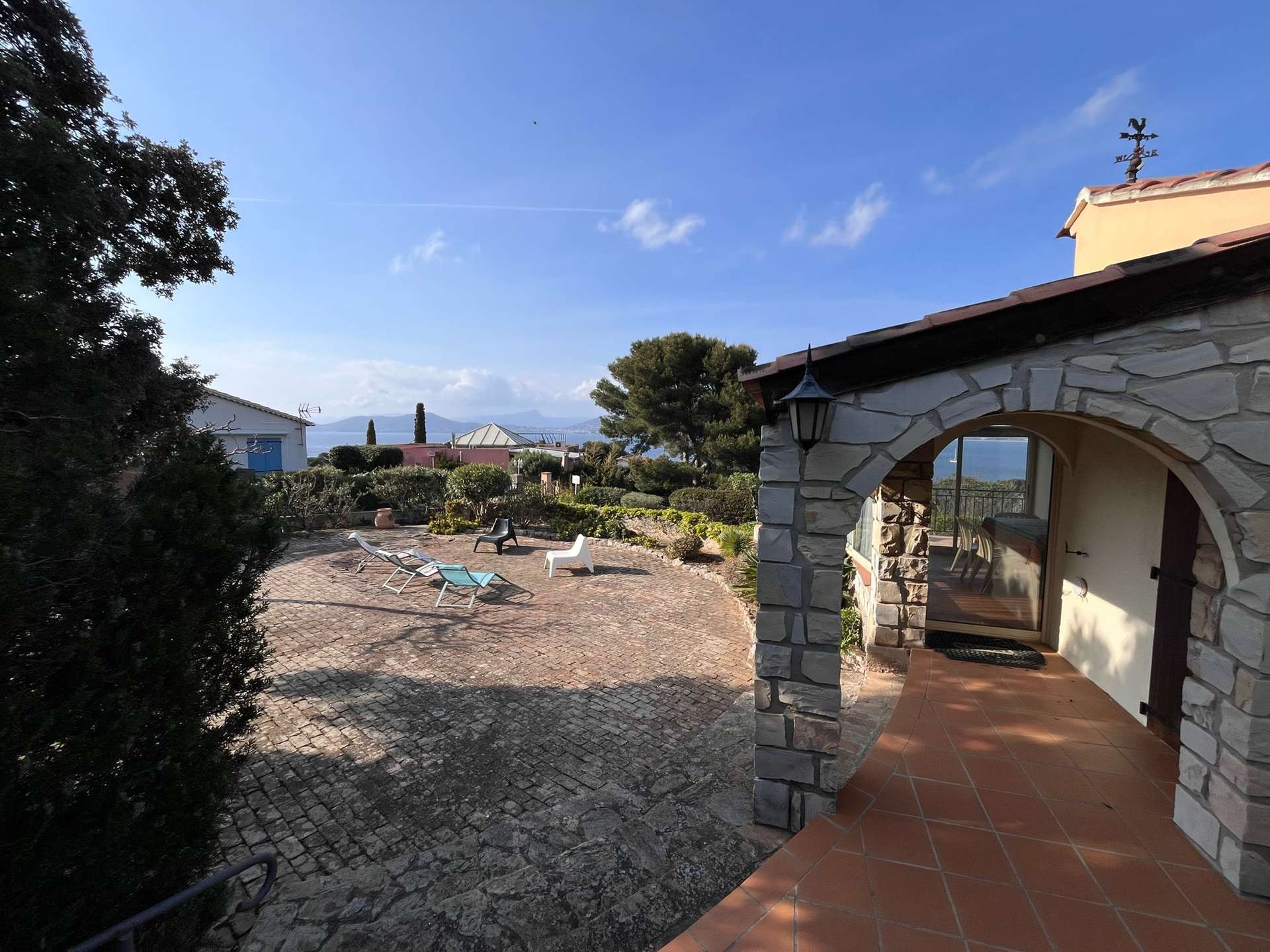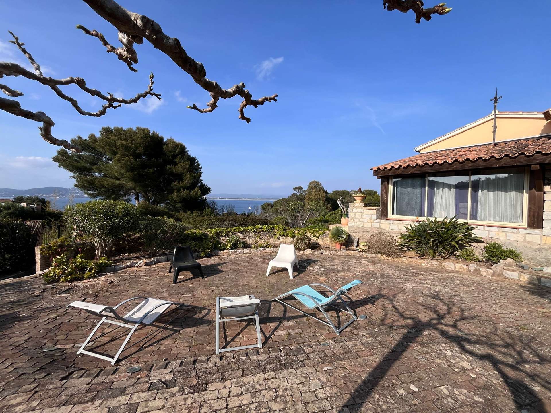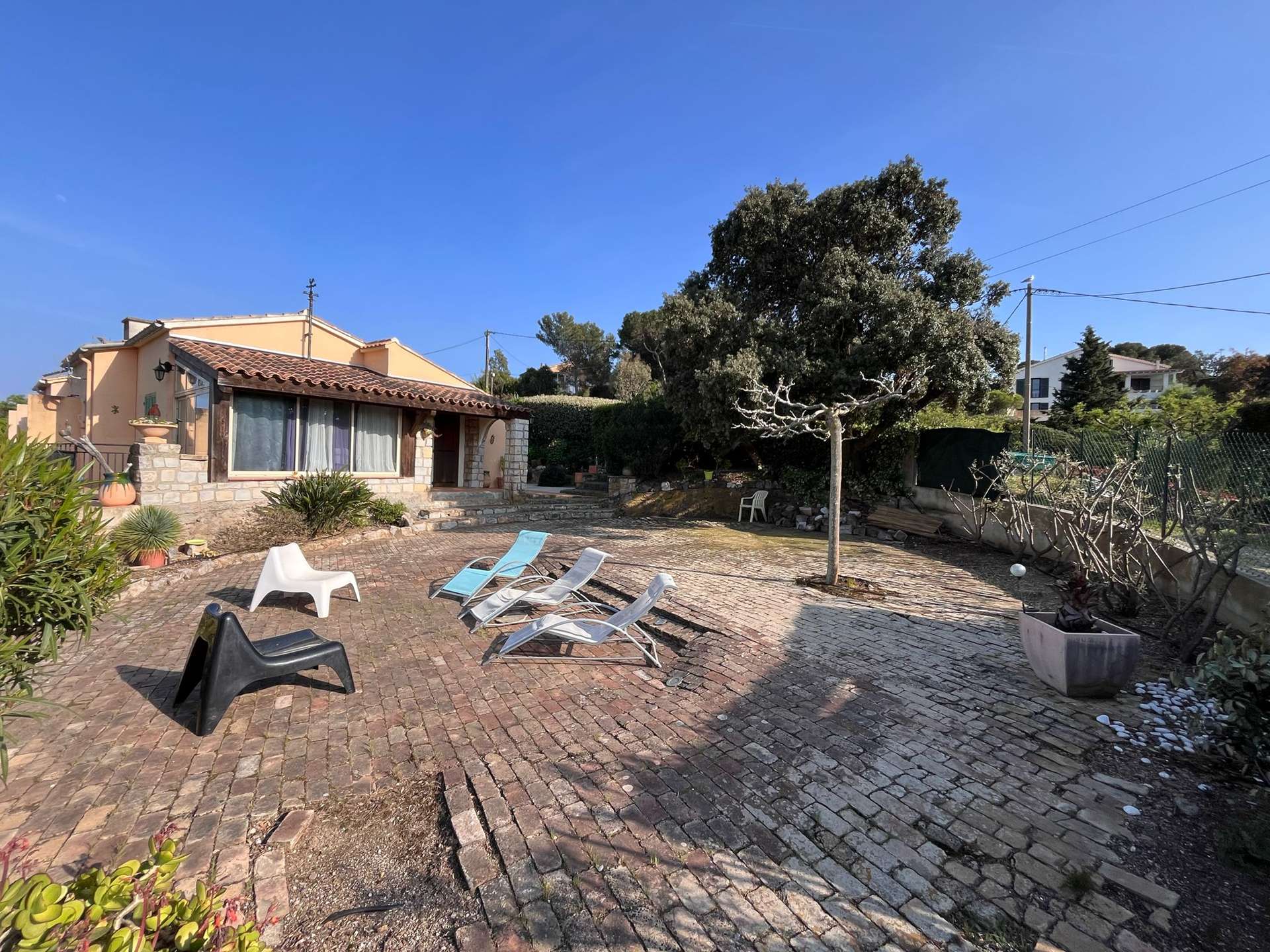 Maison de vacances mitoyenne pour 4 personnes située au bout de la Presqu'île de Giens, à 500 m de la mer et des criques. Belle vue mer. 2 places de stationnement devant la maison.
