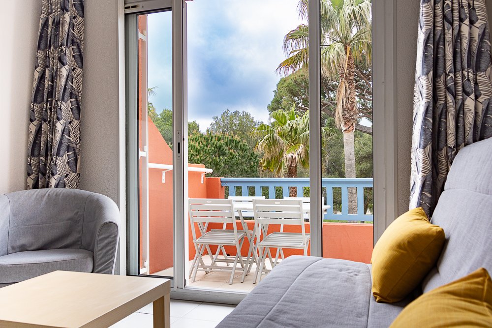 Un séjour avec coin nuit et une kitchenette, une alcôve, une salle d'eau avec un WC et une terrasse avec vue piscine.