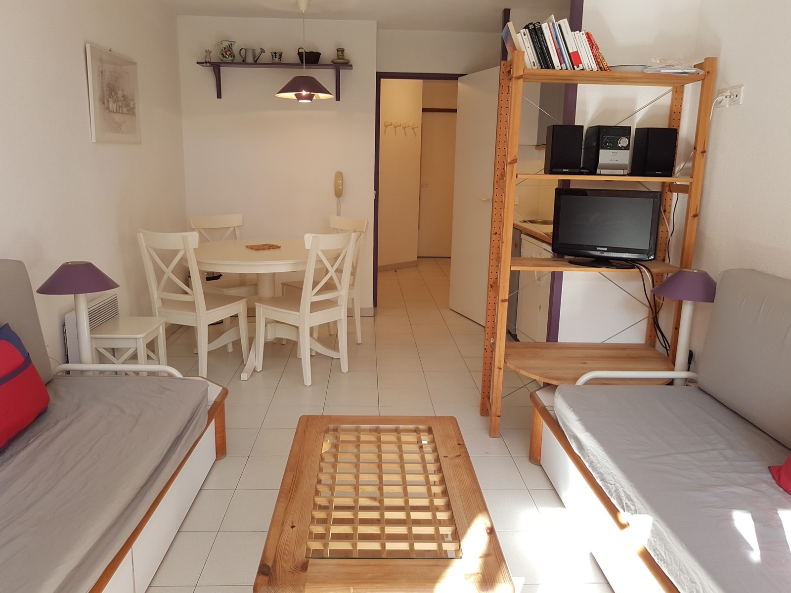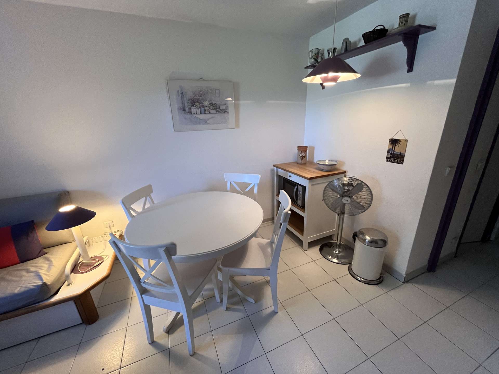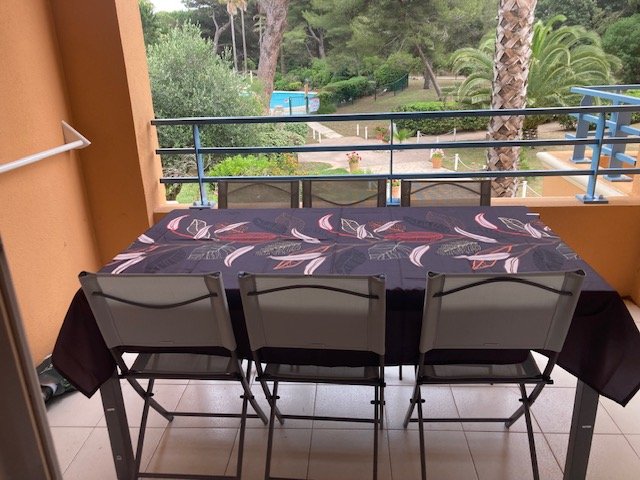 Résidence de la Pinède : Appartement T2 pour 5 personnes au premier étage dans une résidence les pieds dans l'eau, accès direct et privé à la plage de la Badine sur la Presqu'île de Giens. Résidence avec piscine, aires de jeux et restaurant d'été. Laverie à pièces et parking. Wifi (payant).