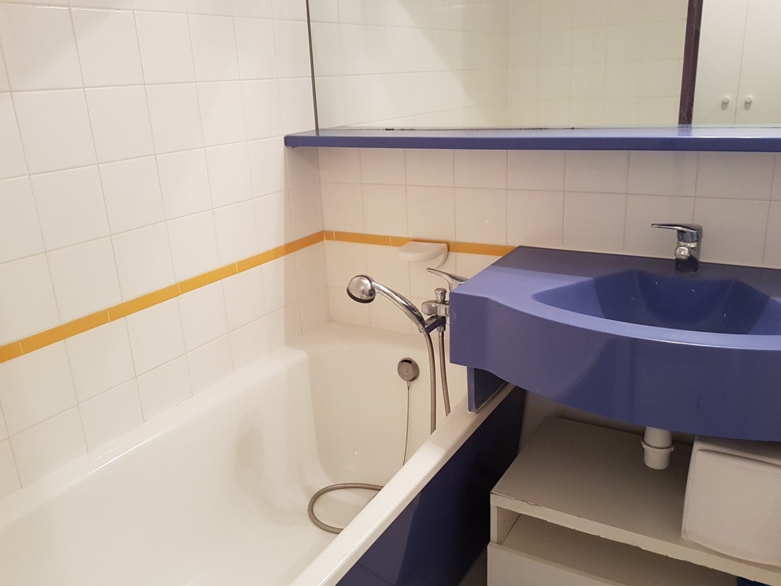 Un séjour avec une kitchenette, une chambre, une salle de bain, un WC indépendant et une terrasse.