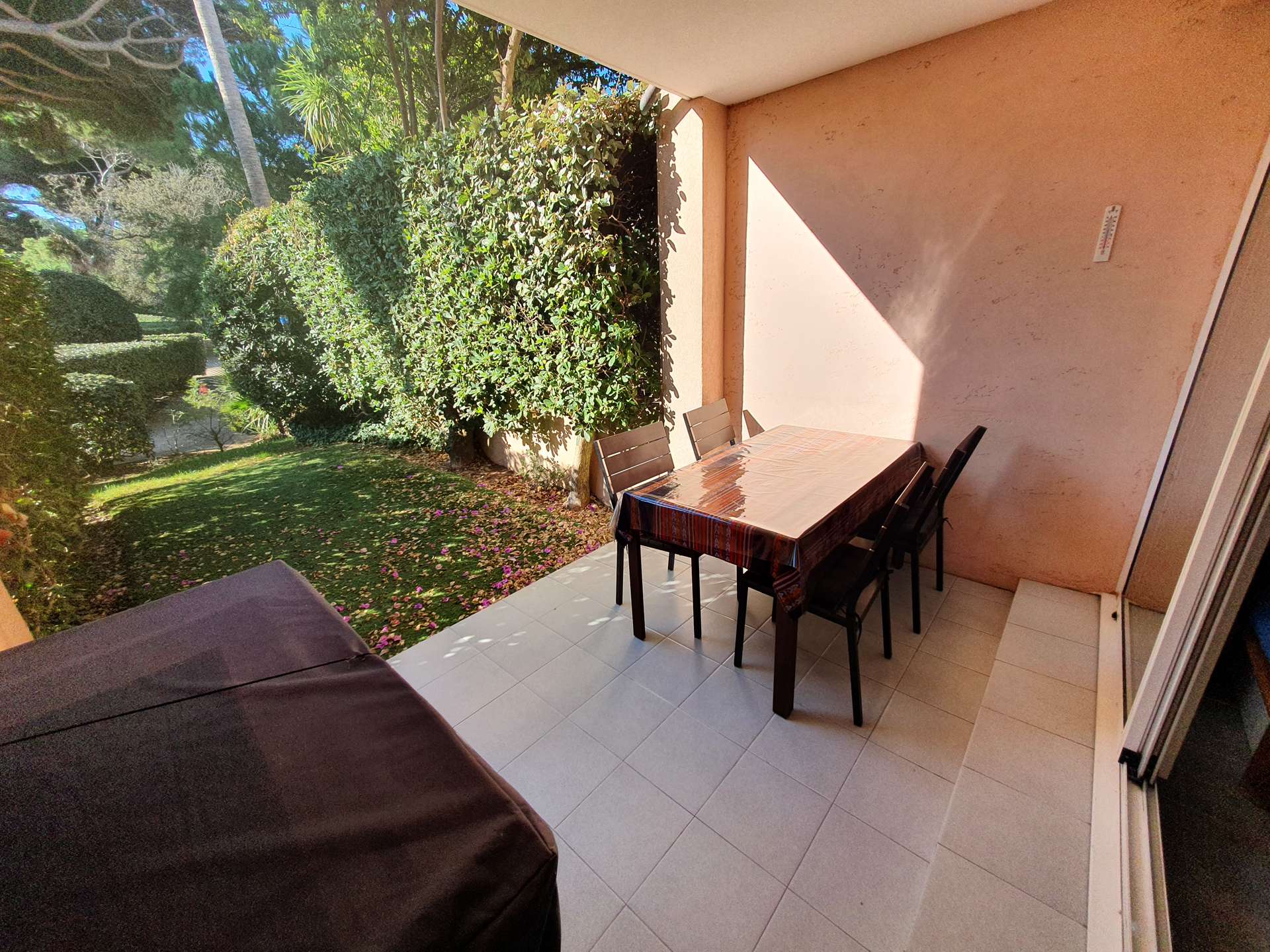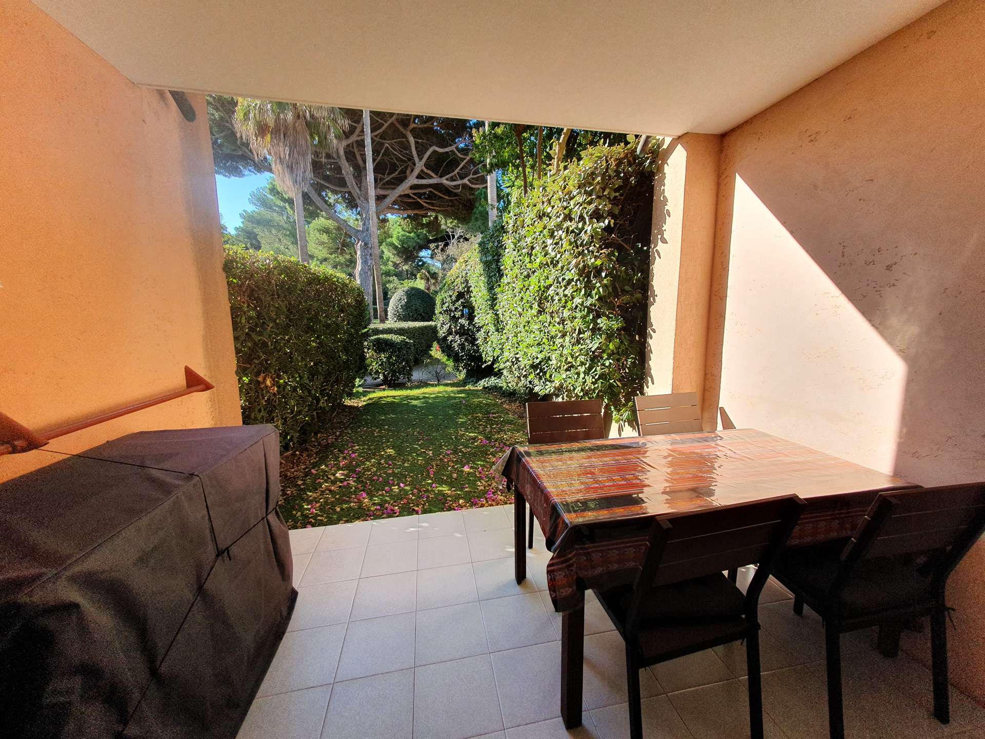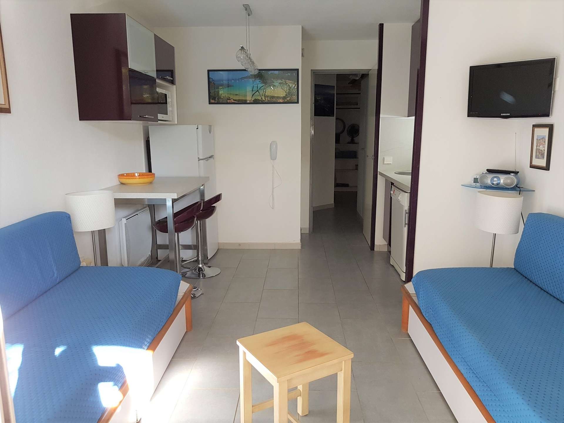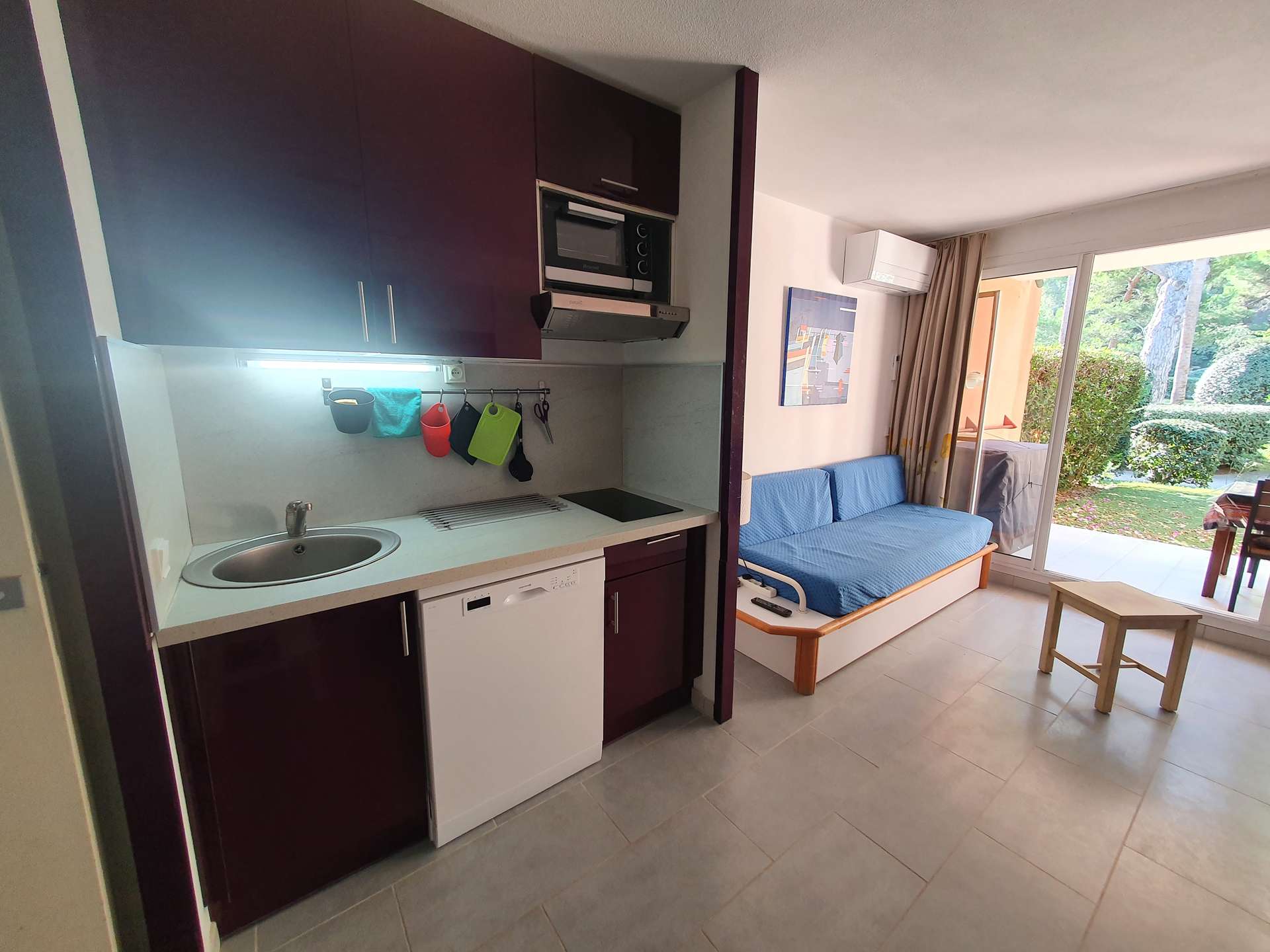 Résidence de la Pinède : Appartement T2 climatisé pour 4/5 personnes en rez de jardin, dans une résidence les pieds dans l'eau, accès direct et privé à la plage de la Badine sur la Presqu'île de Giens. Résidence avec piscine, aires de jeux et restaurant d'été. Laverie à pièces et parking. Wifi (payant). Climatisation dans le séjour.