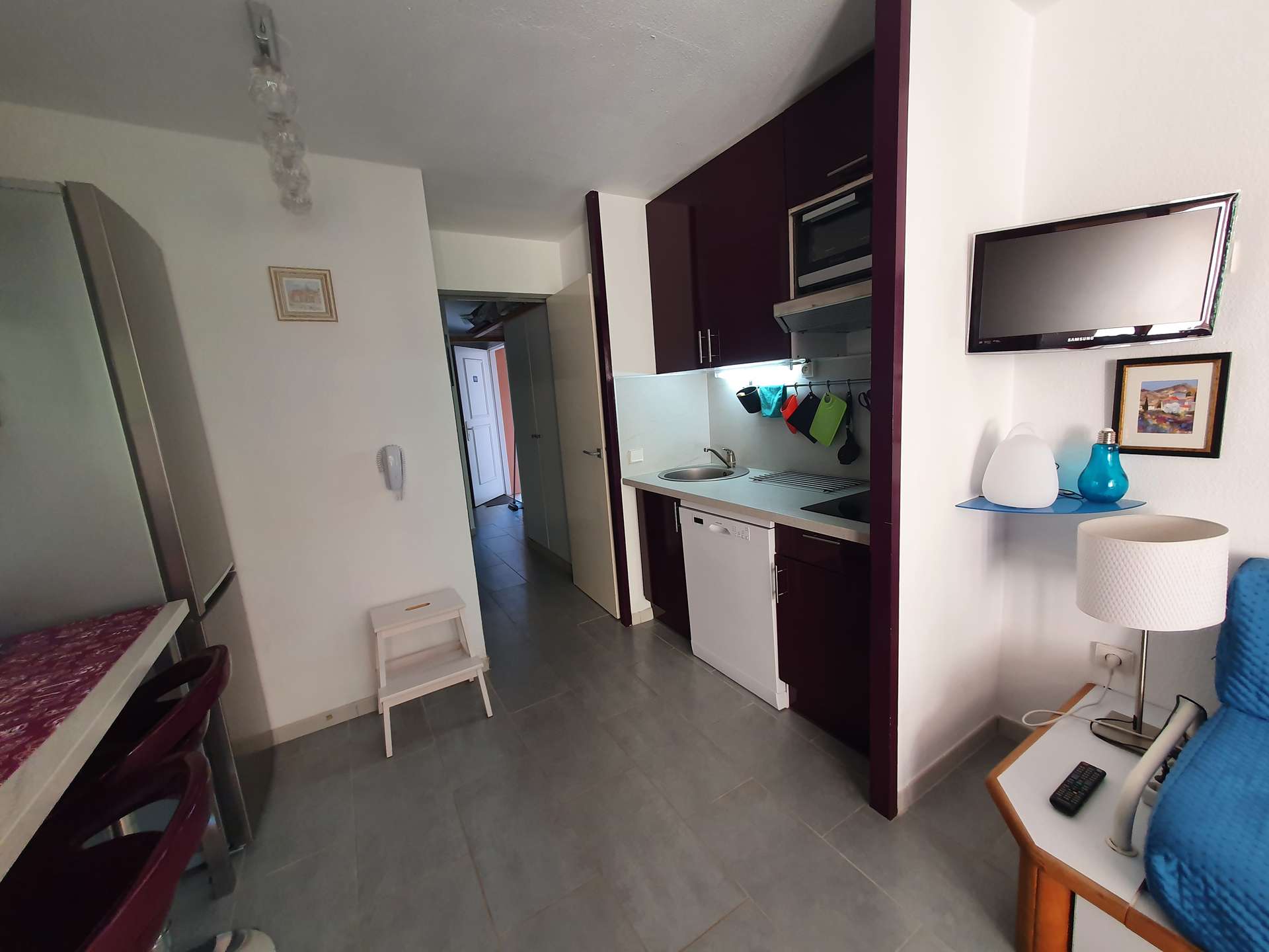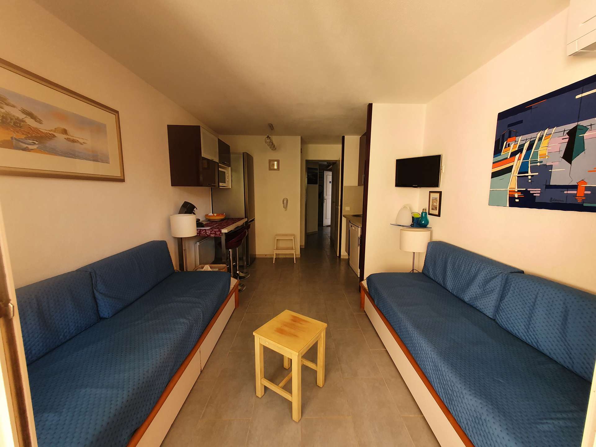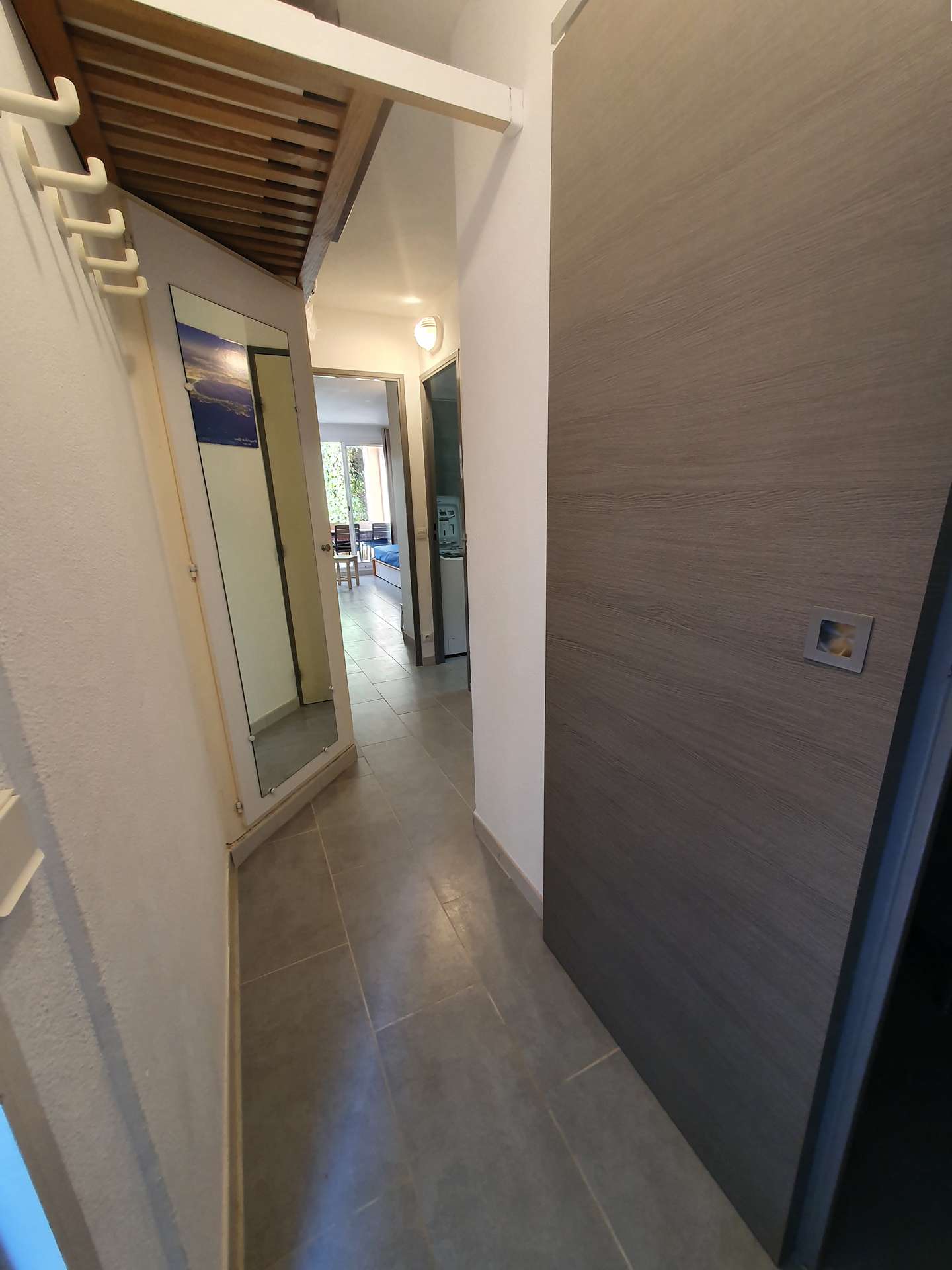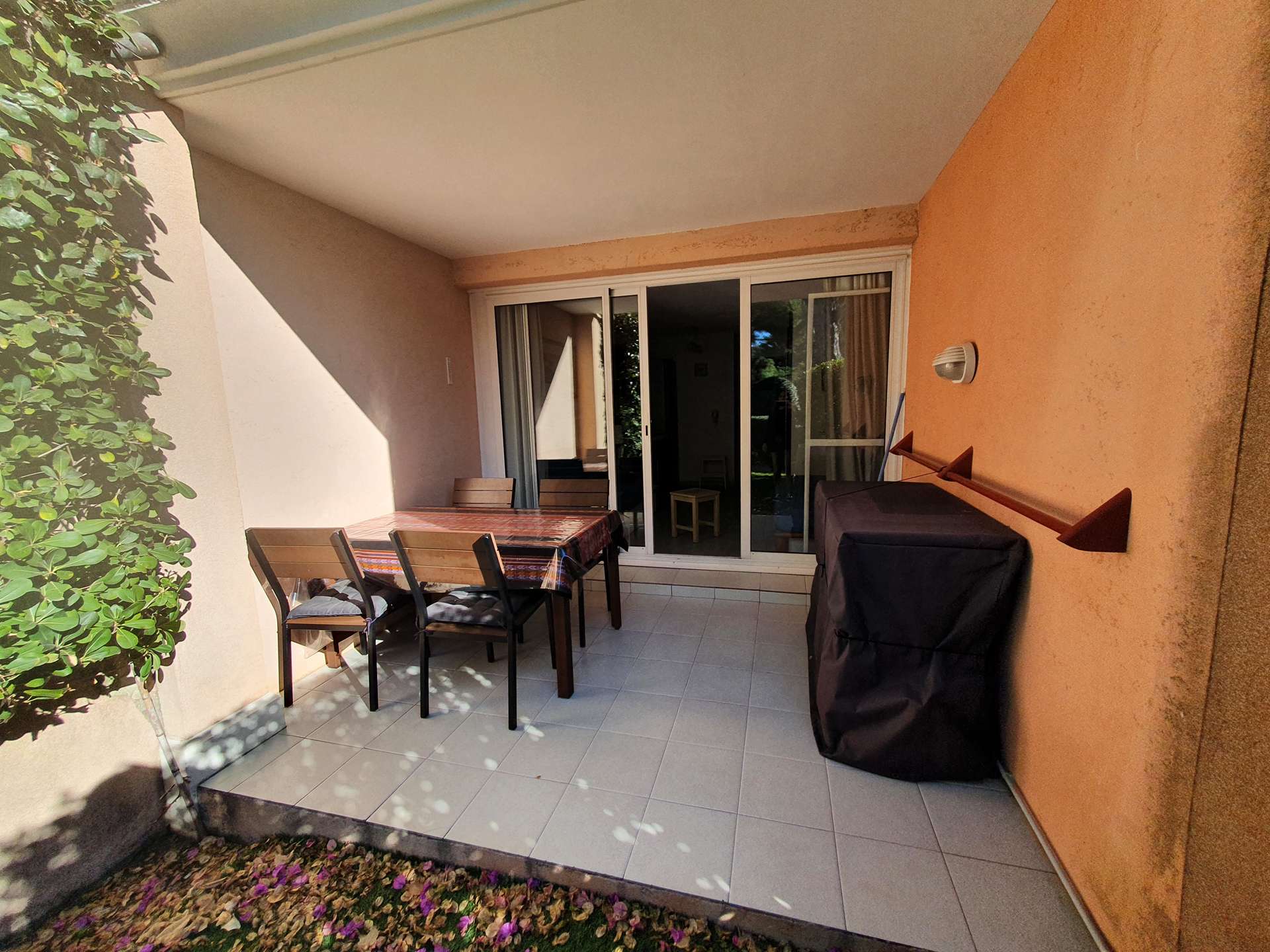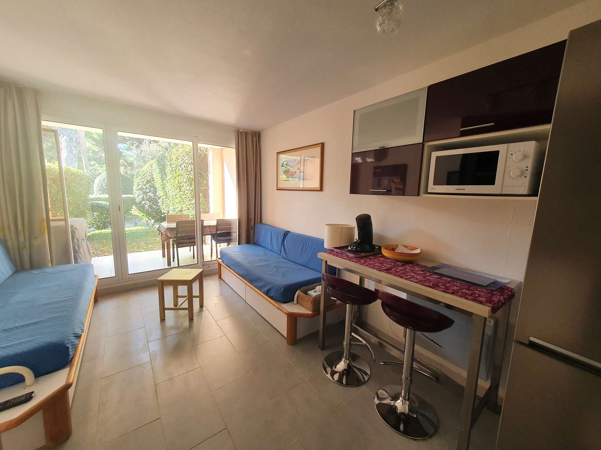 Un séjour avec une kitchenette, une chambre, une salle d'eau et un WC indépendant, une terrasse et jardinet non clos.