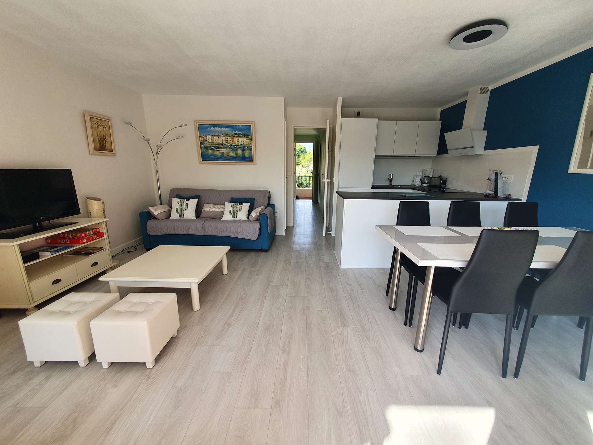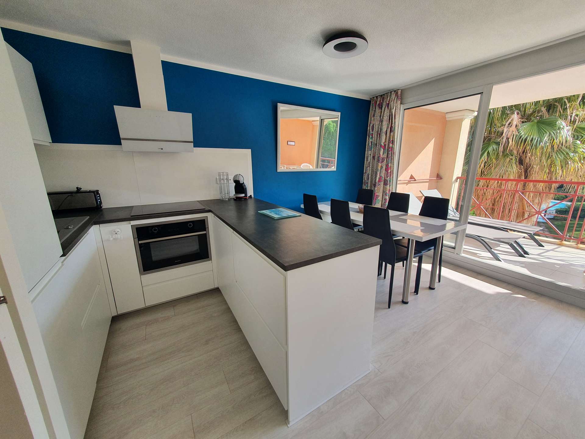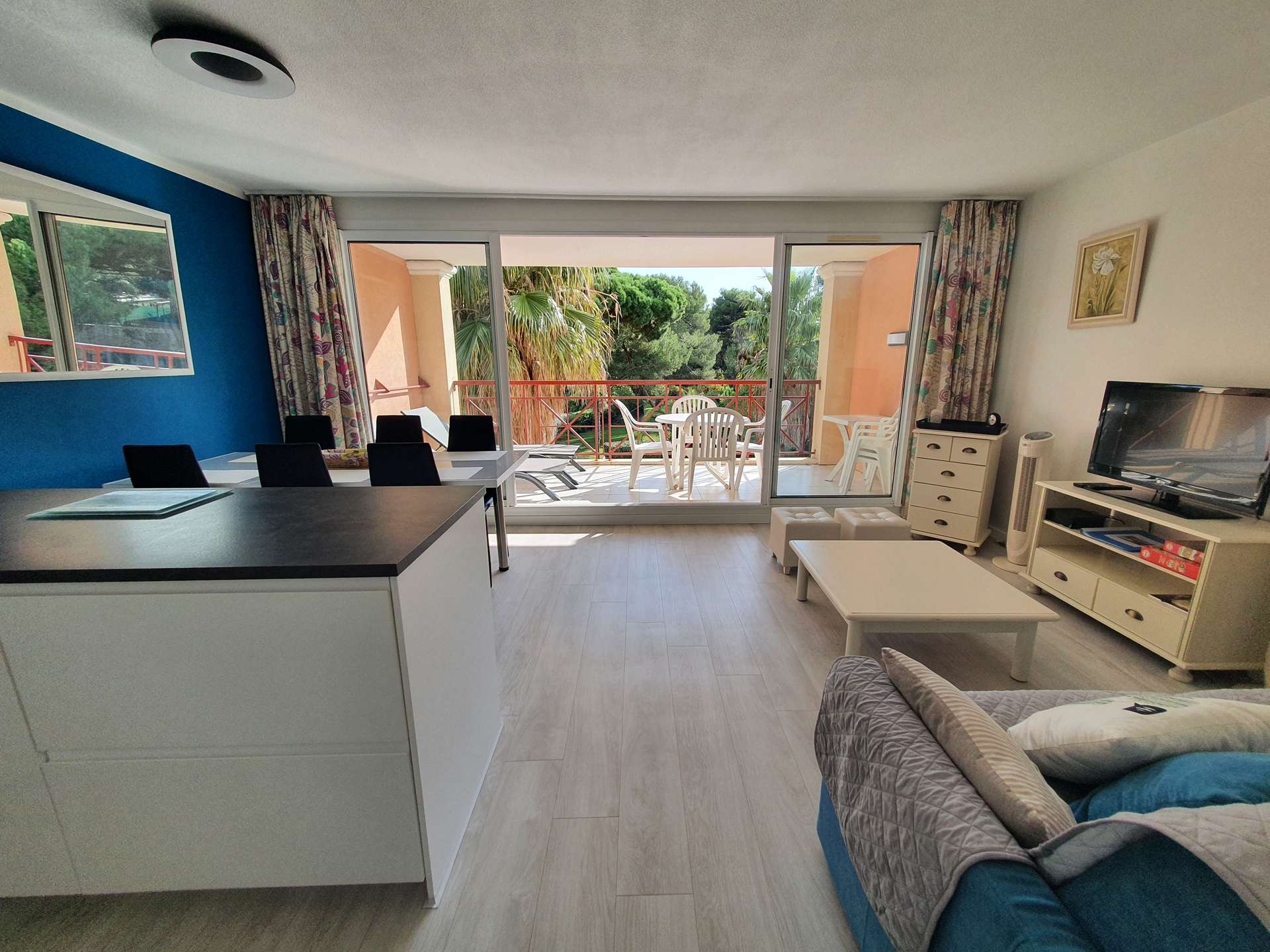 Un séjour avec une salle à manger, une cuisine ouverte, 2 chambres, une salle d'eau avec un WC, une salle de bain et une terrasse avec vue sur la résidence.