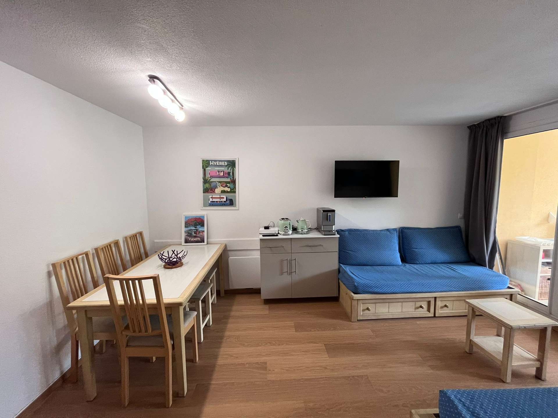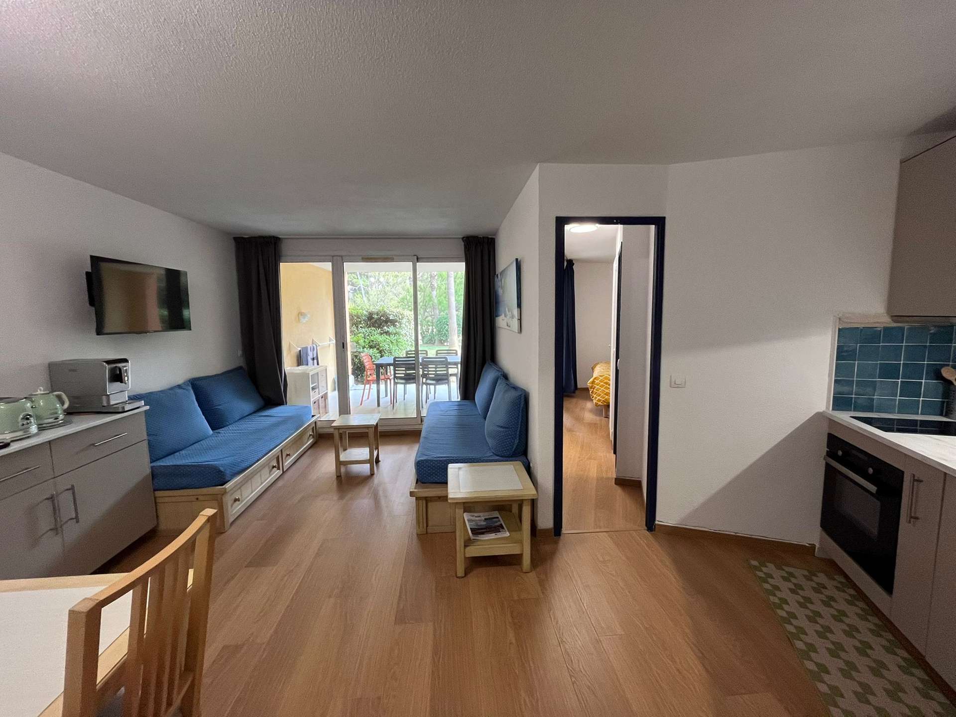 Un séjour avec kitchenette et coin nuit, une alcôve, une salle d'eau avec un WC, une suite parentale avec salle d'eau et un WC et une terrasse en rez de jardin non close.