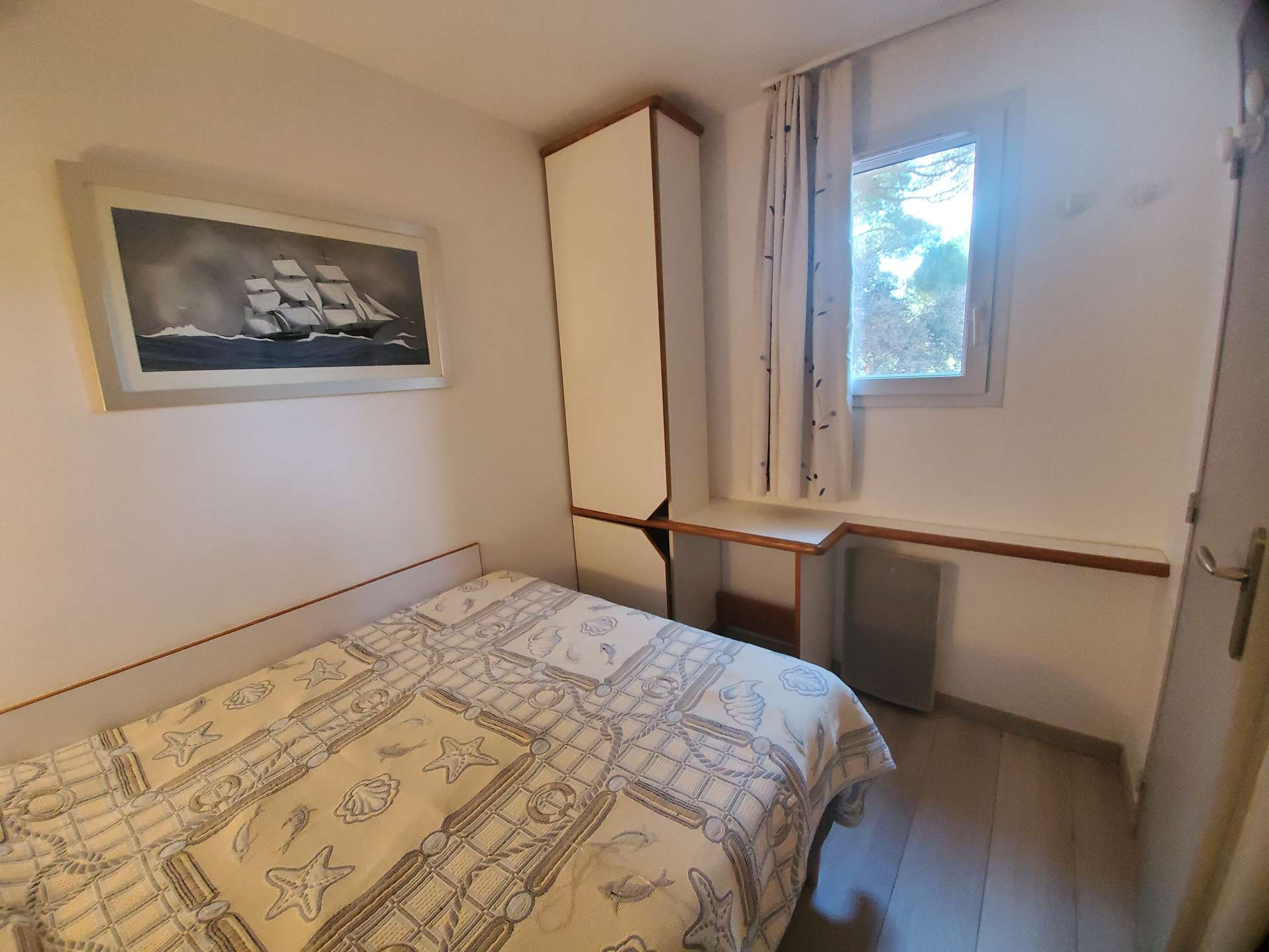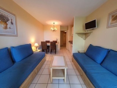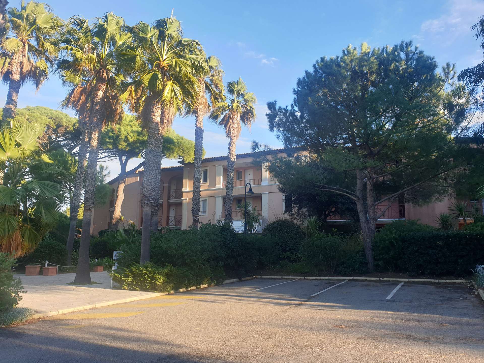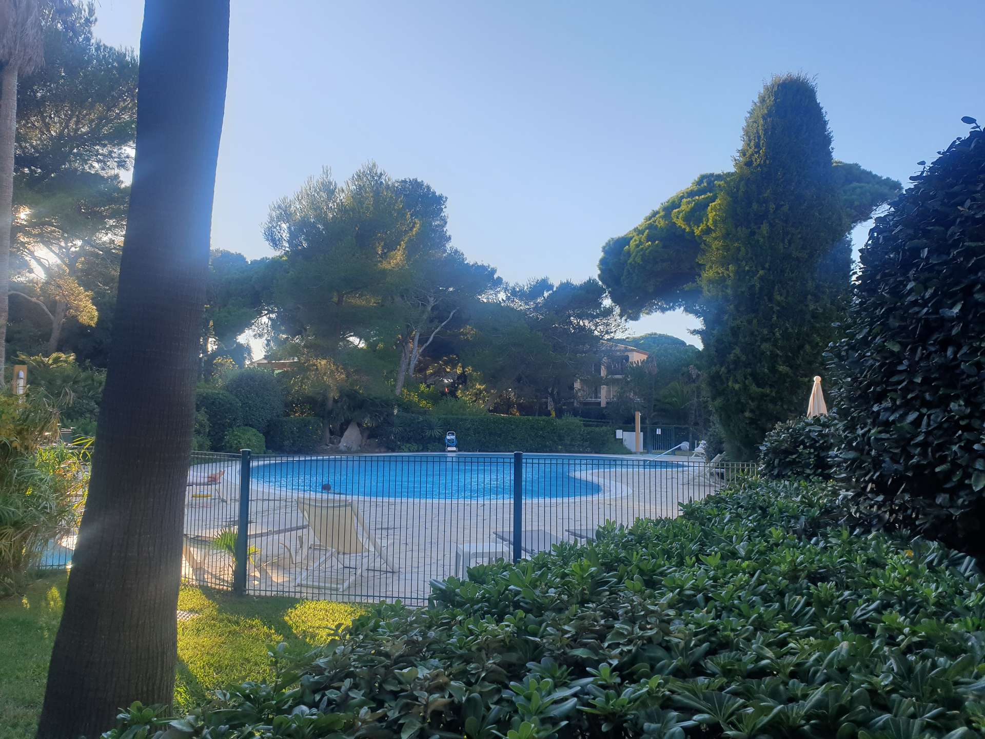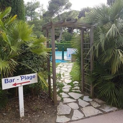 Résidence de la Pinède 3* : Appartement T2 climatisé au premier étage pour 4/5 personnes dans une résidence les pieds dans l'eau, accès direct et privé à la plage de la Badine sur la Presqu'île de Giens. Résidence avec piscine, aires de jeux et restaurant d'été. Laverie à pièces et parking. Wifi (payant) & Climatisation dans le séjour.