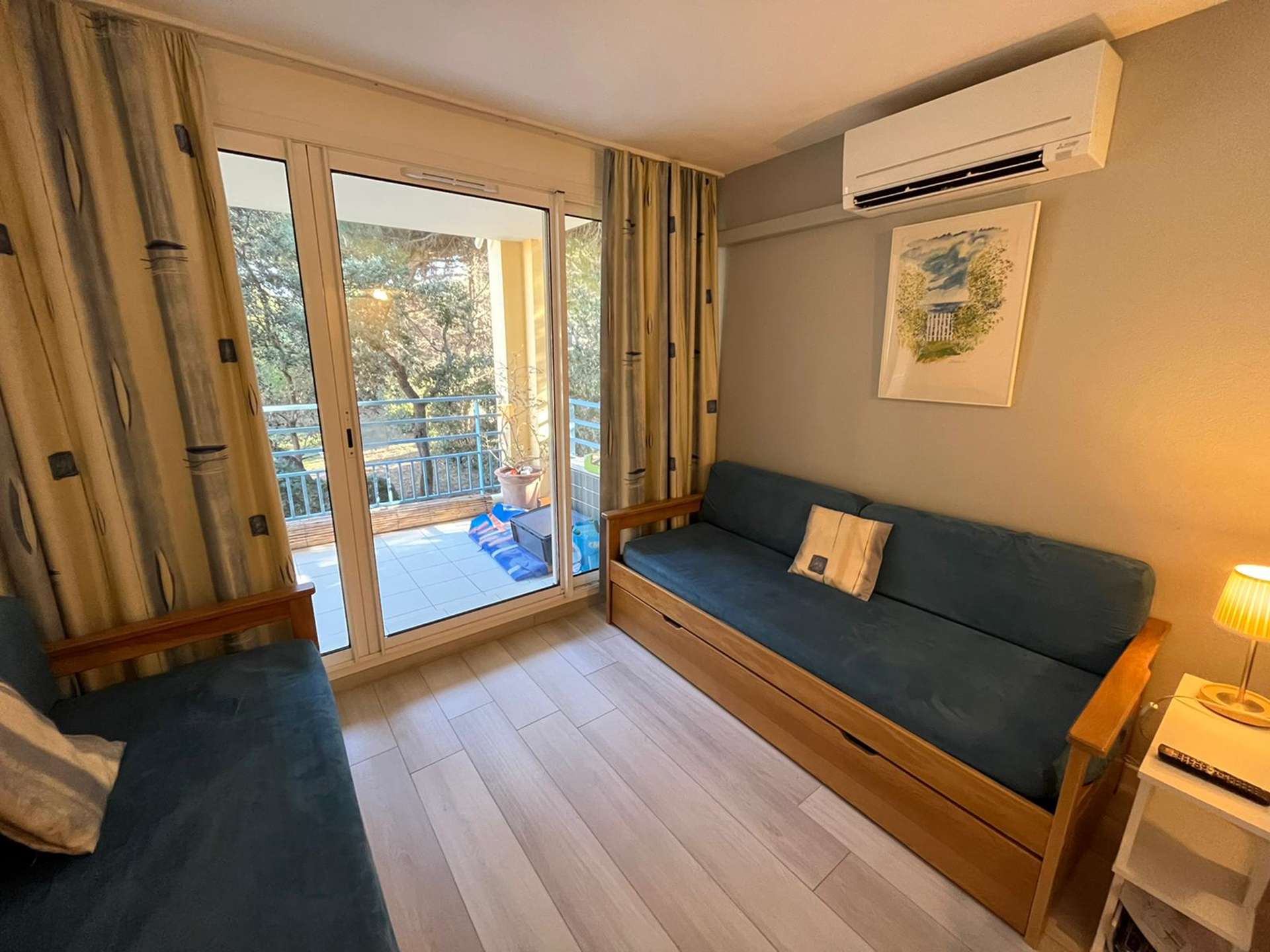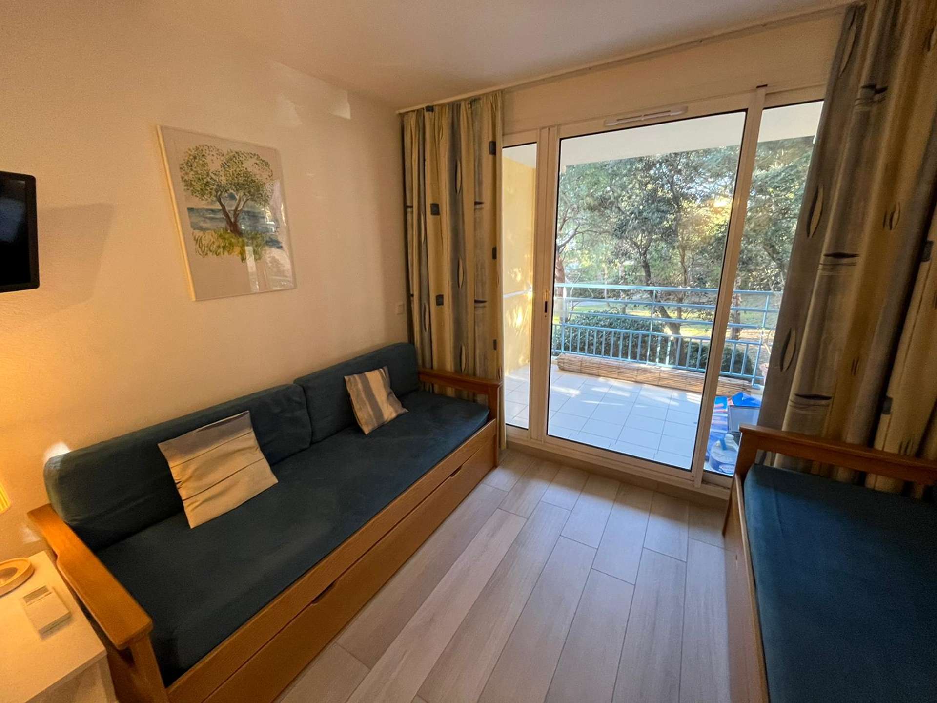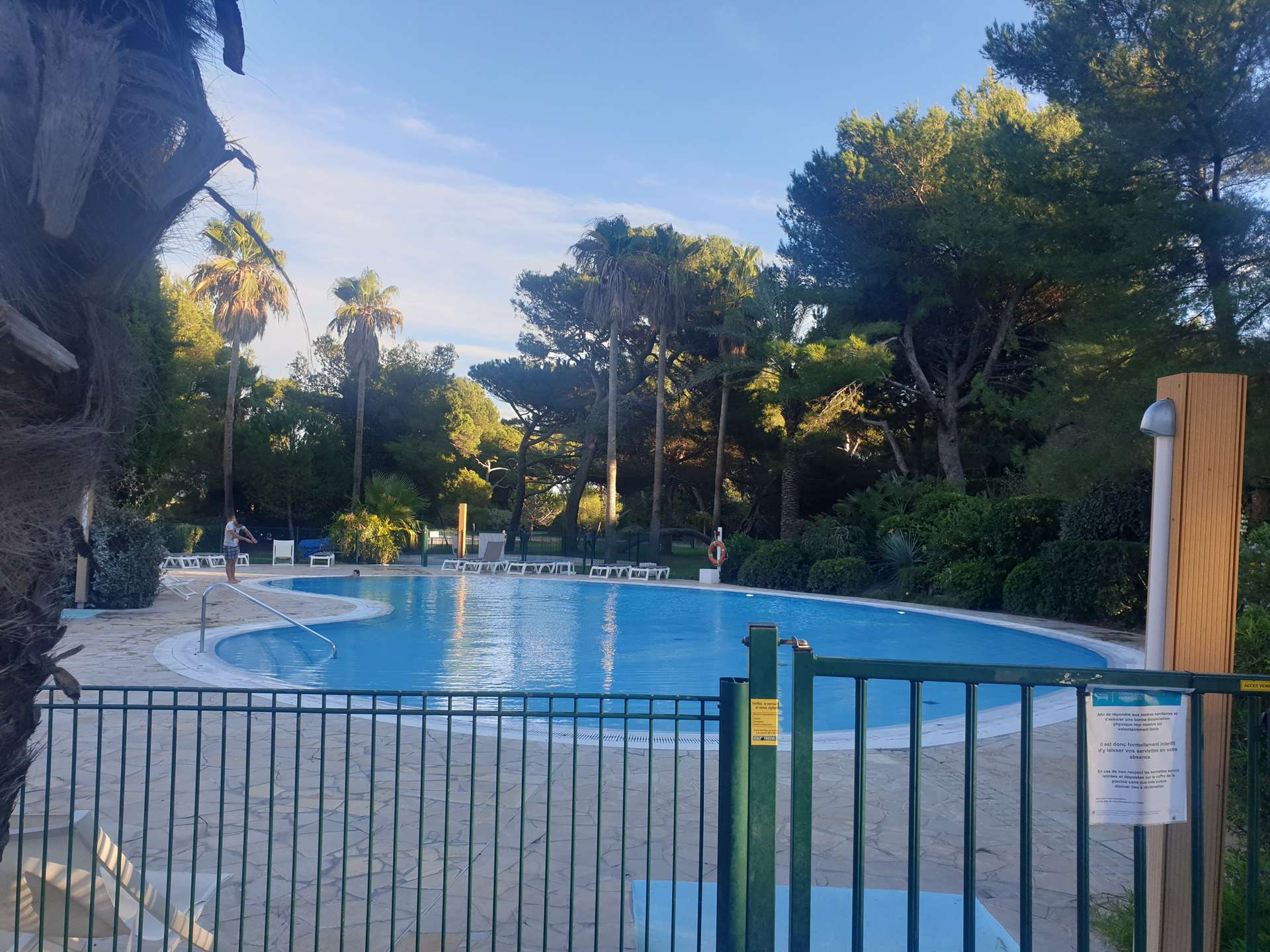 Résidence de la Pinède 3* : Appartement T2 climatisé au premier étage pour 4/5 personnes dans une résidence les pieds dans l'eau, accès direct et privé à la plage de la Badine sur la Presqu'île de Giens. Résidence avec piscine, aires de jeux et restaurant d'été. Laverie à pièces et parking. Wifi (payant) & Climatisation dans le séjour.