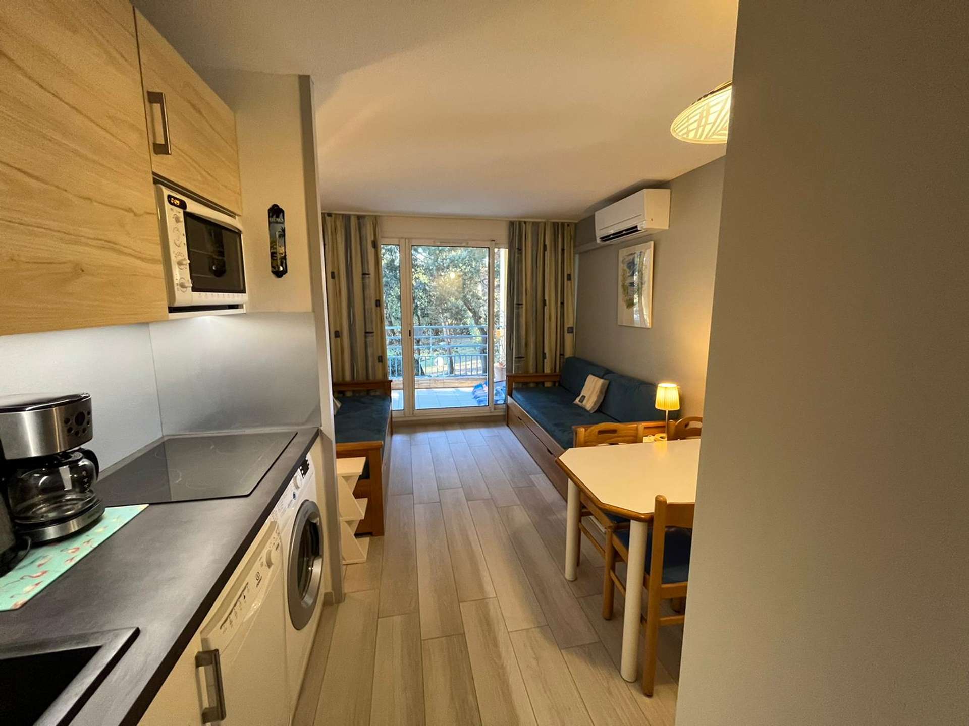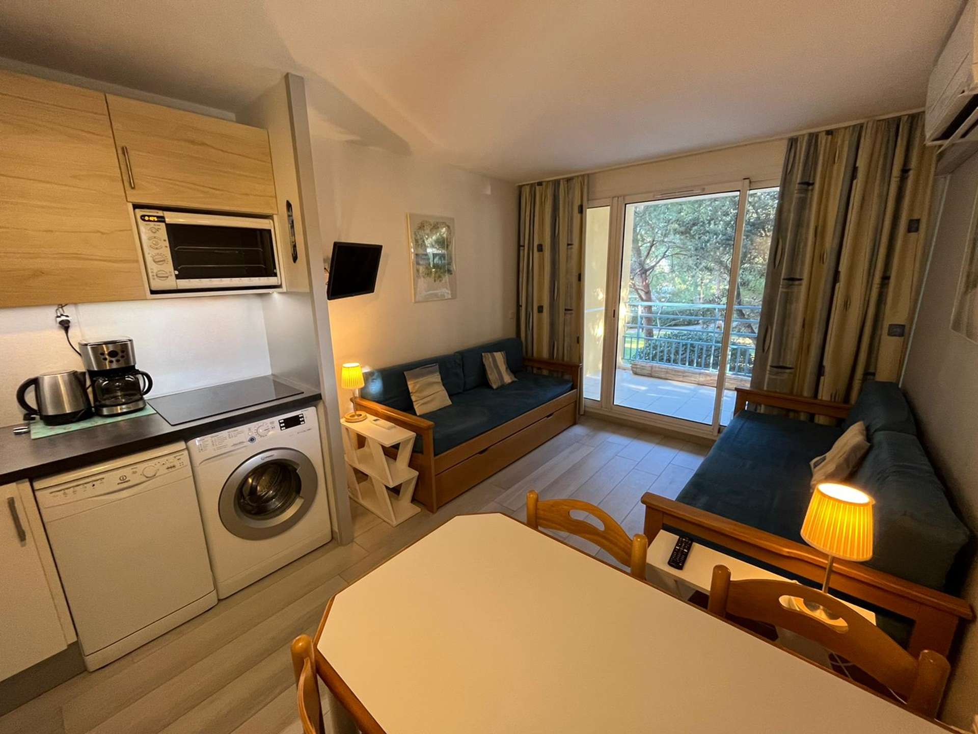 Un séjour avec une kitchenette, une chambre, une salle d'eau et un WC indépendant, terrasse exposée est.