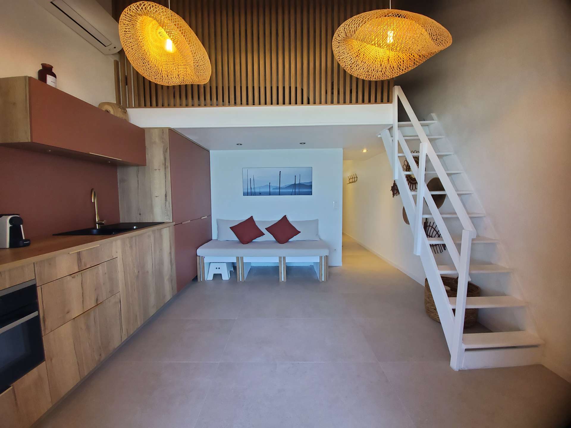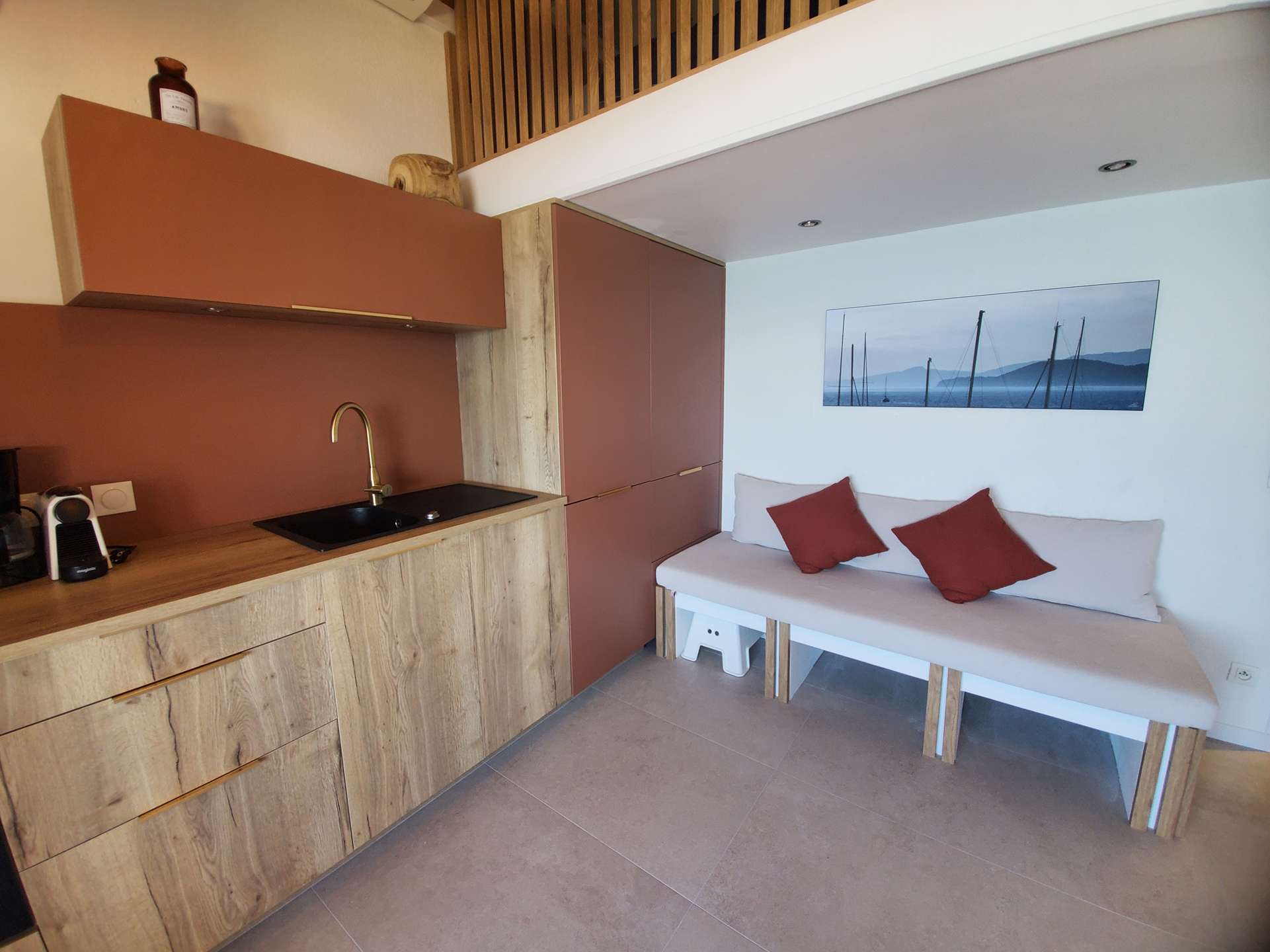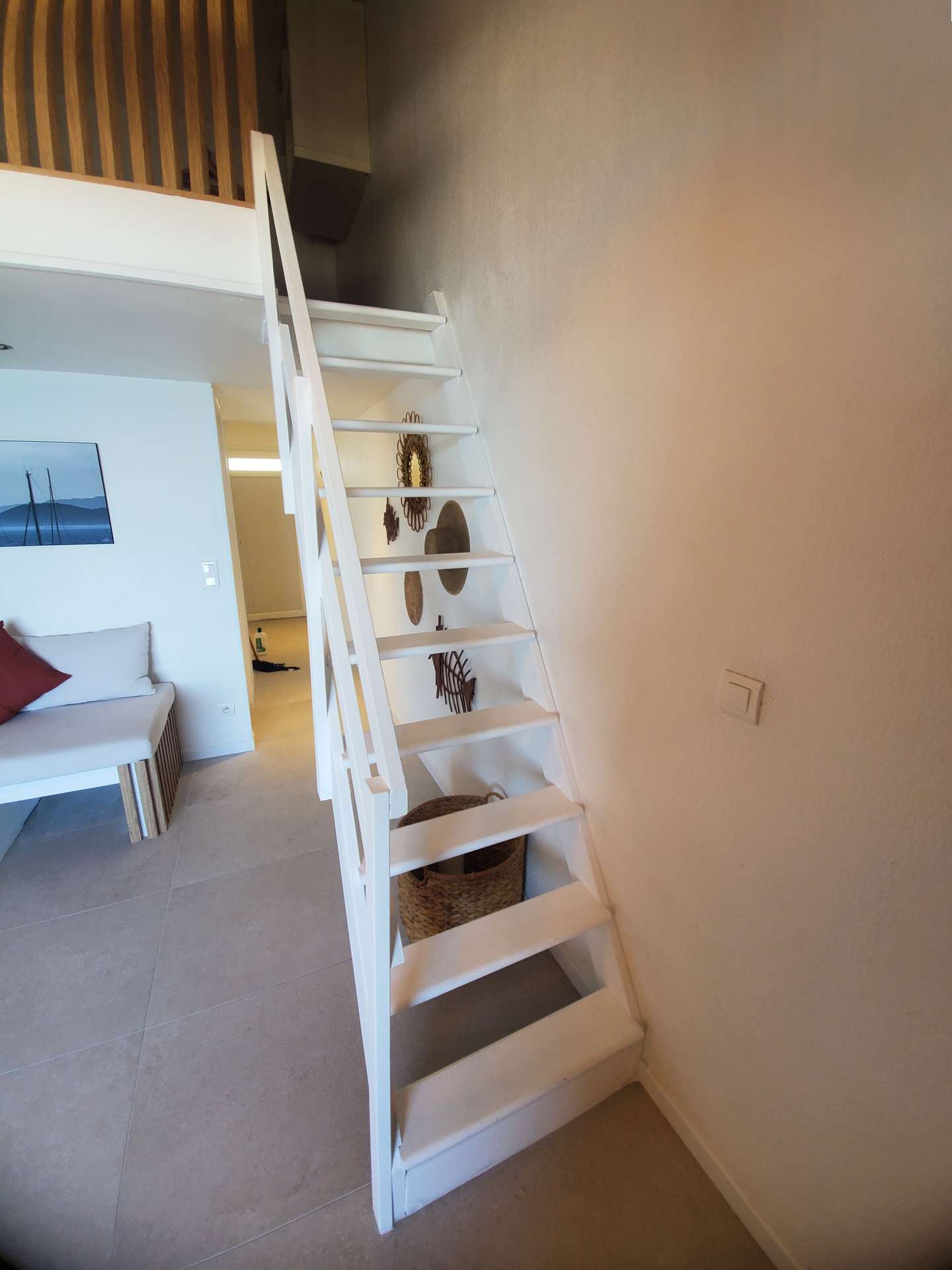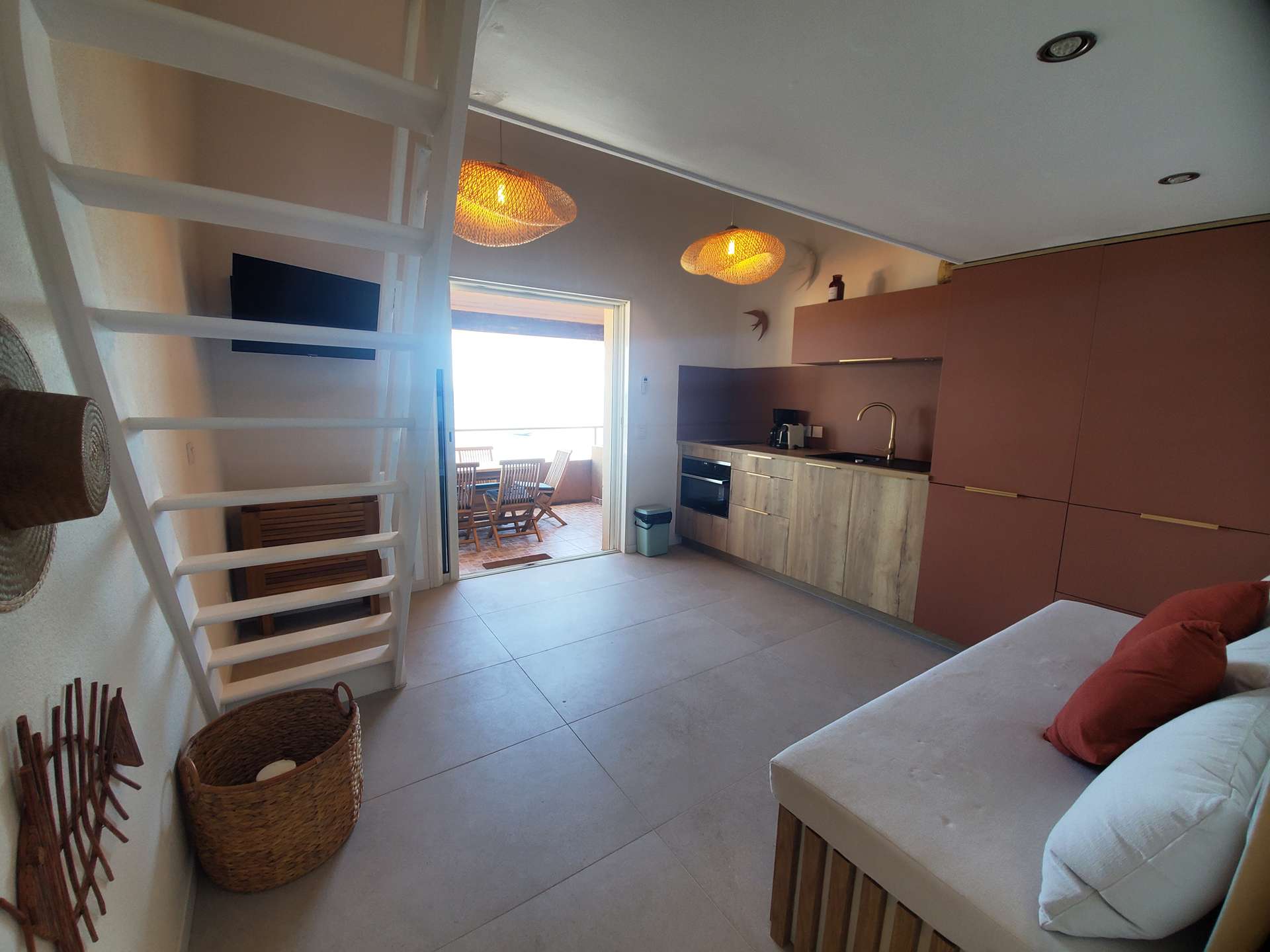 L'appartement dispose d'une chambre, d'un séjour/cuisine, une salle d'eau avec WC. Une mezzanine avec coin nuit, et d'une loggia avec vue mer !