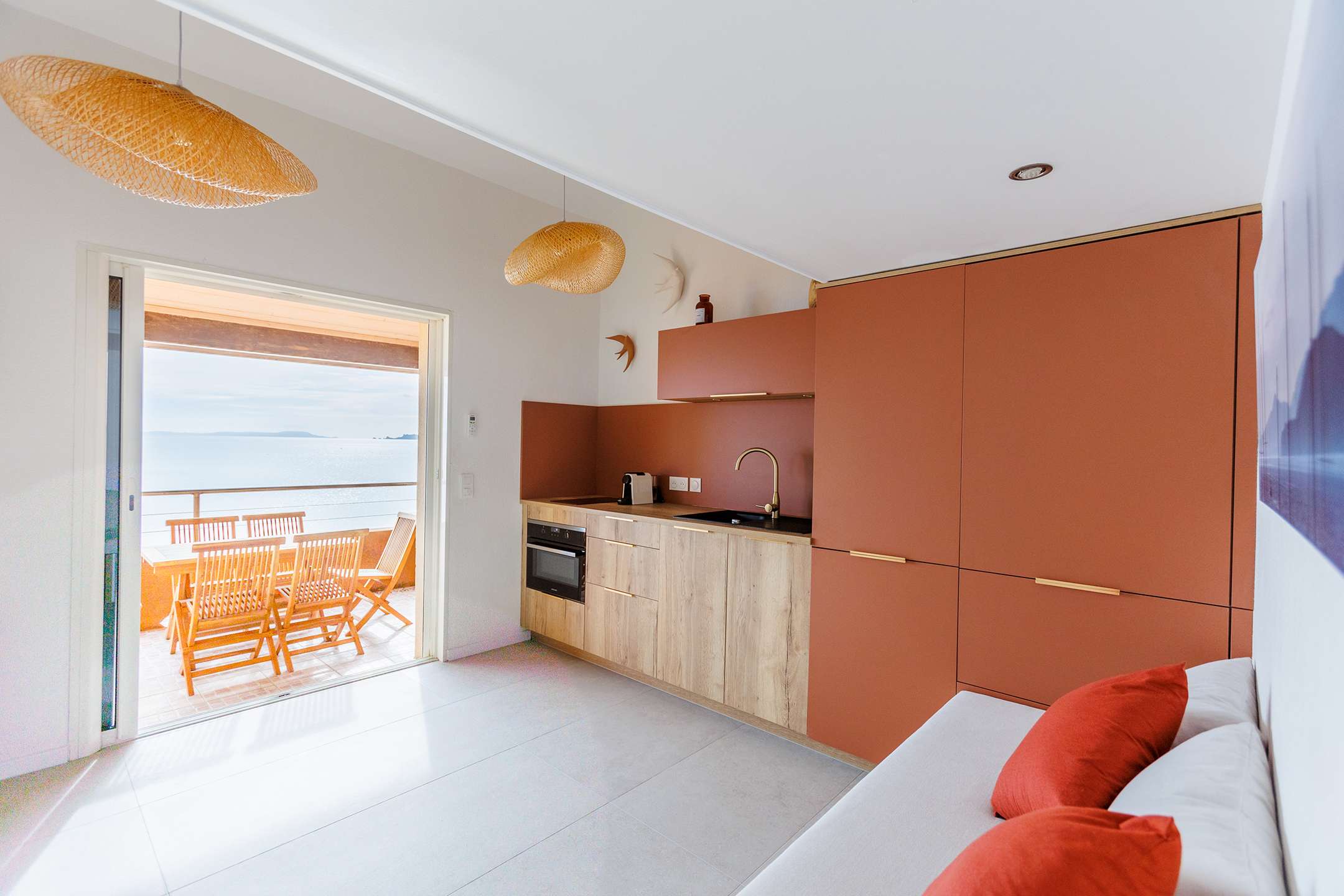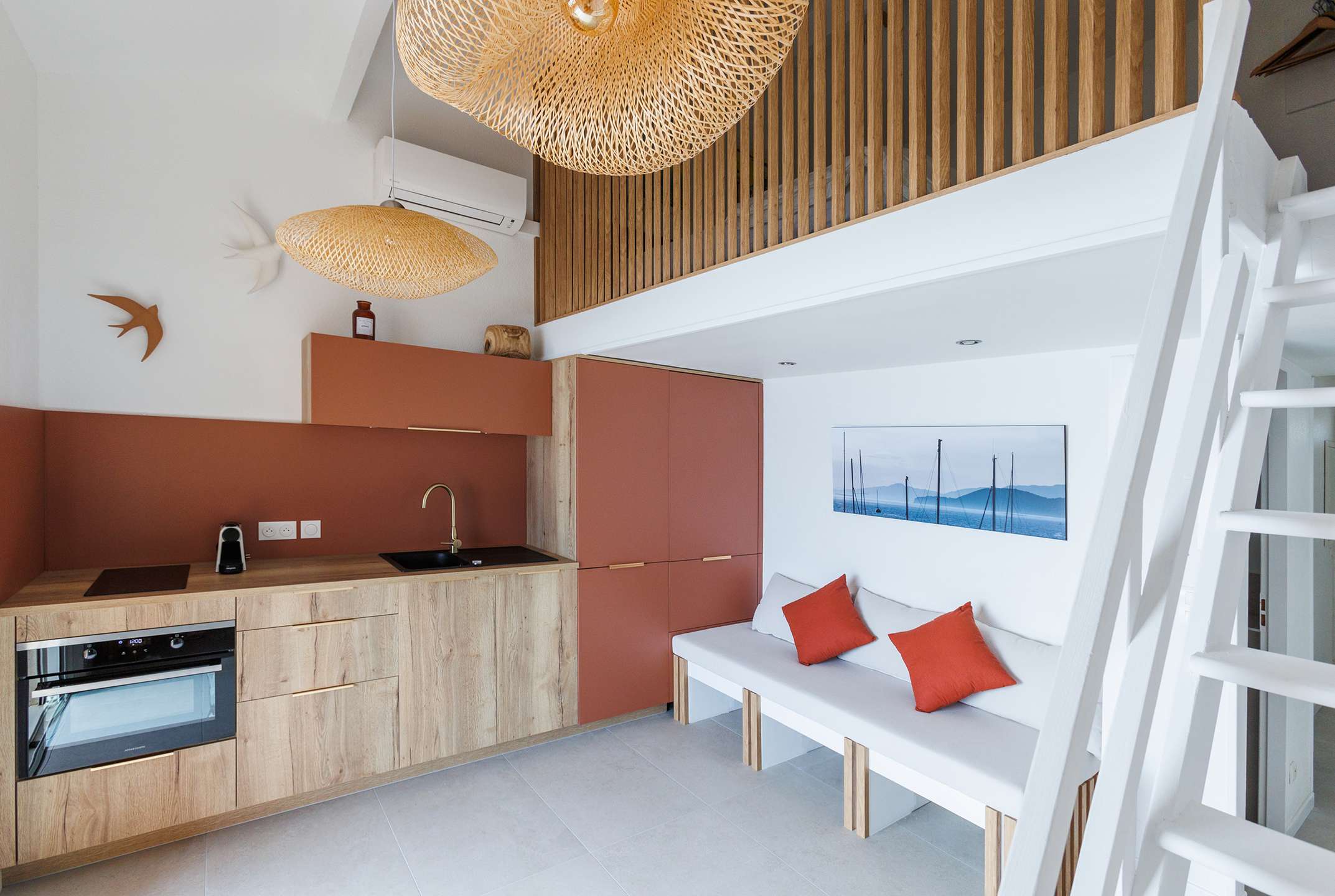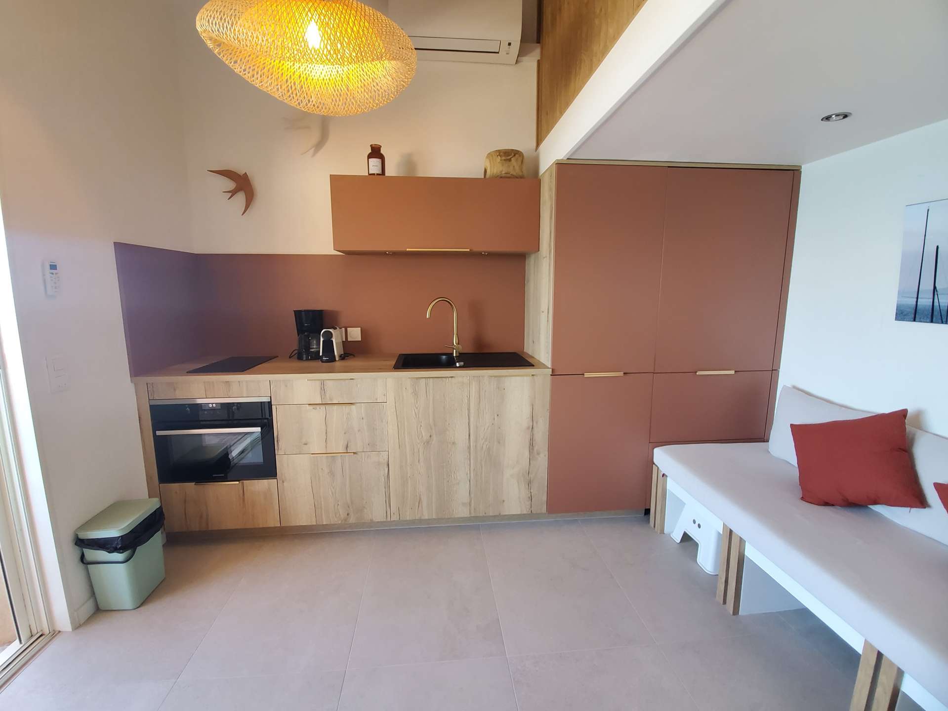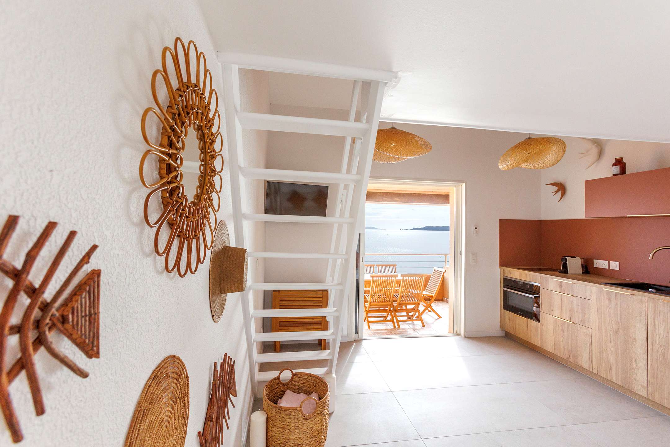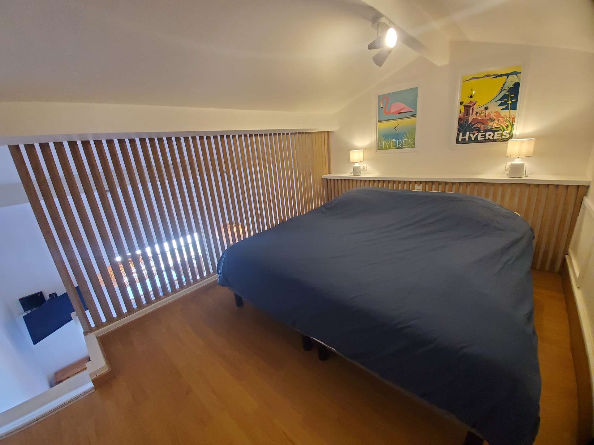 L'appartement dispose d'une chambre, d'un séjour/cuisine, une salle d'eau avec WC. Une mezzanine avec coin nuit, et d'une loggia avec vue mer !