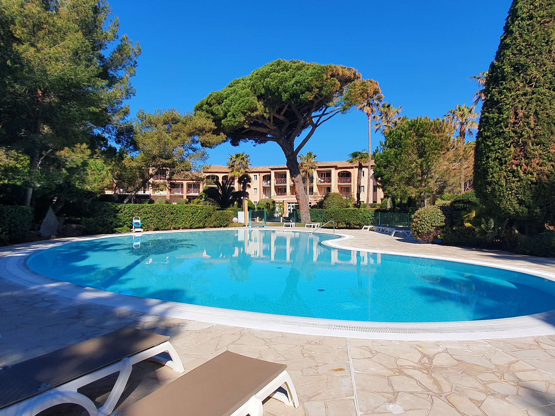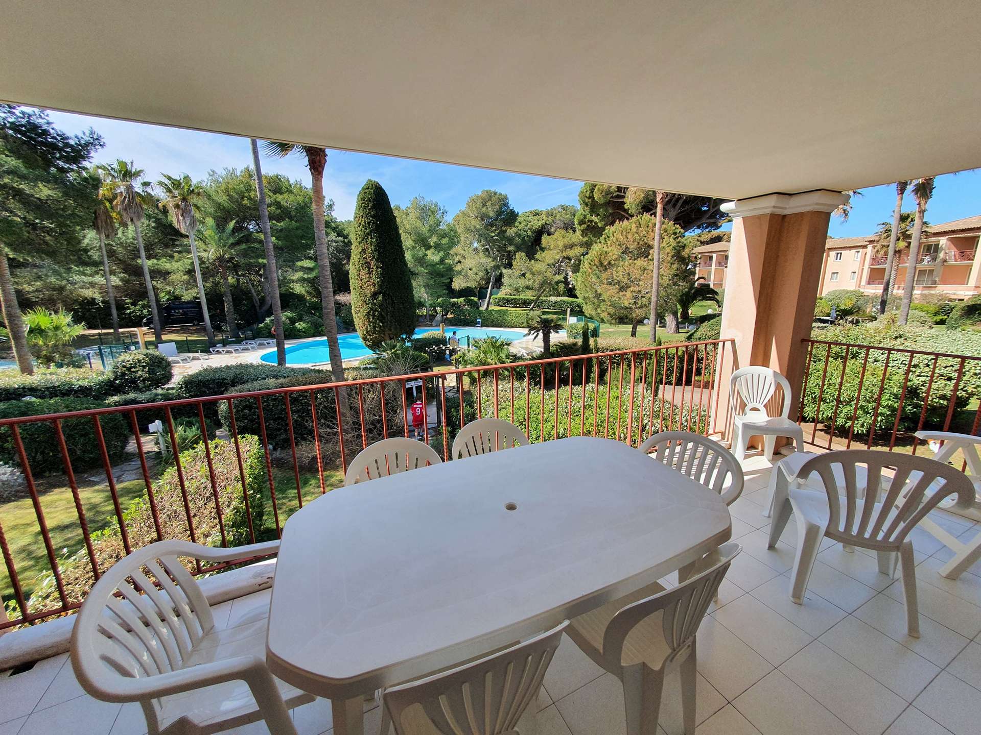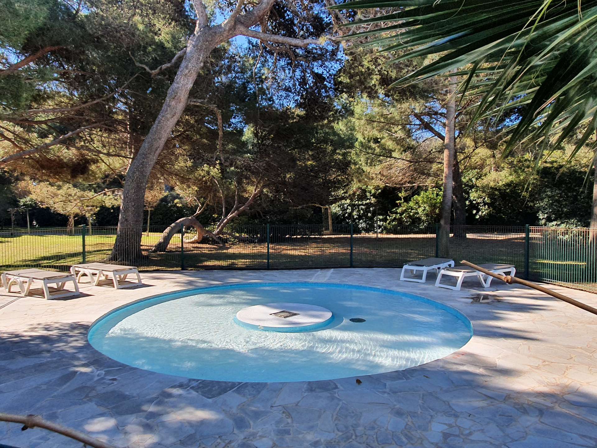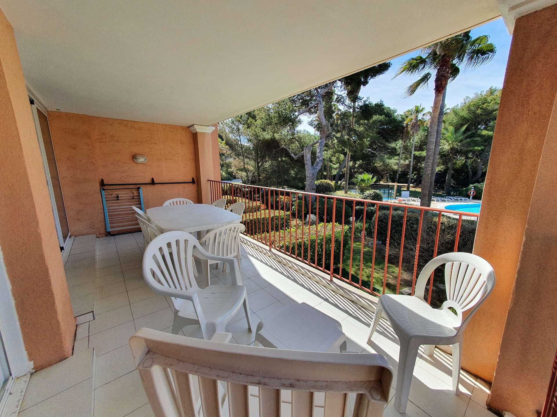 Résidence de la Pinède : Appartement T3 climatisé pour 6 personnes au premier étage dans une résidence les pieds dans l'eau, accès direct et privé à la plage de la Badine sur la Presqu'île de Giens. Résidence avec piscine, aires de jeux et restaurant d'été. Laverie à pièces et parking. Wifi (payant) & Climatisation.