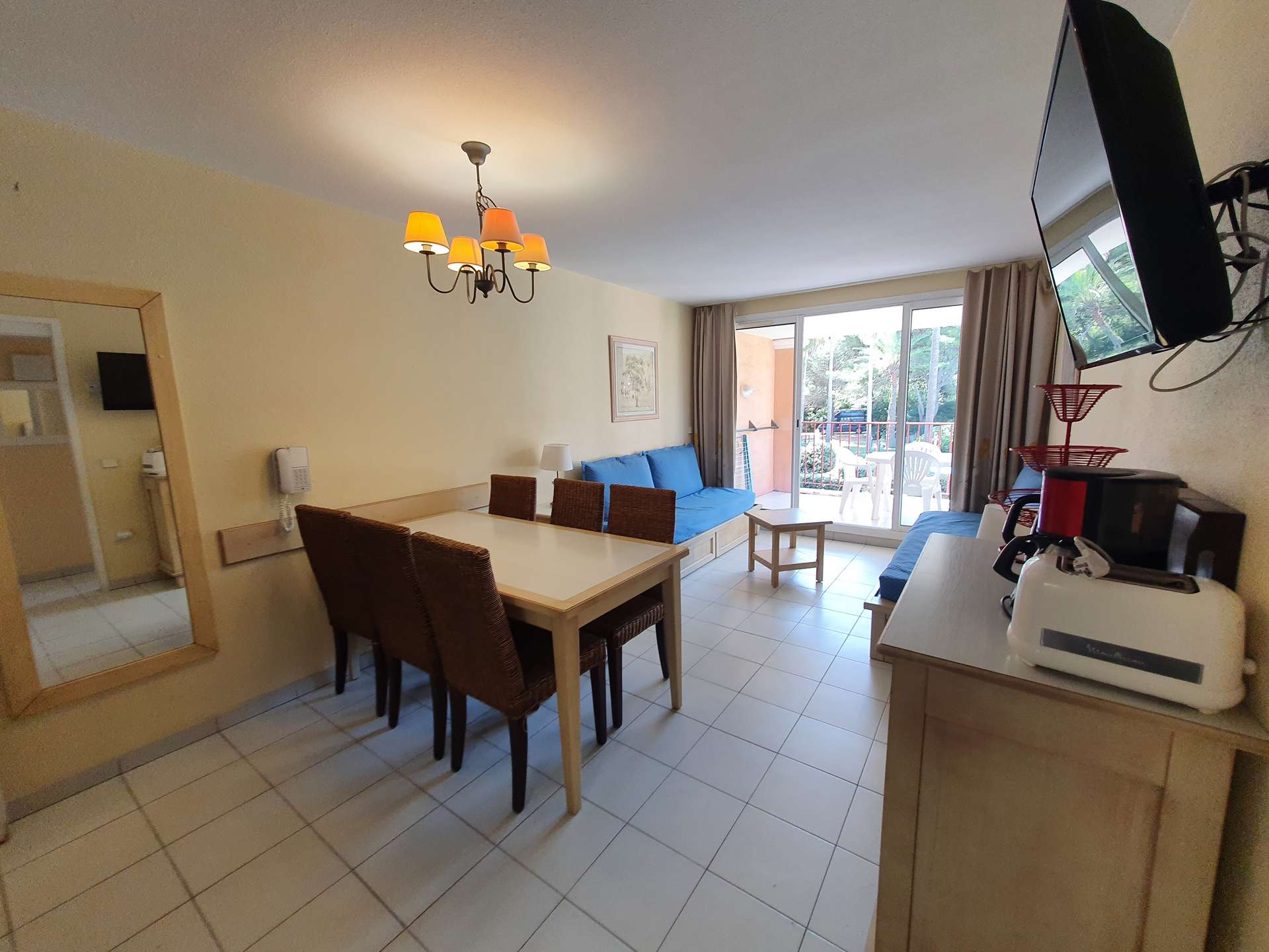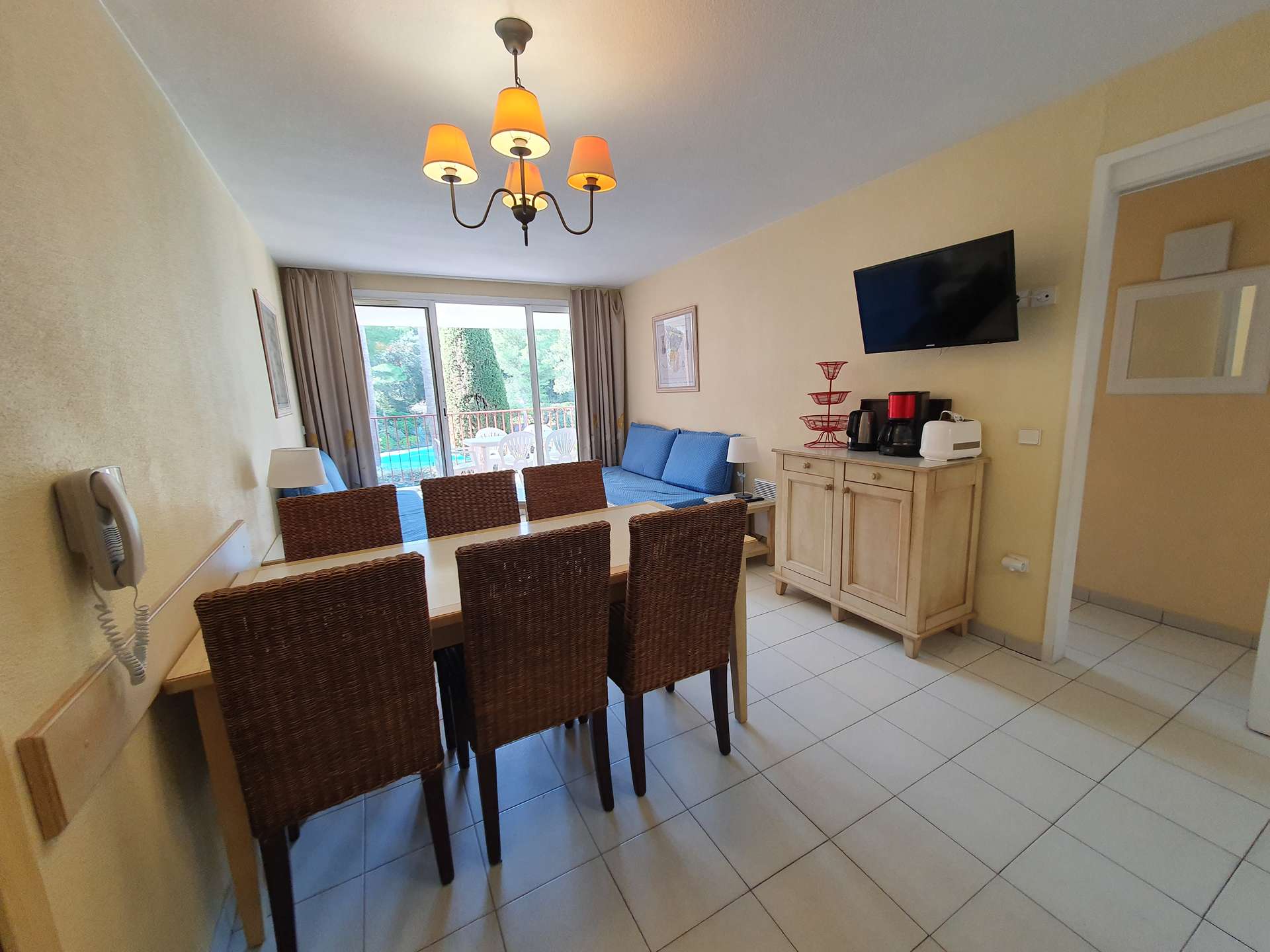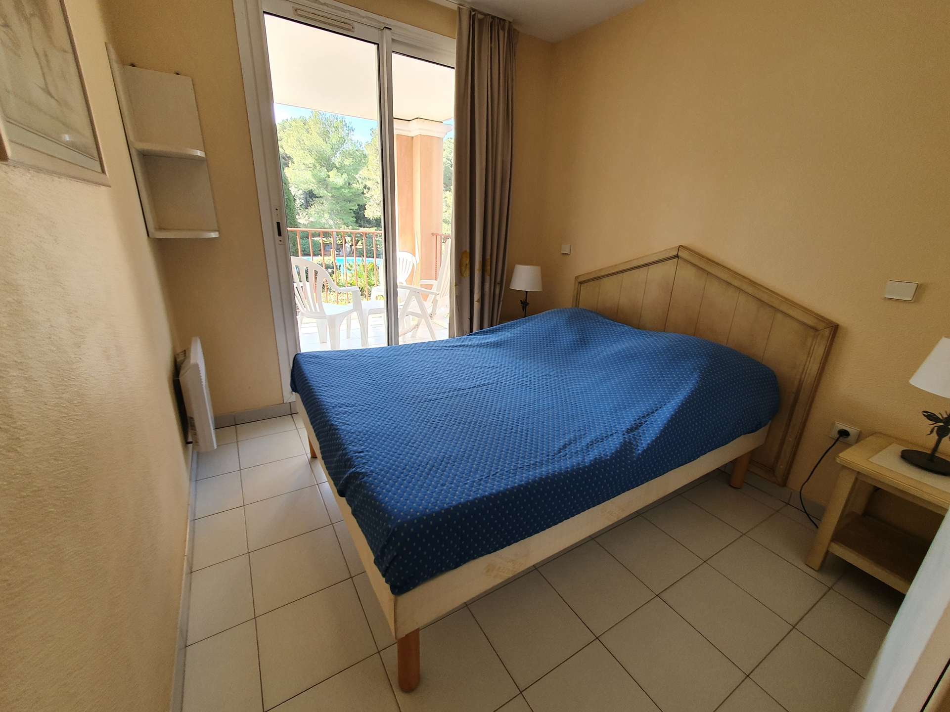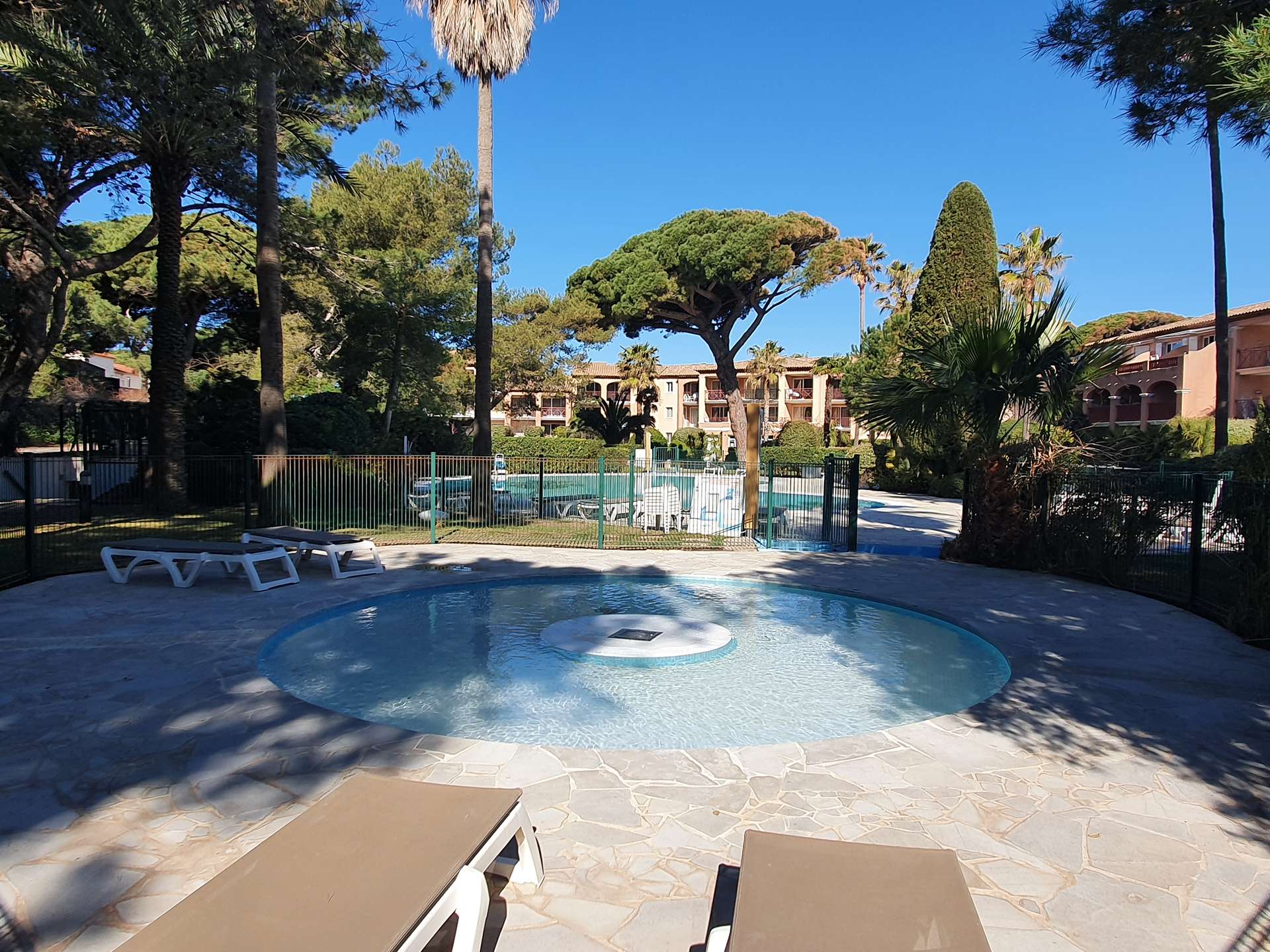 Résidence de la Pinède : Appartement T3 climatisé pour 6 personnes au premier étage dans une résidence les pieds dans l'eau, accès direct et privé à la plage de la Badine sur la Presqu'île de Giens. Résidence avec piscine, aires de jeux et restaurant d'été. Laverie à pièces et parking. Wifi (payant) & Climatisation.