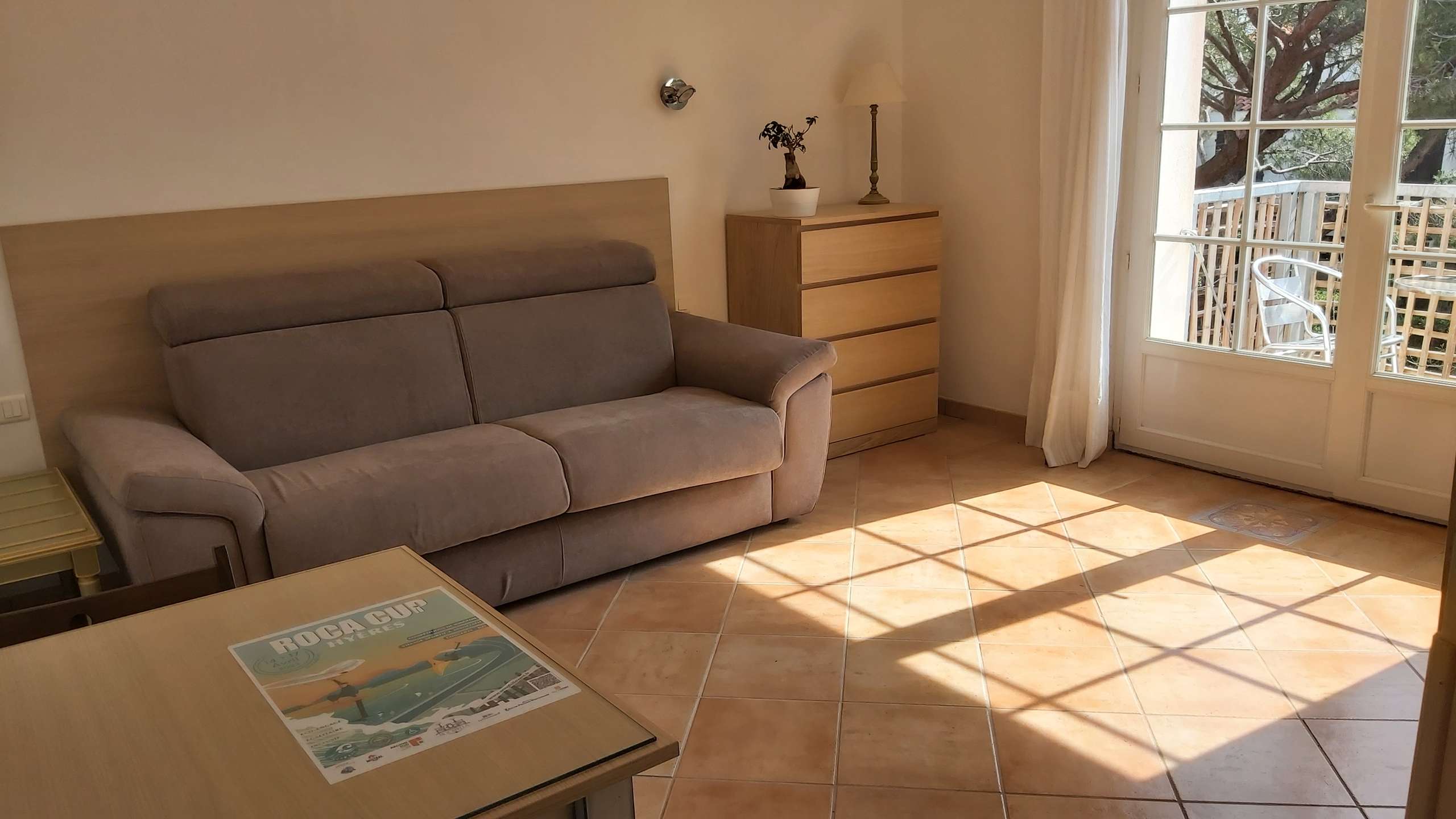 Séjour avec coin nuit et kitchenette, une salle d'eau, un WC indépendant et un balcon donnant sur la pinède de la Capte.