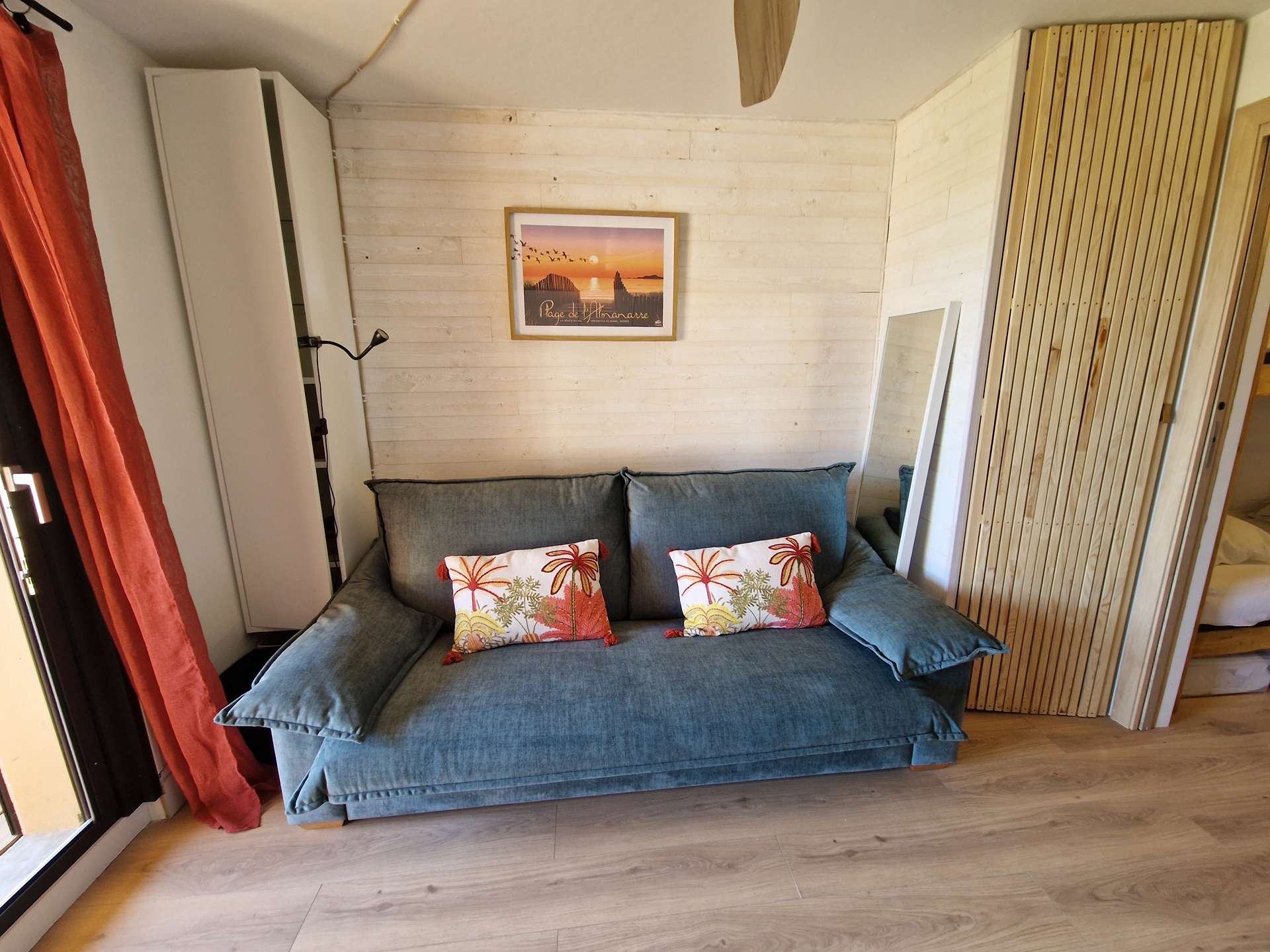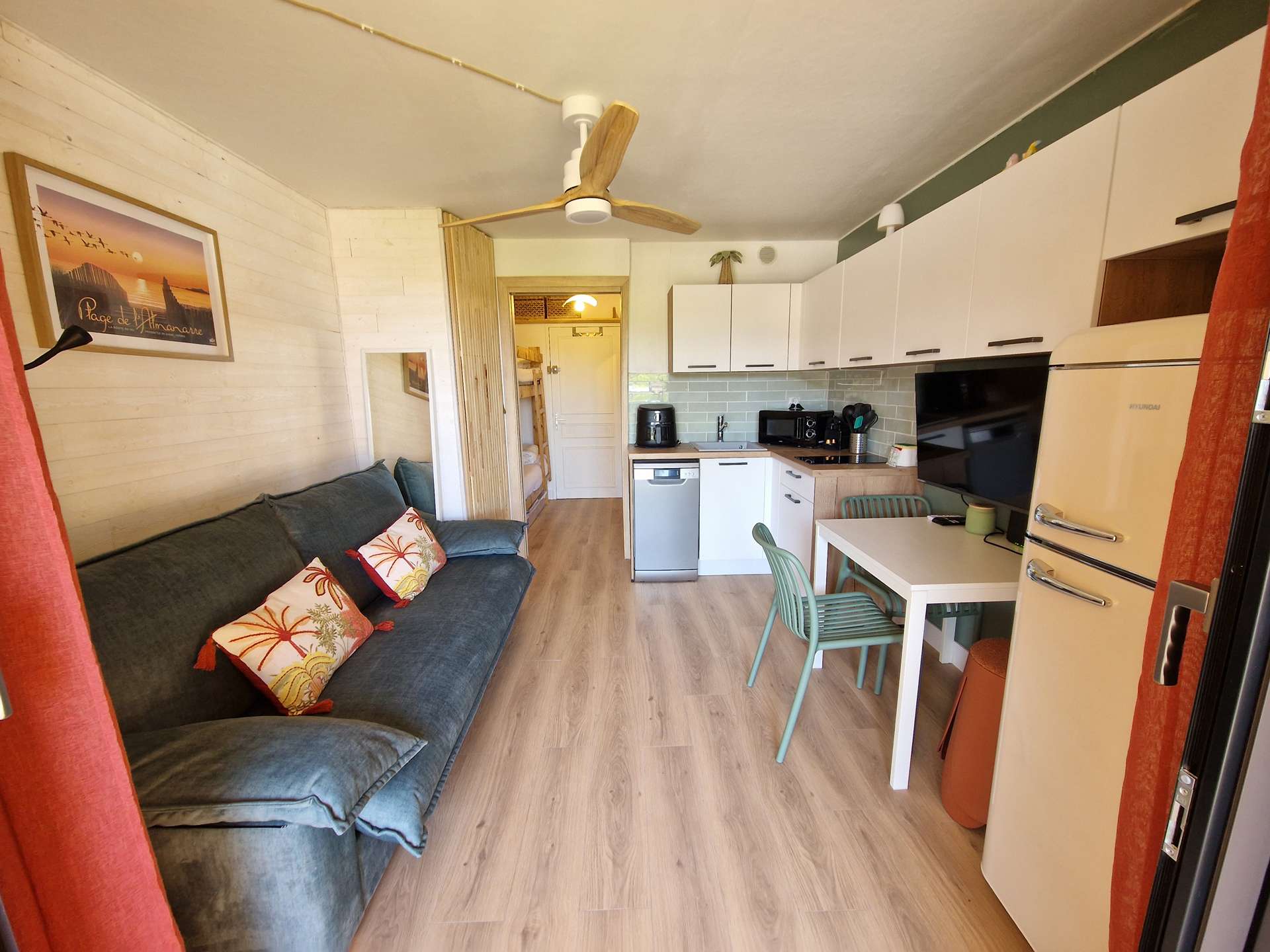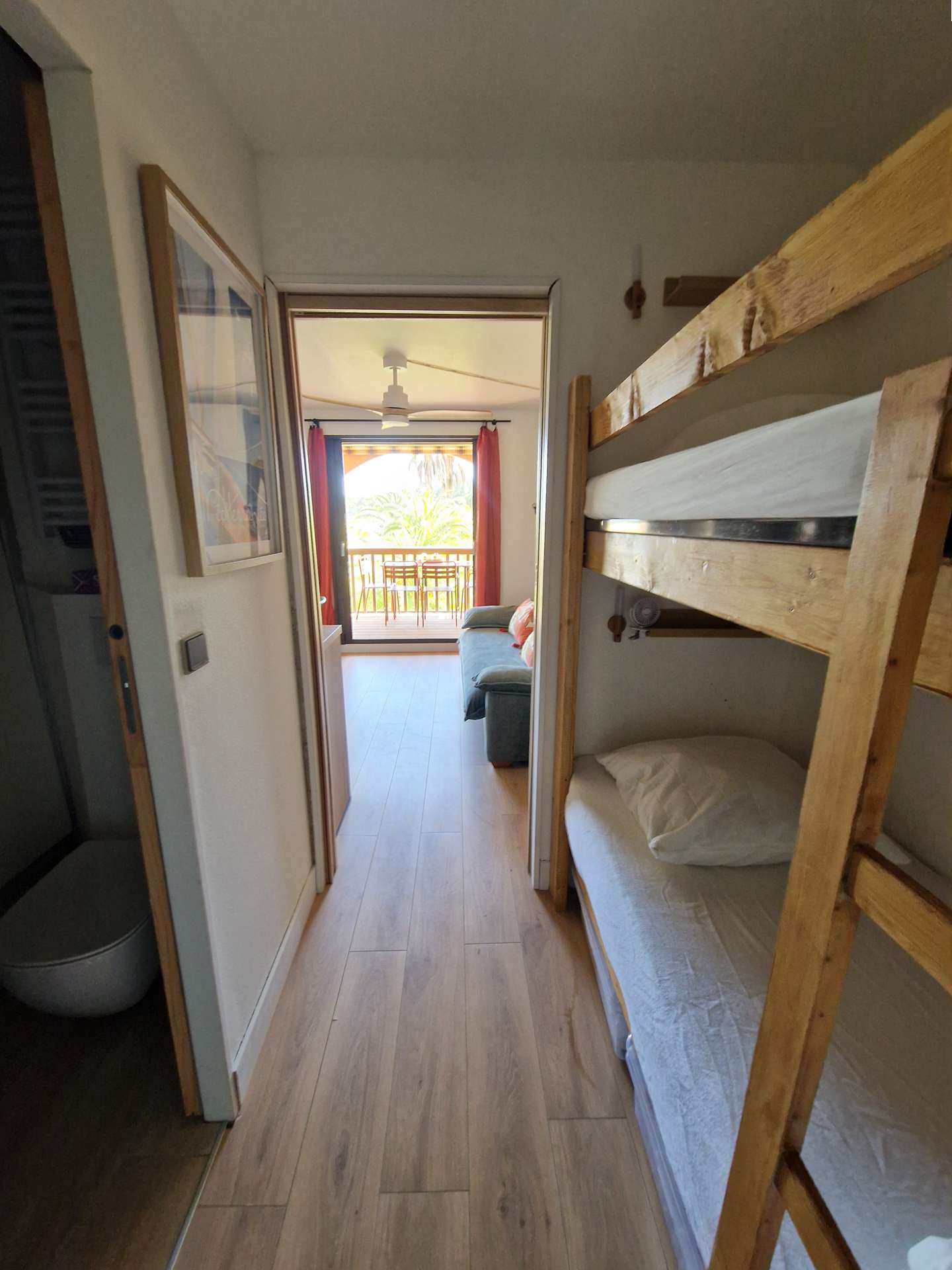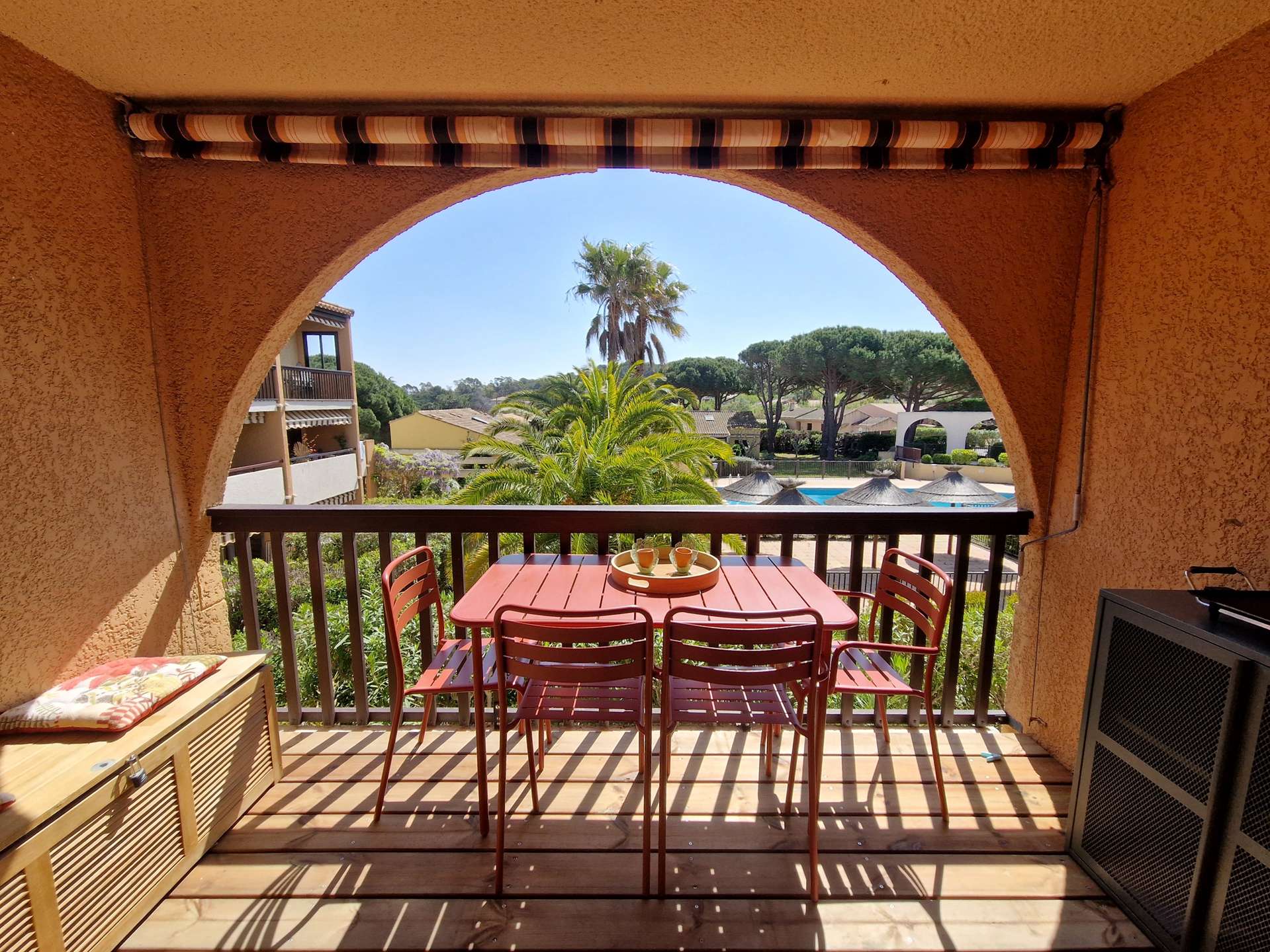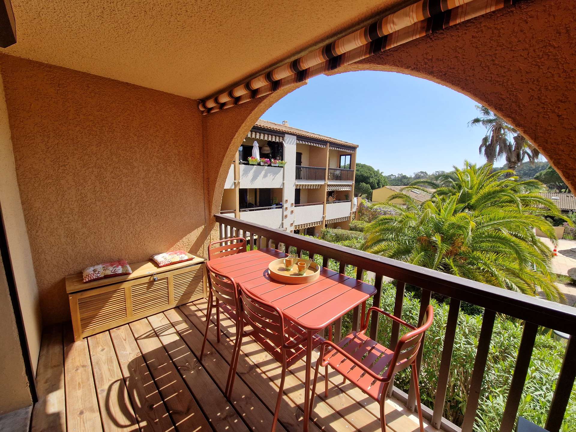 Studio cabine rénové pour 4 personnes au 1er étage dans une résidence avec piscine à 5 mn du village de Giens sur la Presqu'île de Giens. Parking privé.