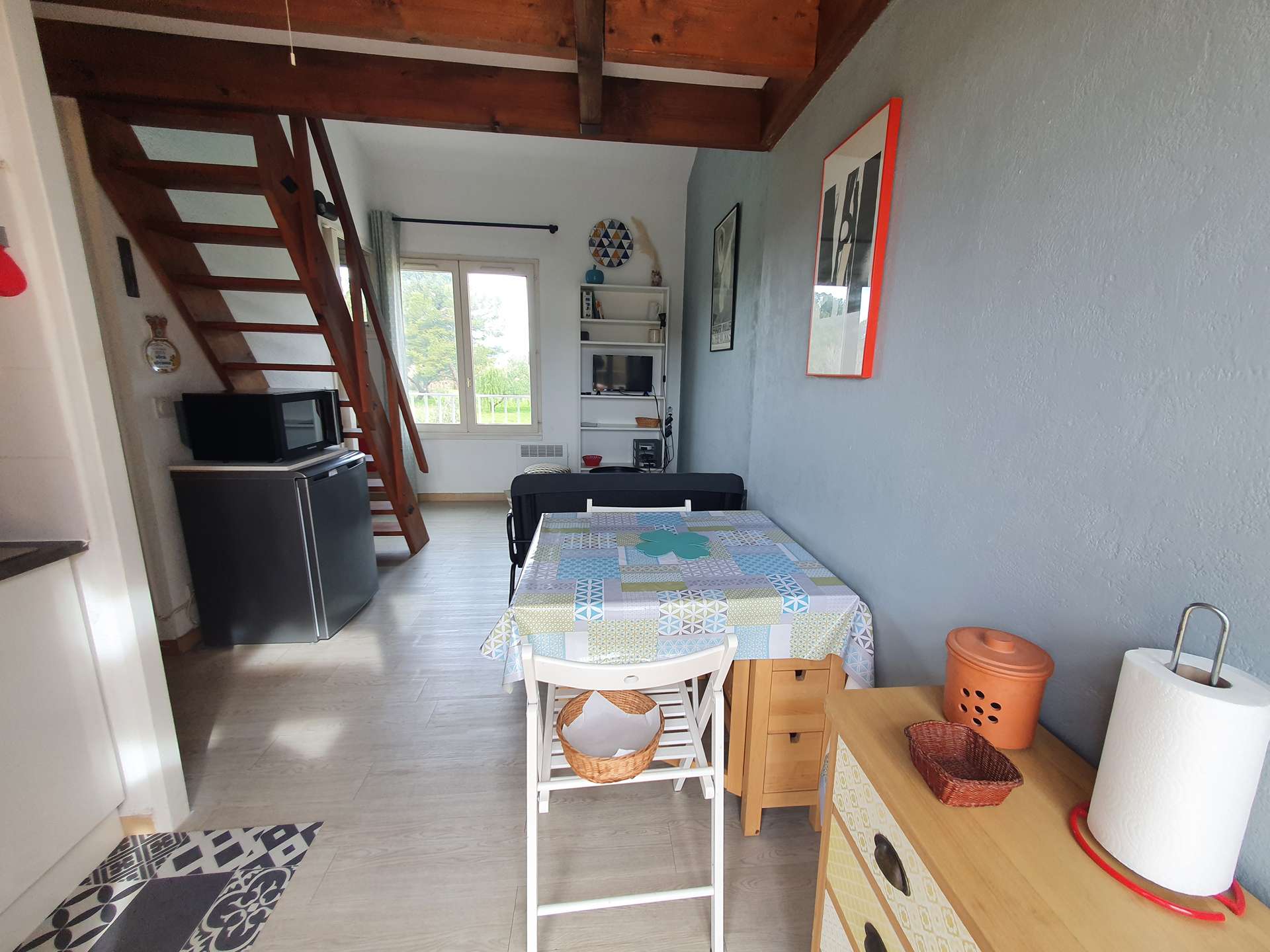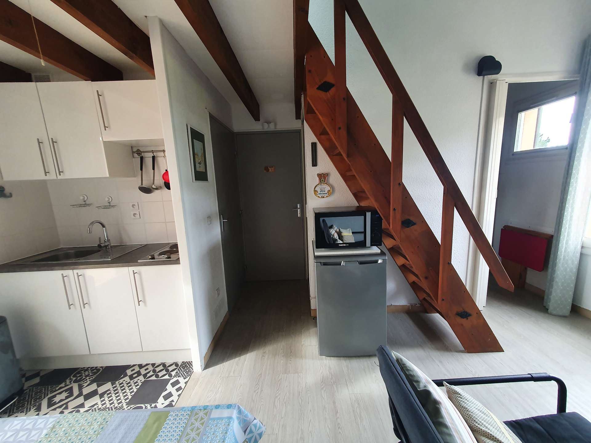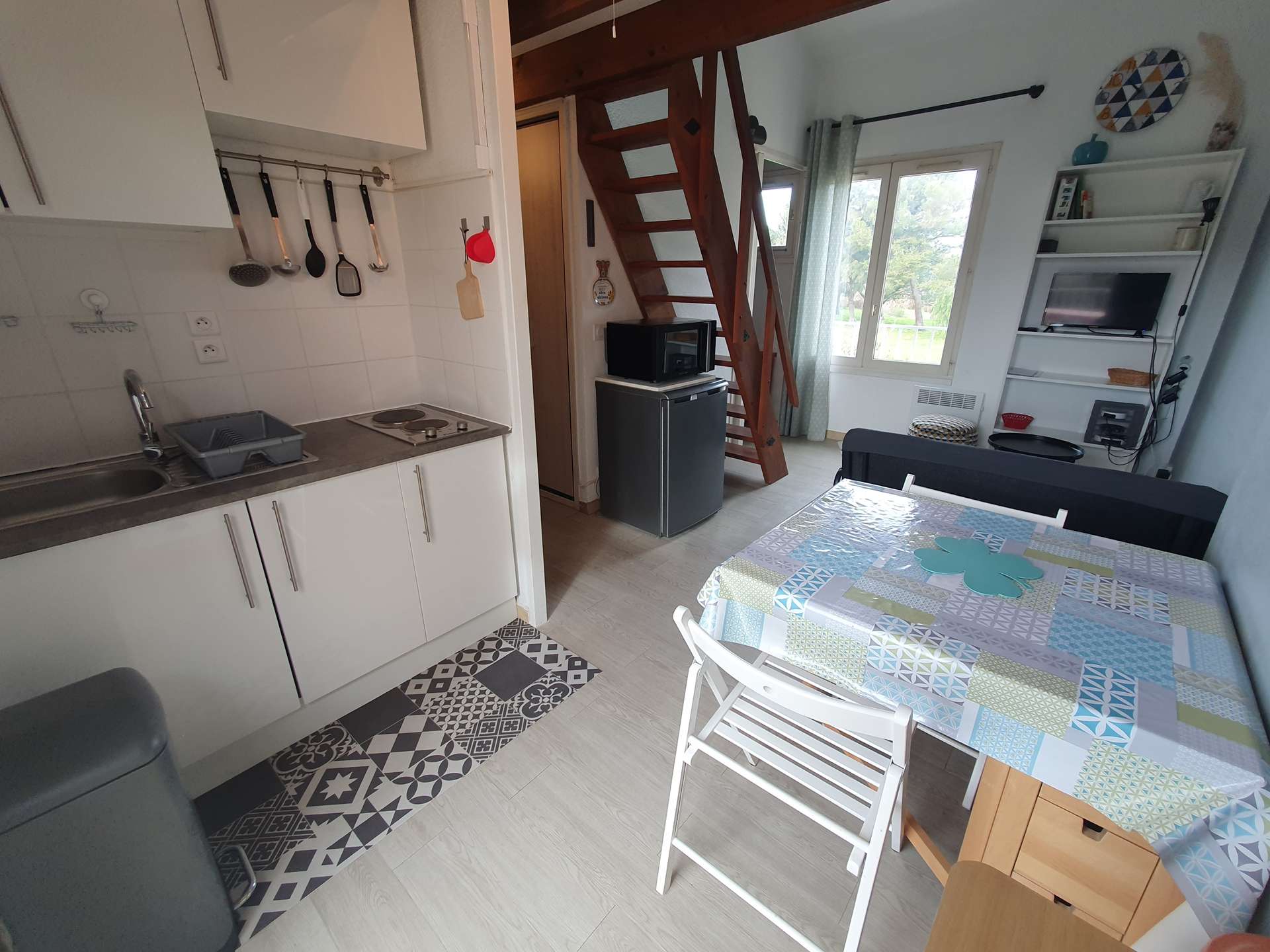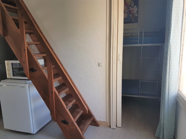 Un séjour avec une kitchenette, une chambre en mezzanine, une alcôve, une salle d'eau et un WC indépendant, une terrasse exposée sud.