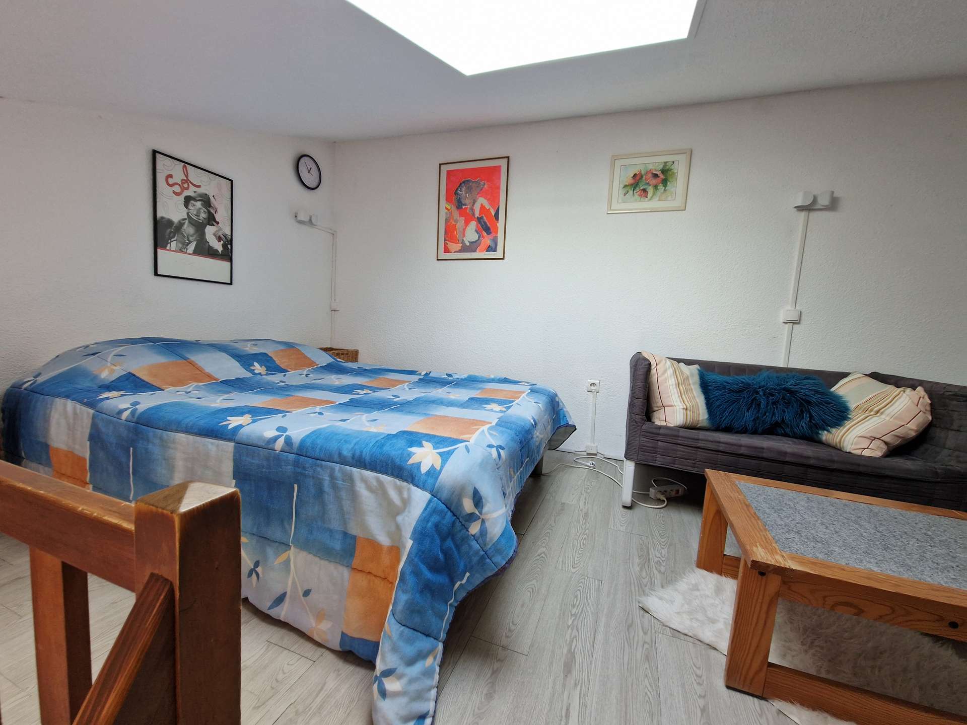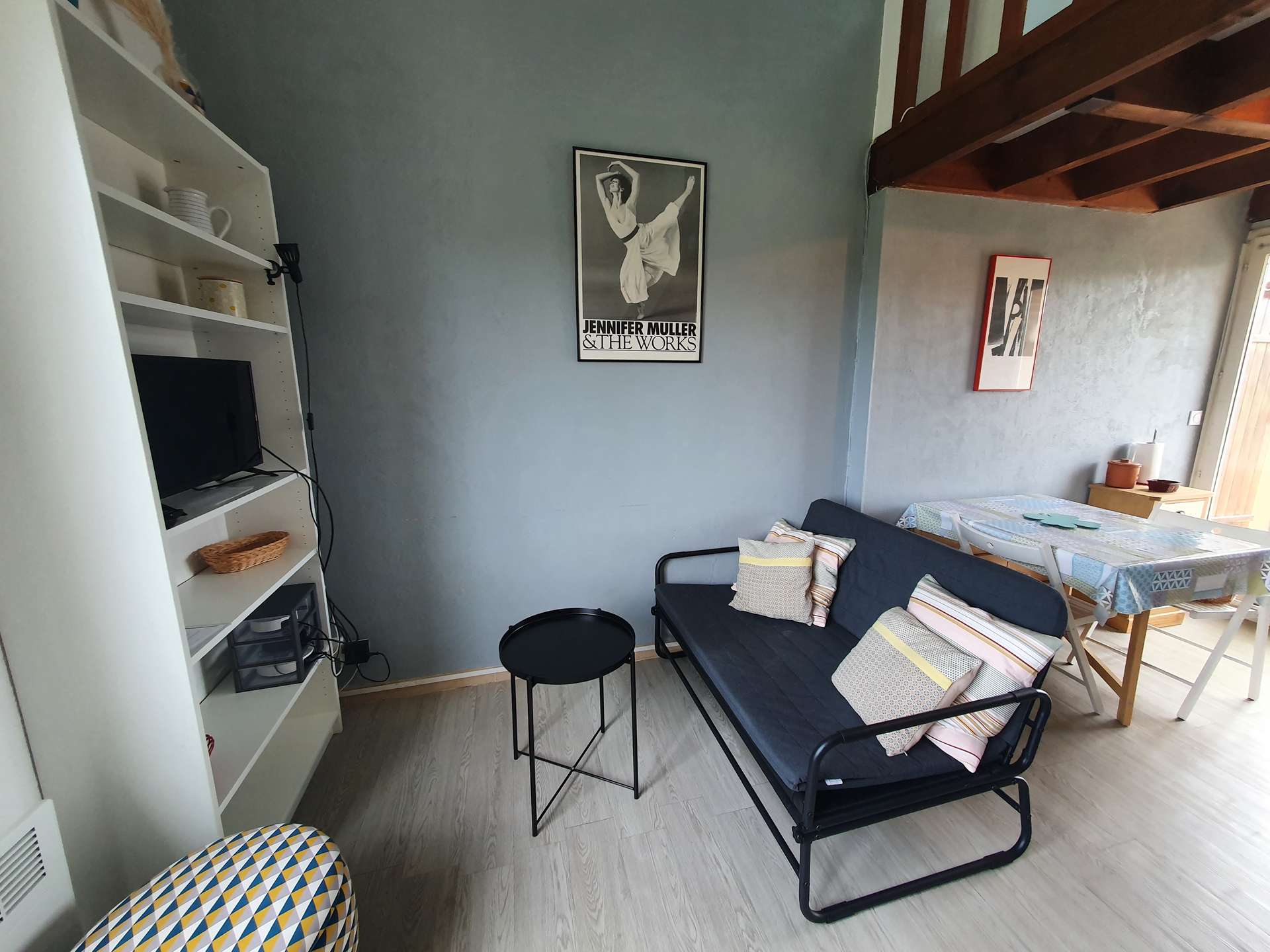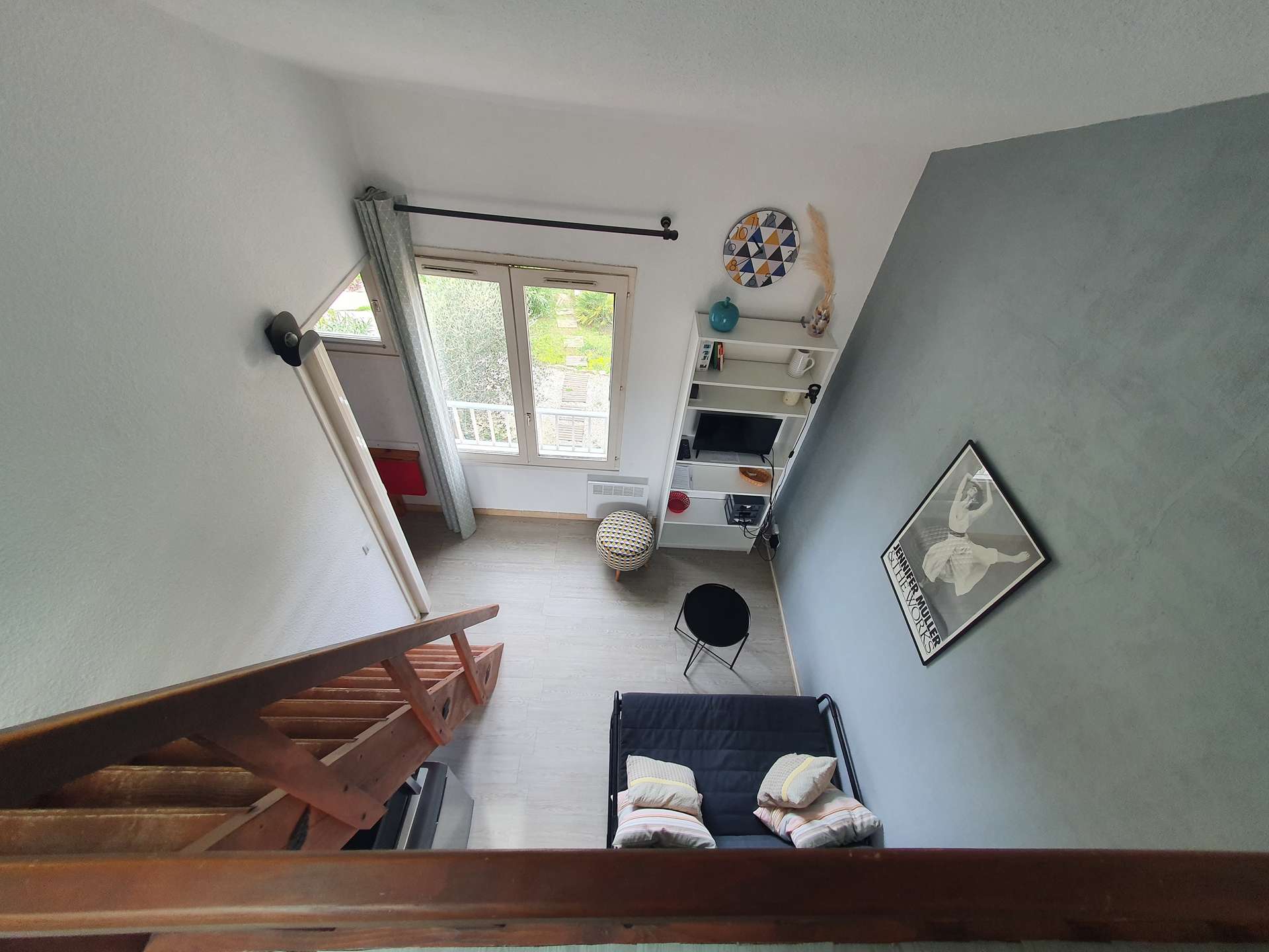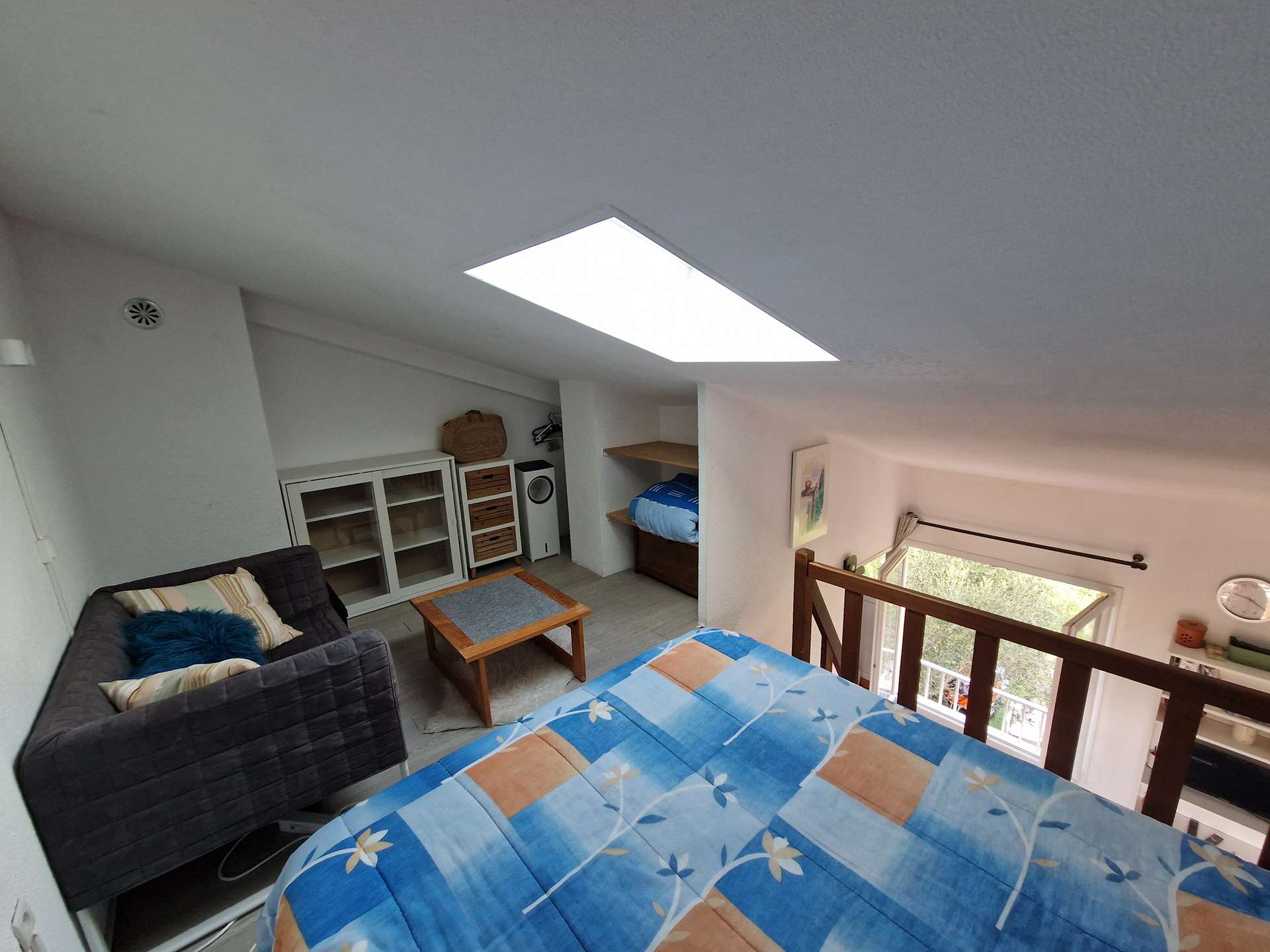 Un séjour avec une kitchenette, une chambre en mezzanine, une alcôve, une salle d'eau et un WC indépendant, une terrasse exposée sud.