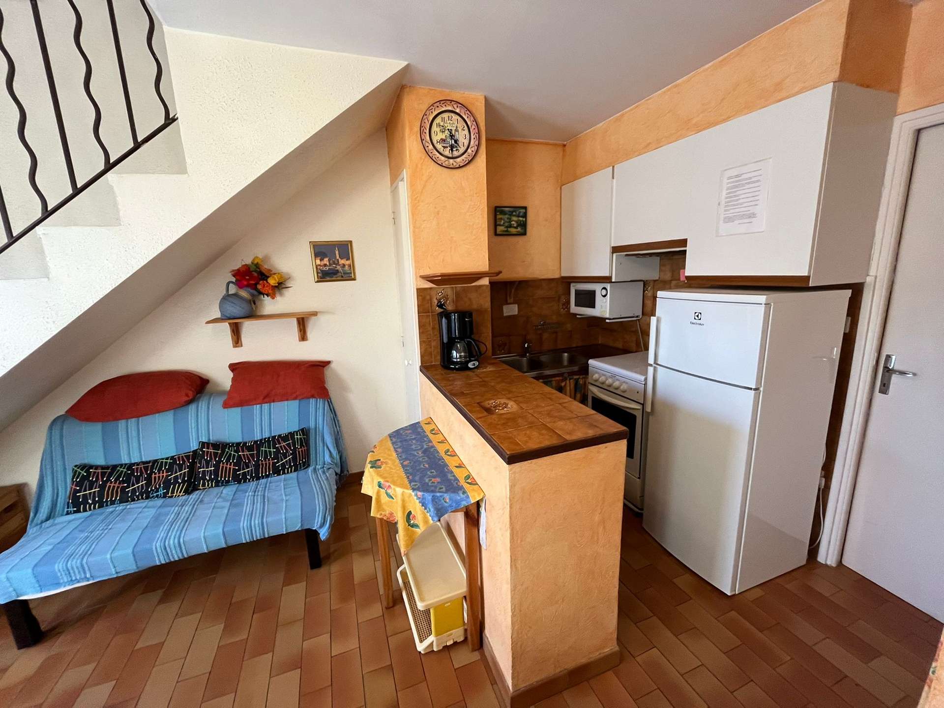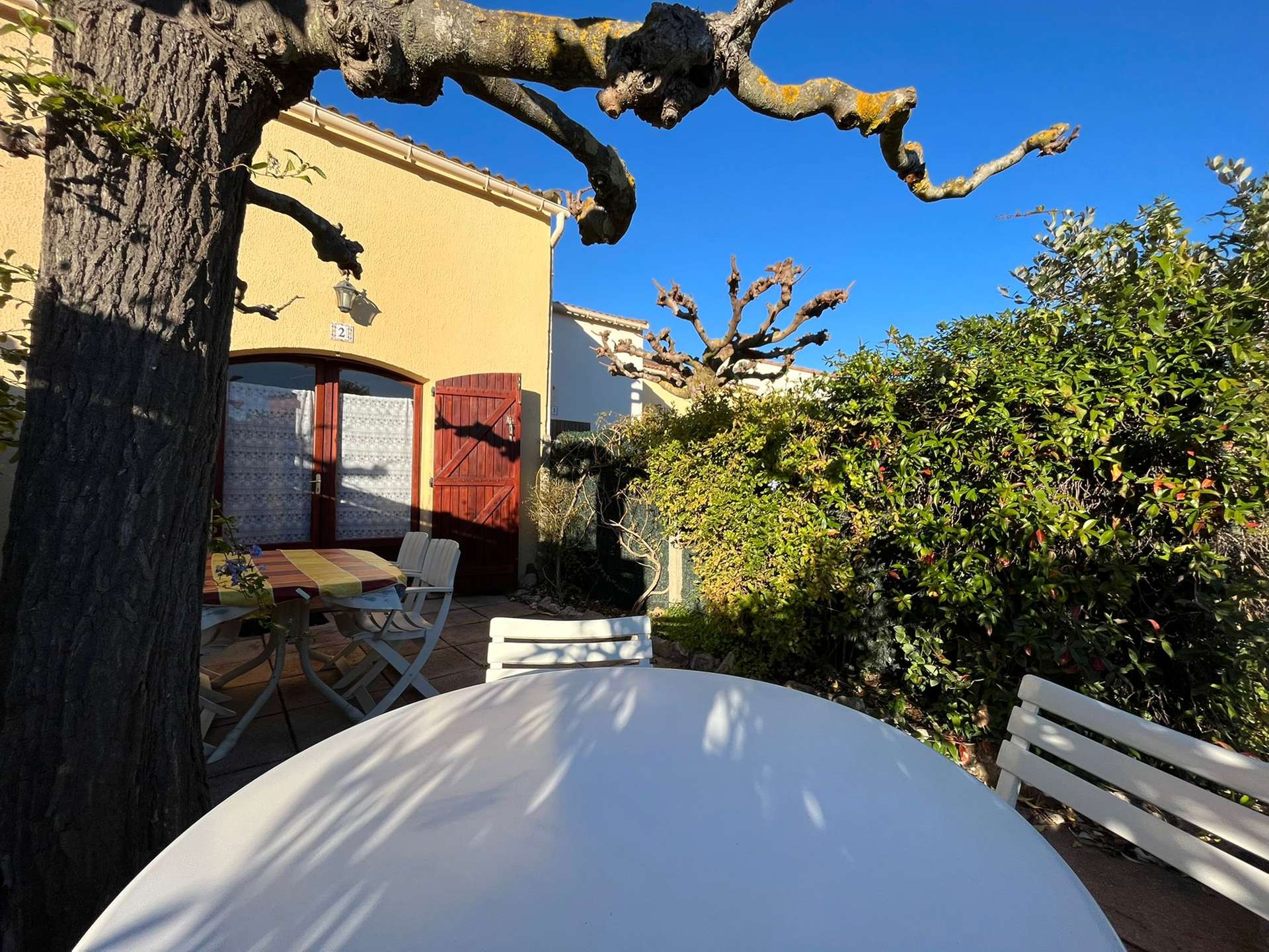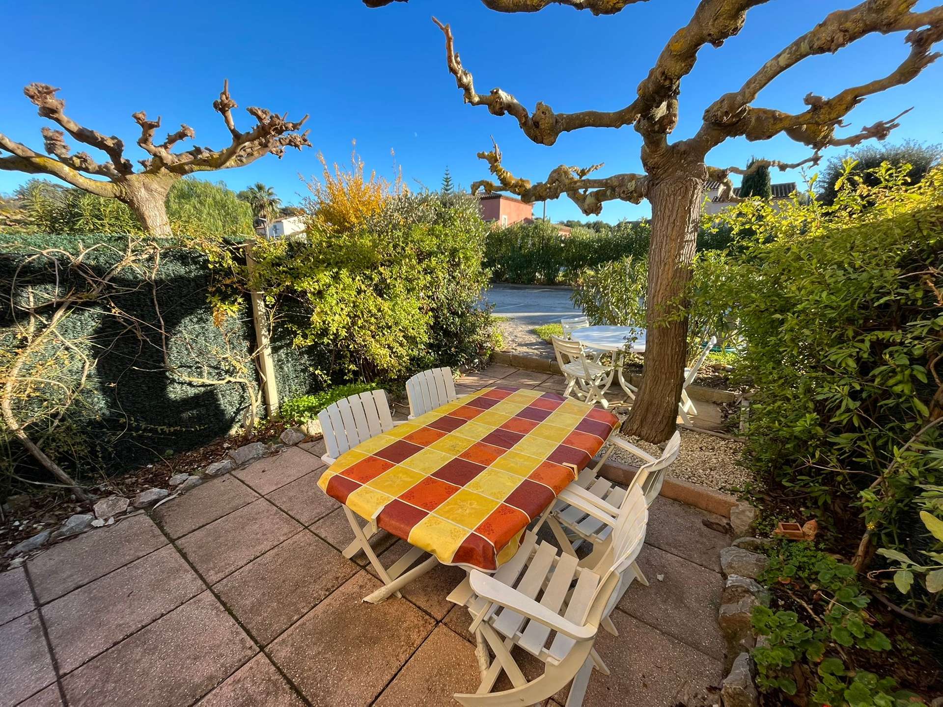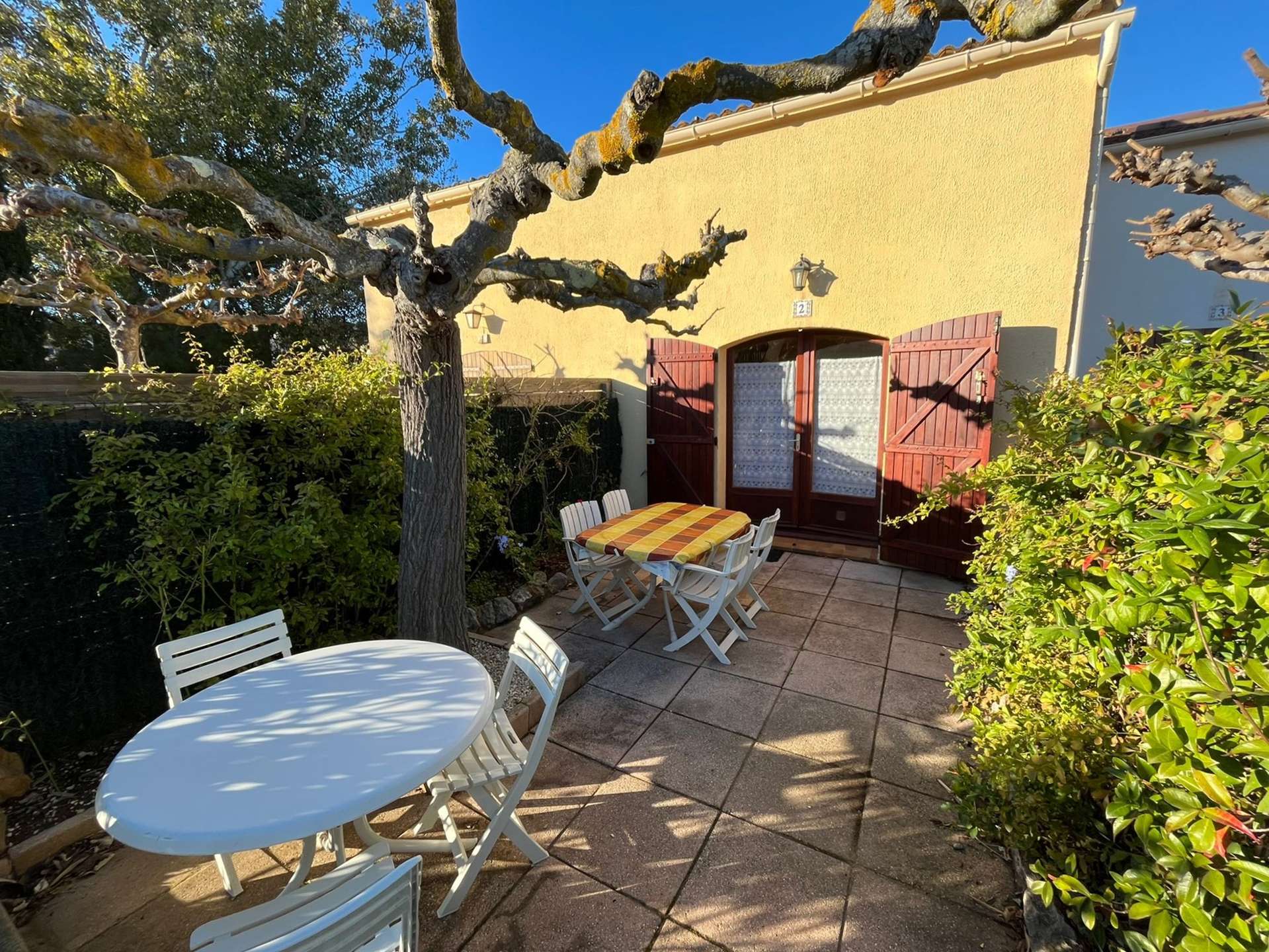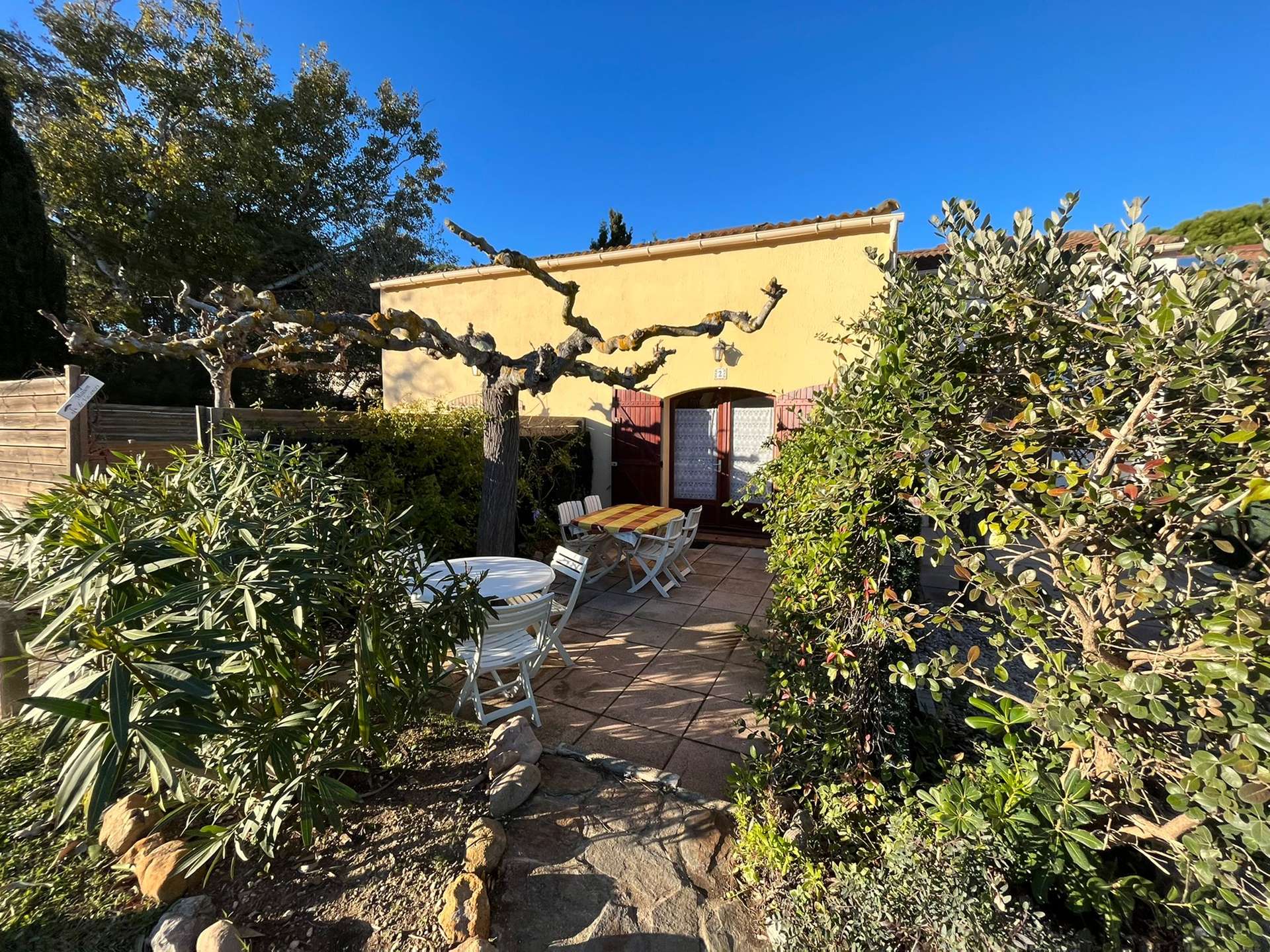 Maisonnette de type 2 + Mezzanine pour 5 personnes dans une petite résidence à 700 m de le plage de la Badine sur la Presqu'île de Giens. Commerces de proximité en saison estivale. Parking Privé. Climatisation.