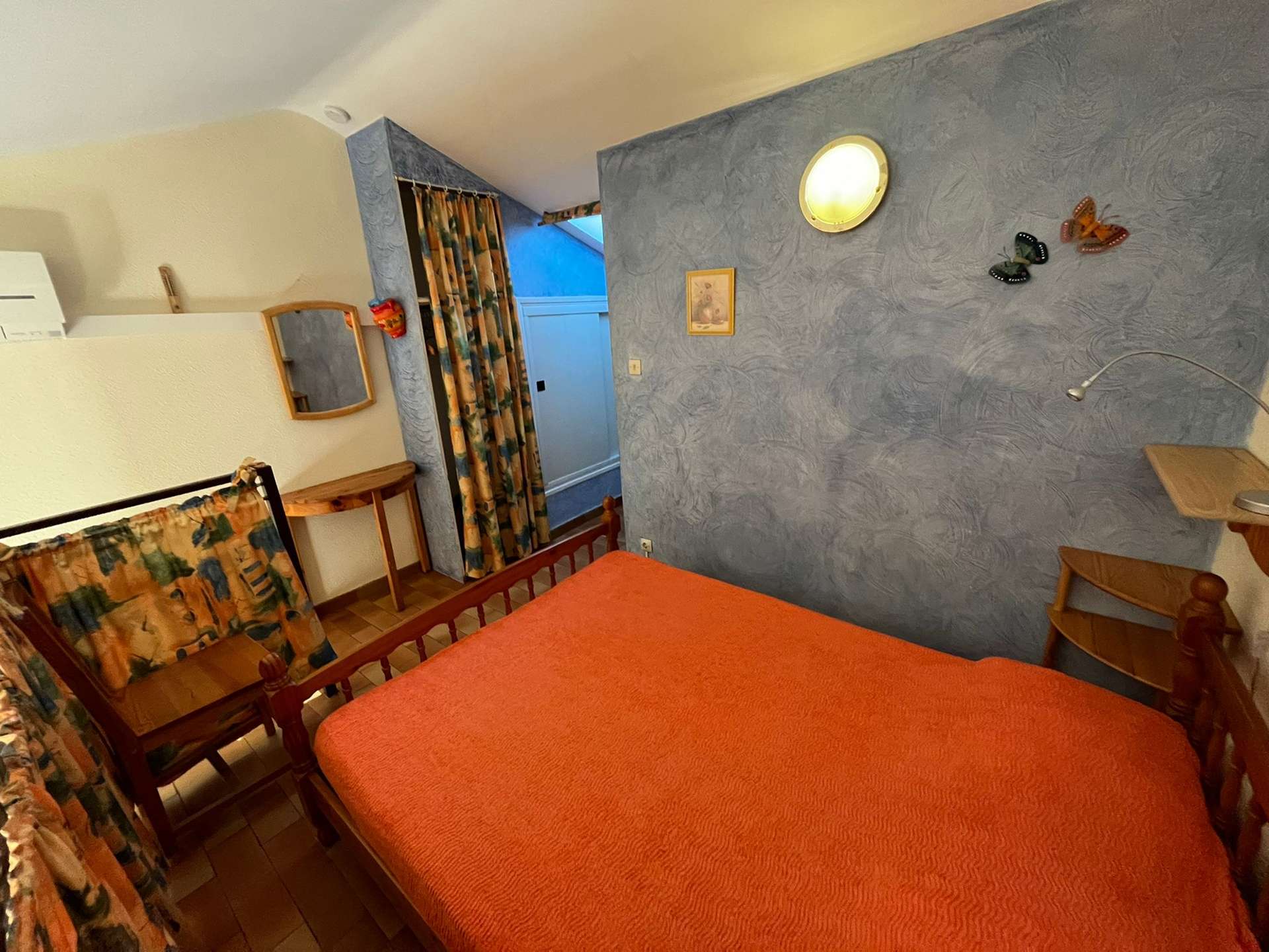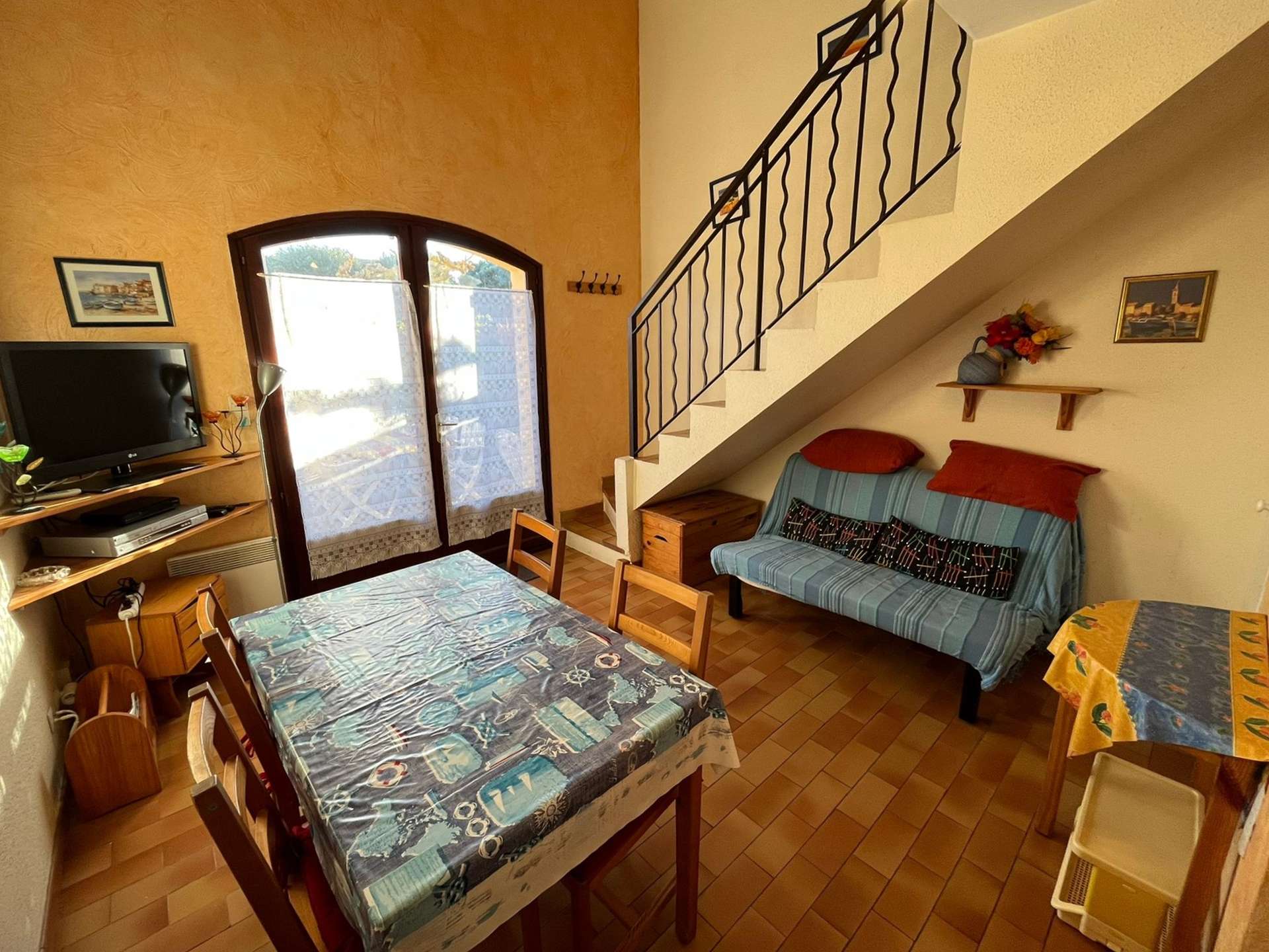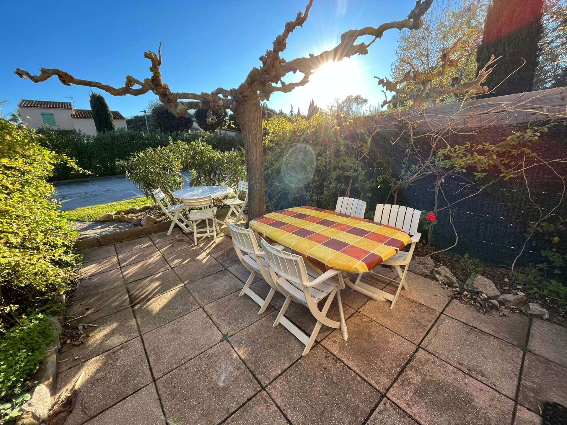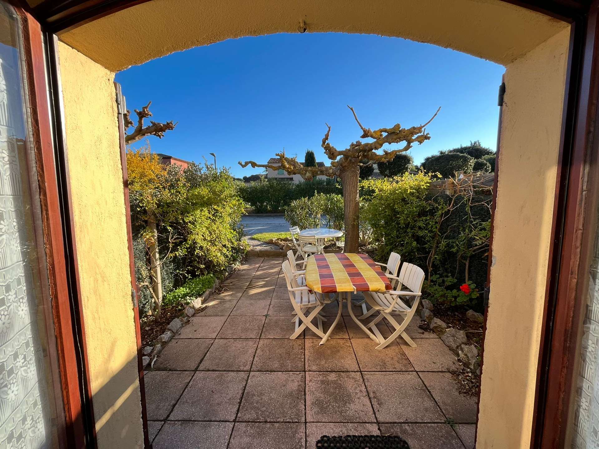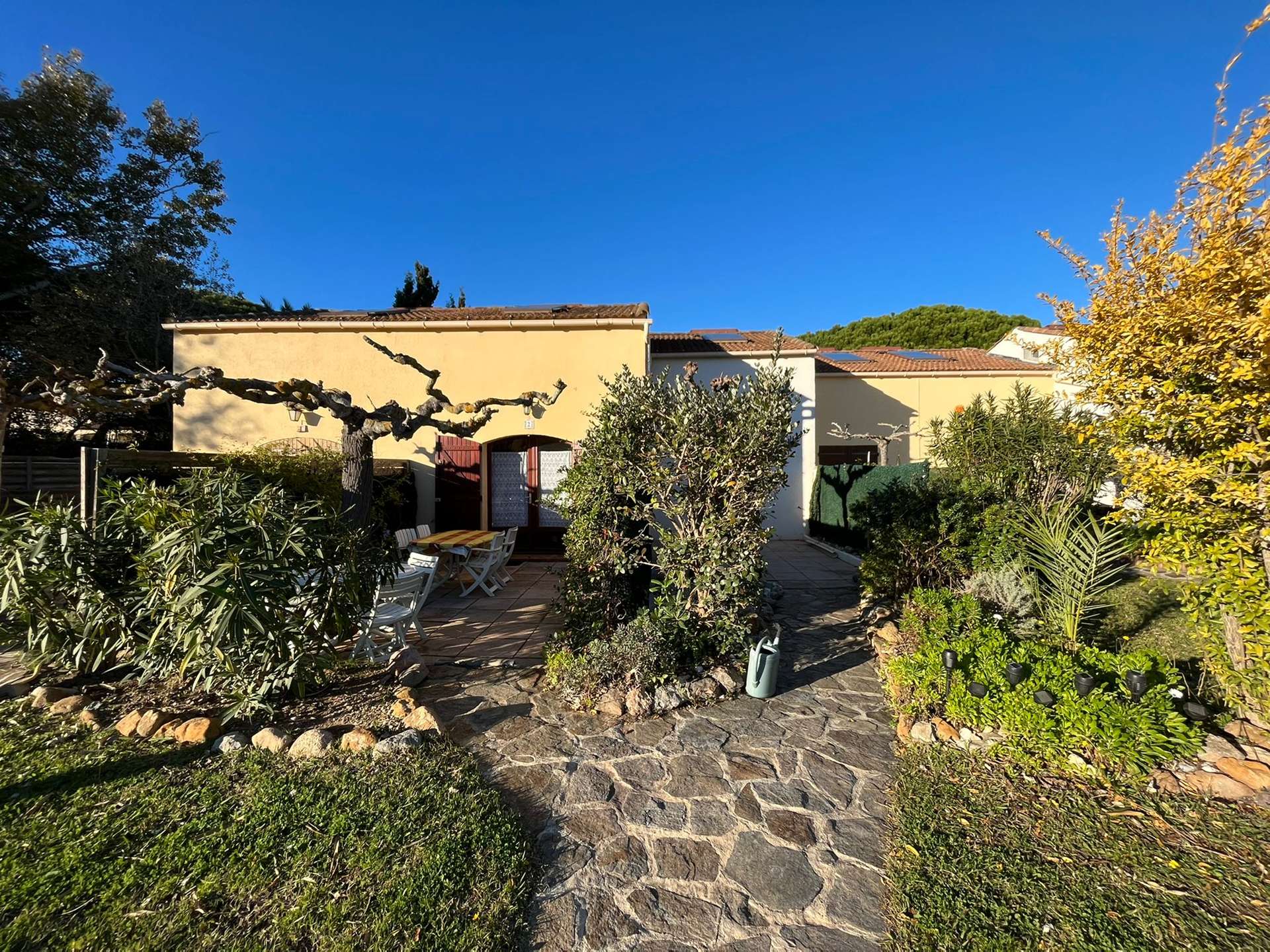 Maisonnette de type 2 + Mezzanine pour 5 personnes dans une petite résidence à 700 m de le plage de la Badine sur la Presqu'île de Giens. Commerces de proximité en saison estivale. Parking Privé. Climatisation.
