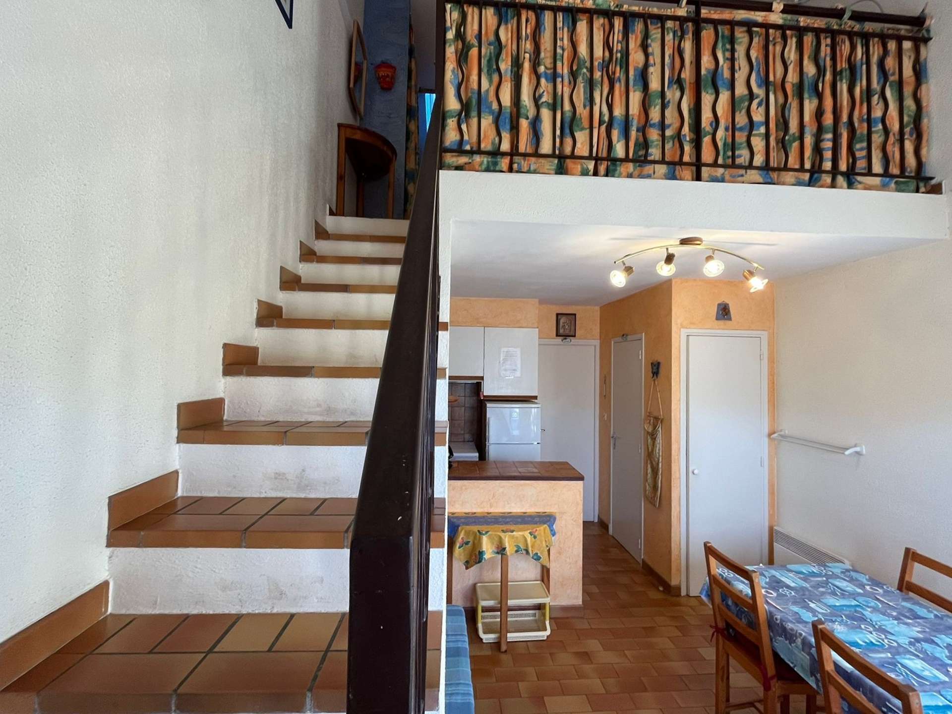 Un séjour avec une cuisine, une chambre, une chambre en mezzanine, une salle d'eau avec un WC, un WC indépendant et une terrasse non close.