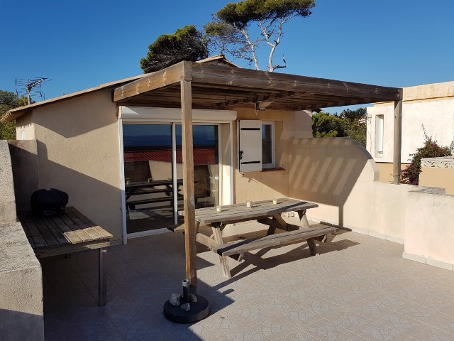 Grande terrasse avec pergola et vue sur l'île de Porquerolles. Stationnement privé extérieur. Wifi (fibre) & Climatisation dans le séjour.