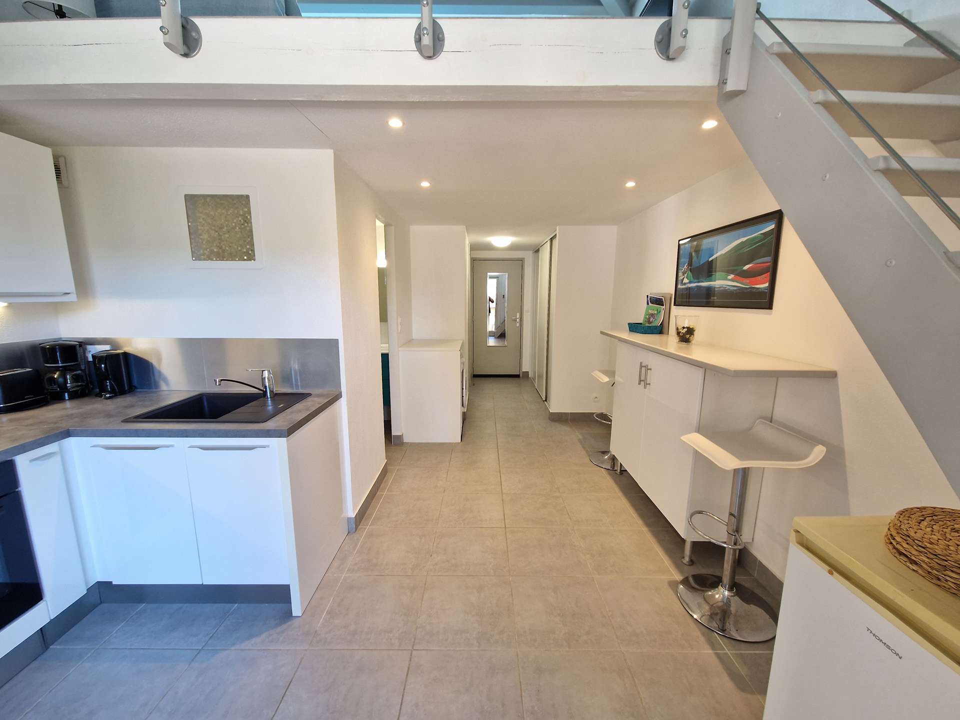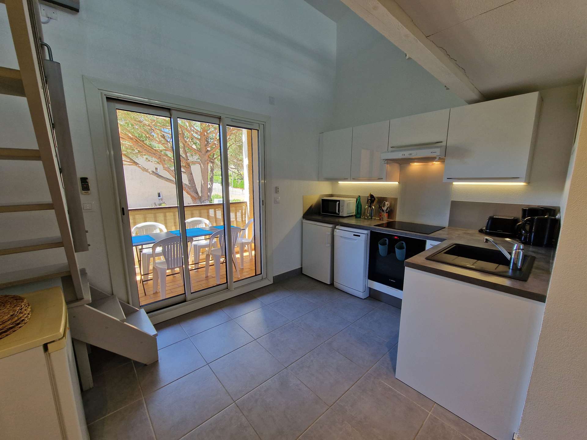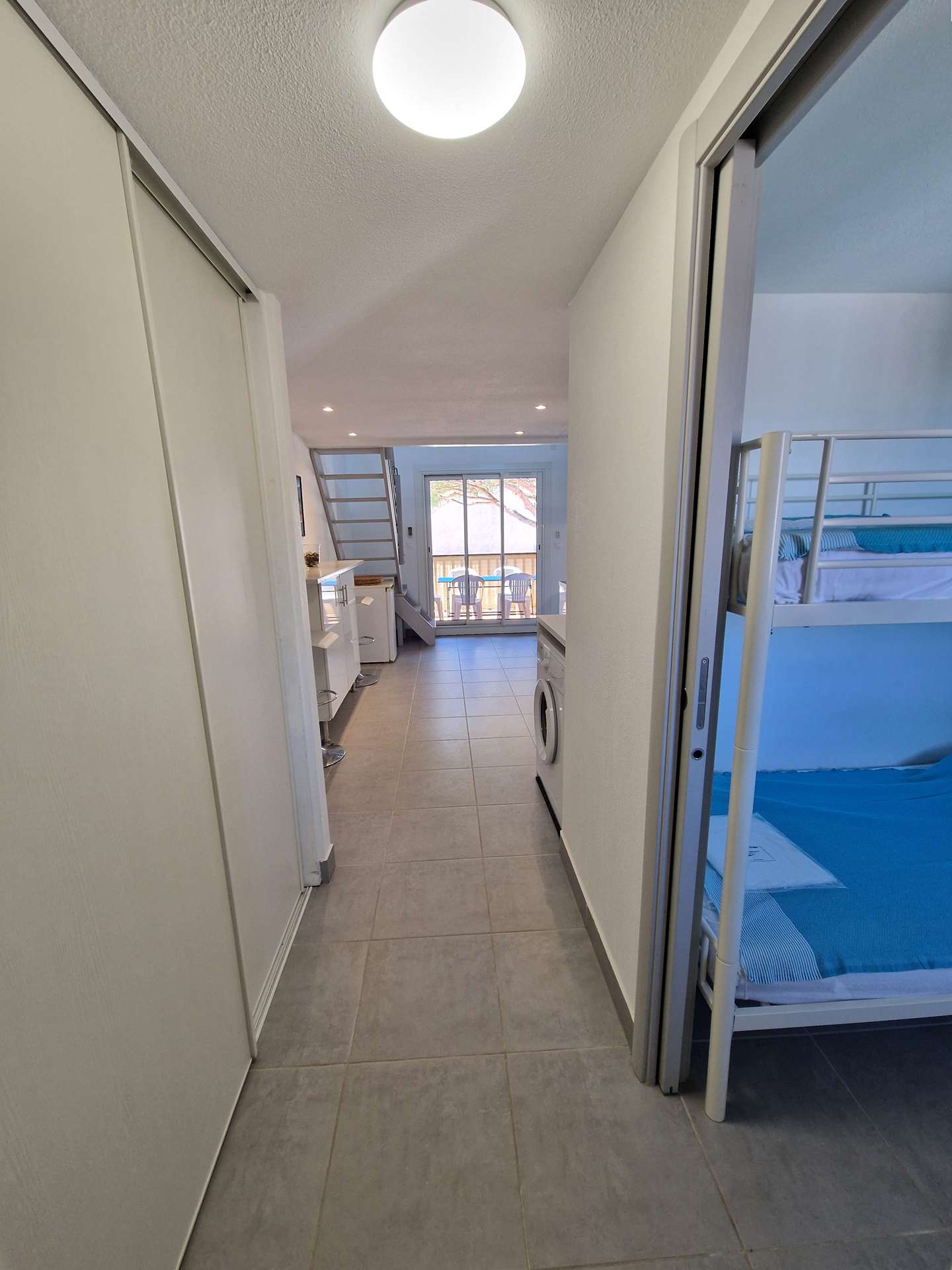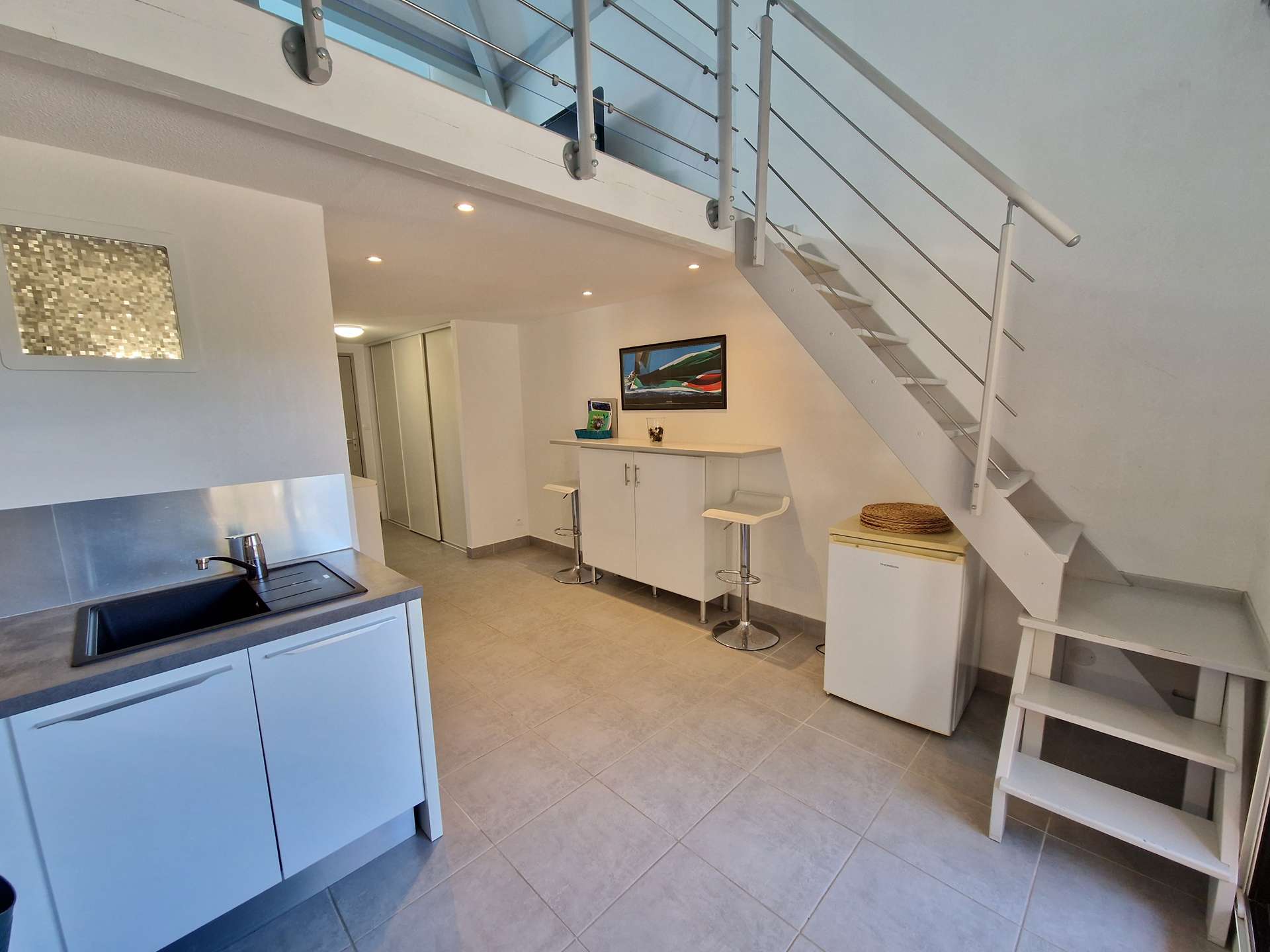 Niveau bas : une chambre (lits superposés), cuisine, une salle d'eau avec WC, terrasse. Mezzanine: un salon avec canapé convertible et alcôve avec un lit double.
