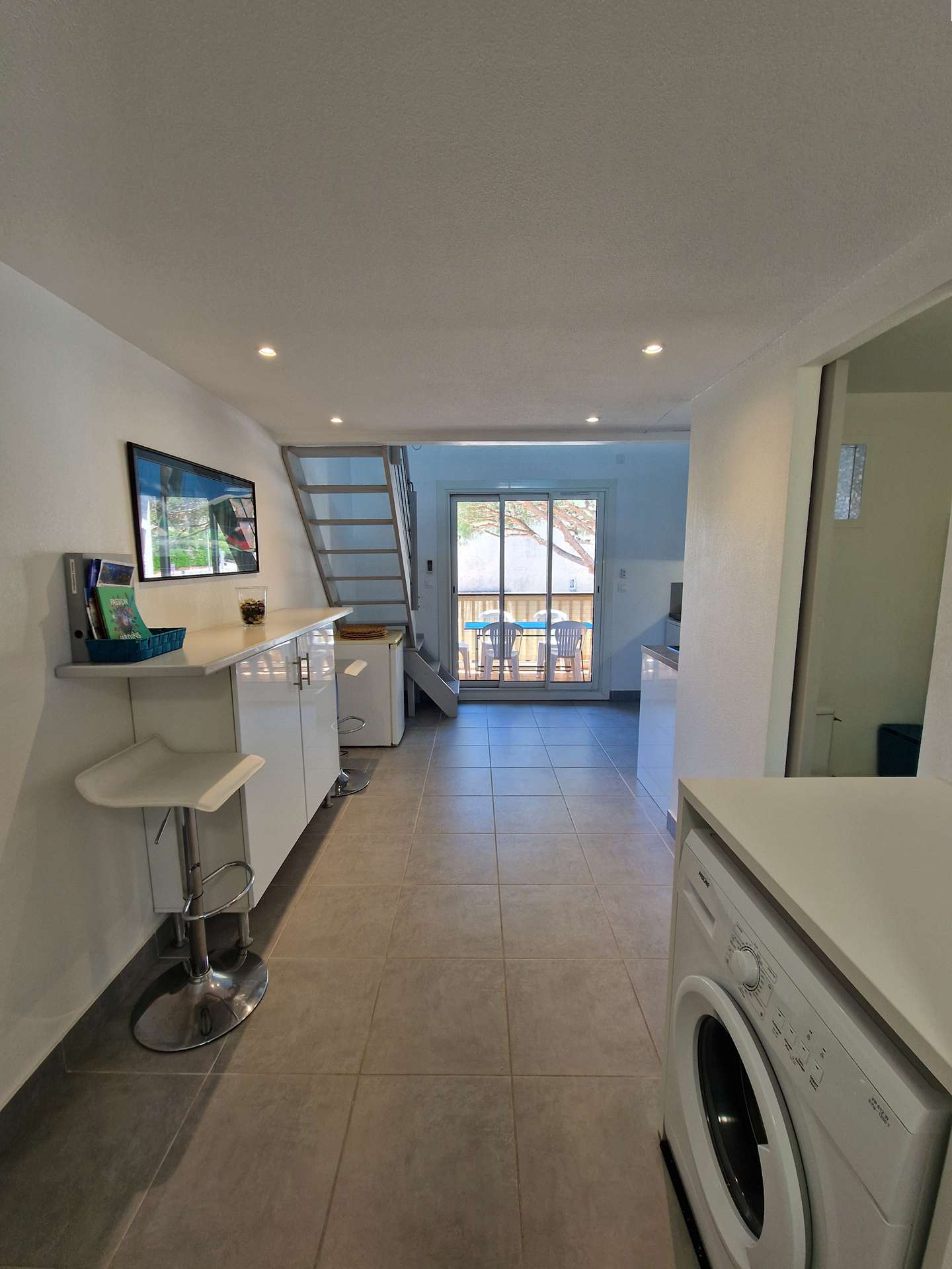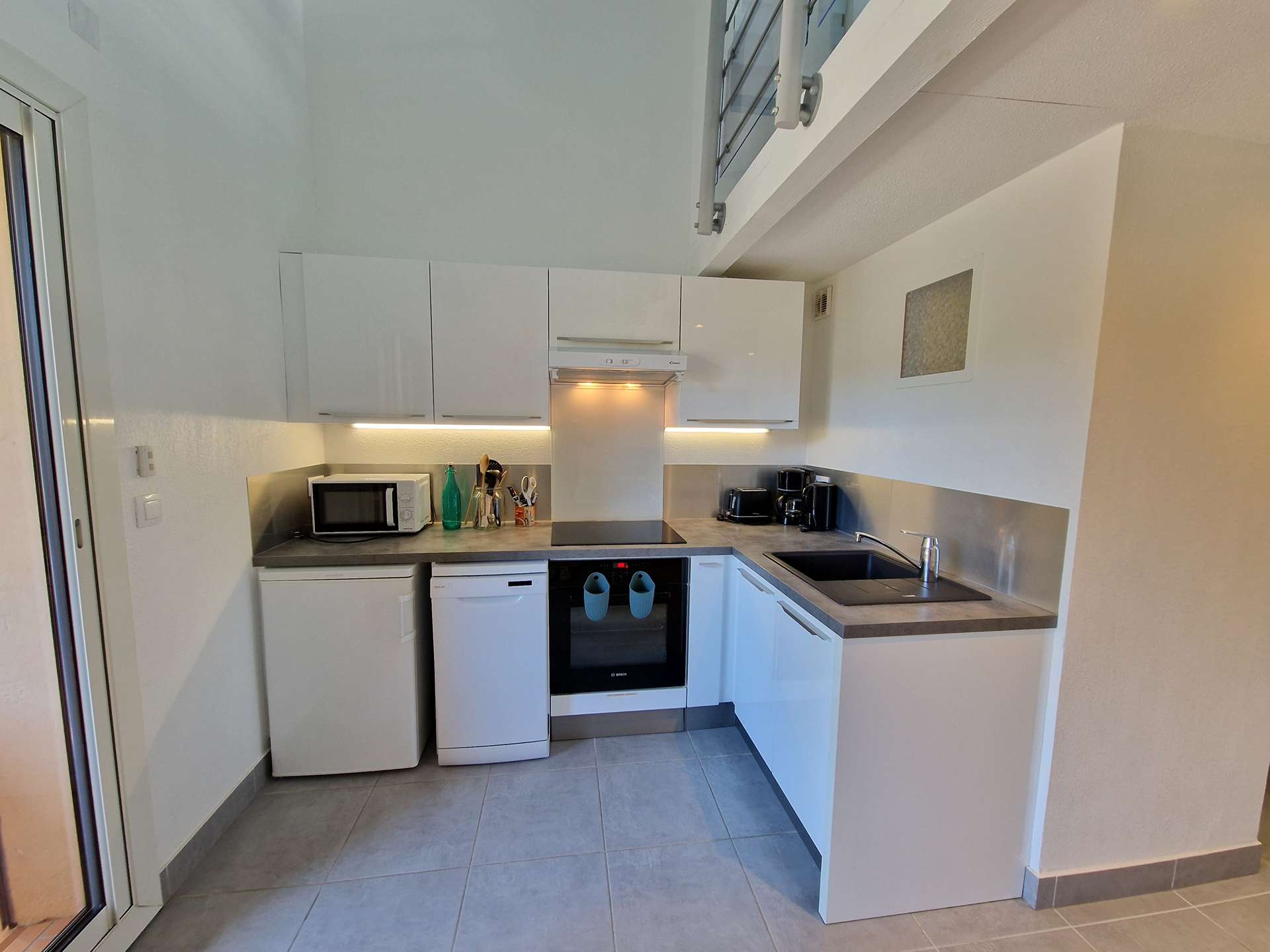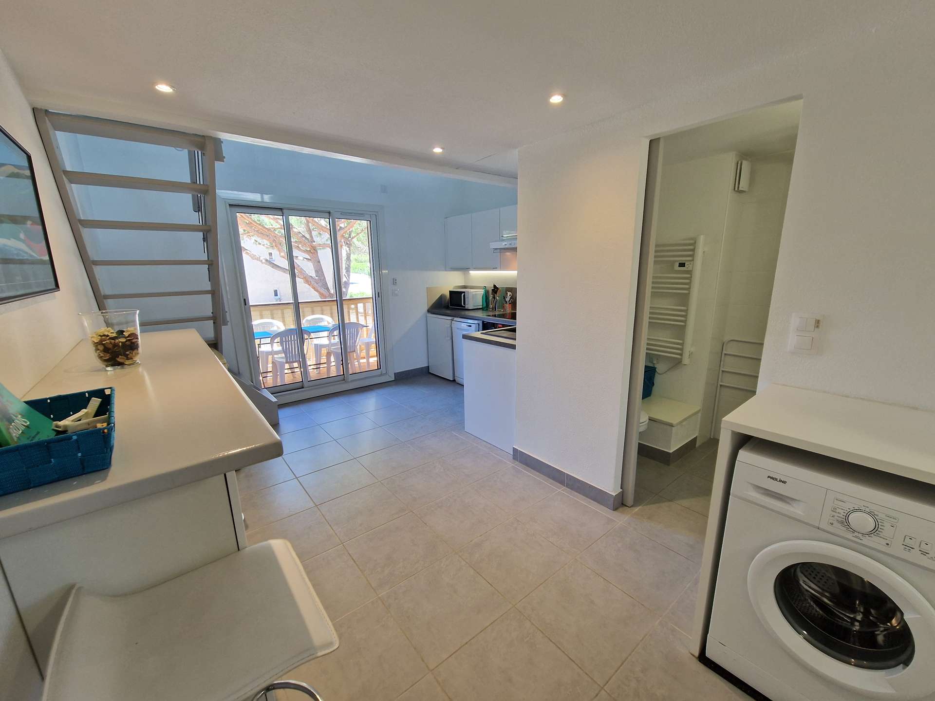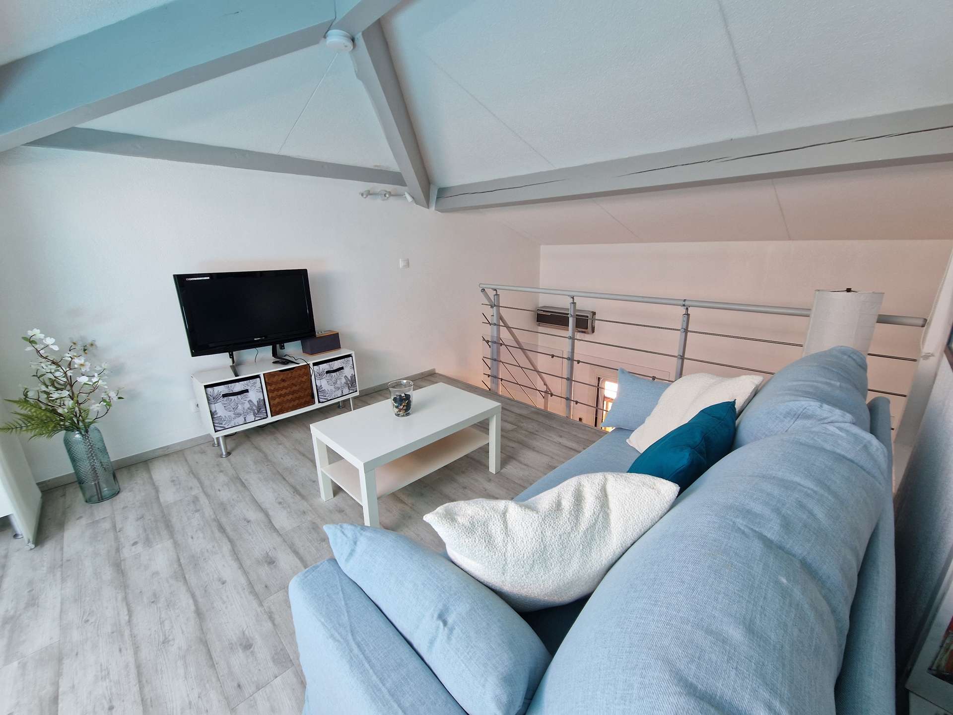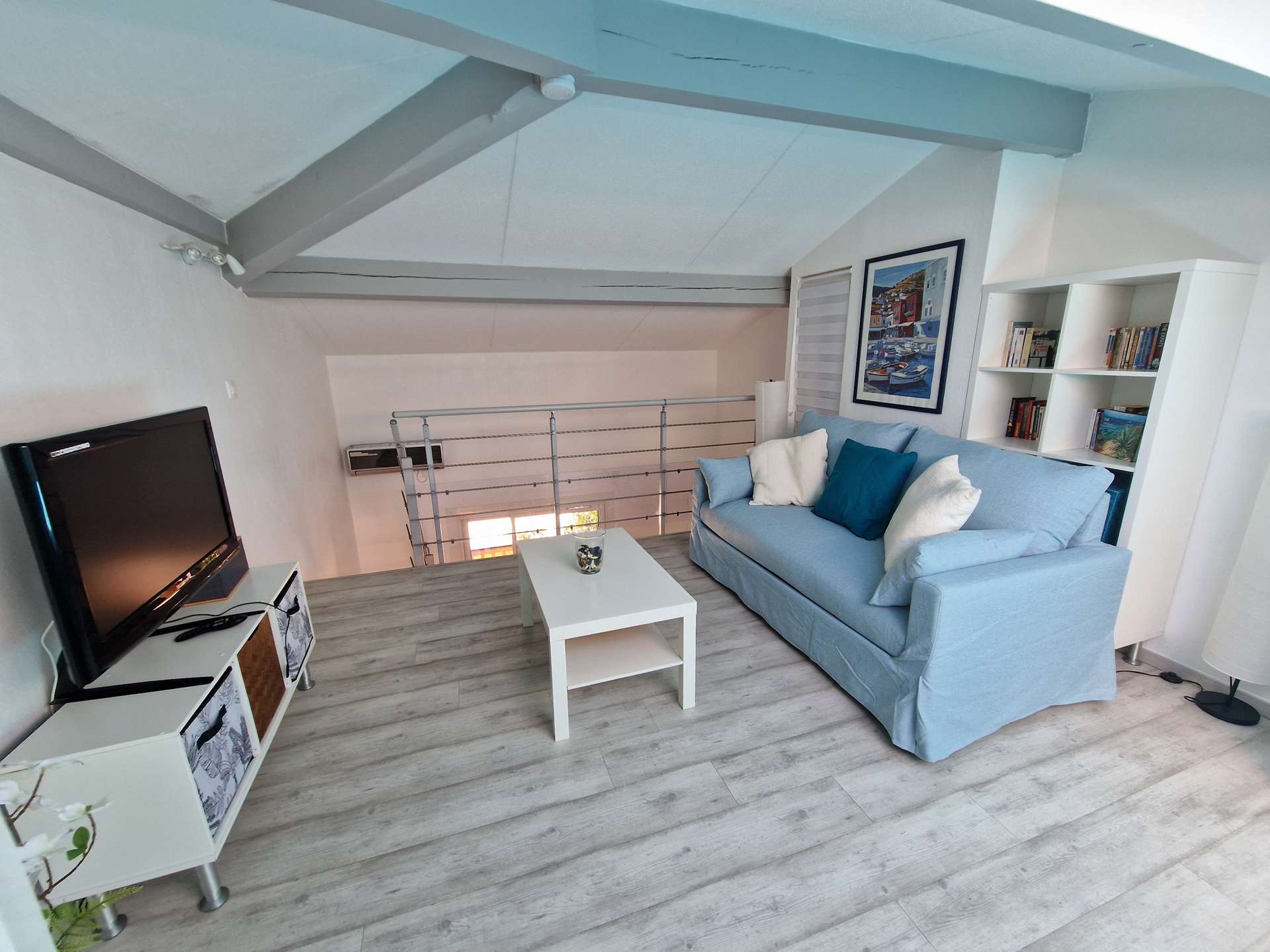 Niveau bas : une chambre (lits superposés), cuisine, une salle d'eau avec WC, terrasse. Mezzanine: un salon avec canapé convertible et alcôve avec un lit double.
