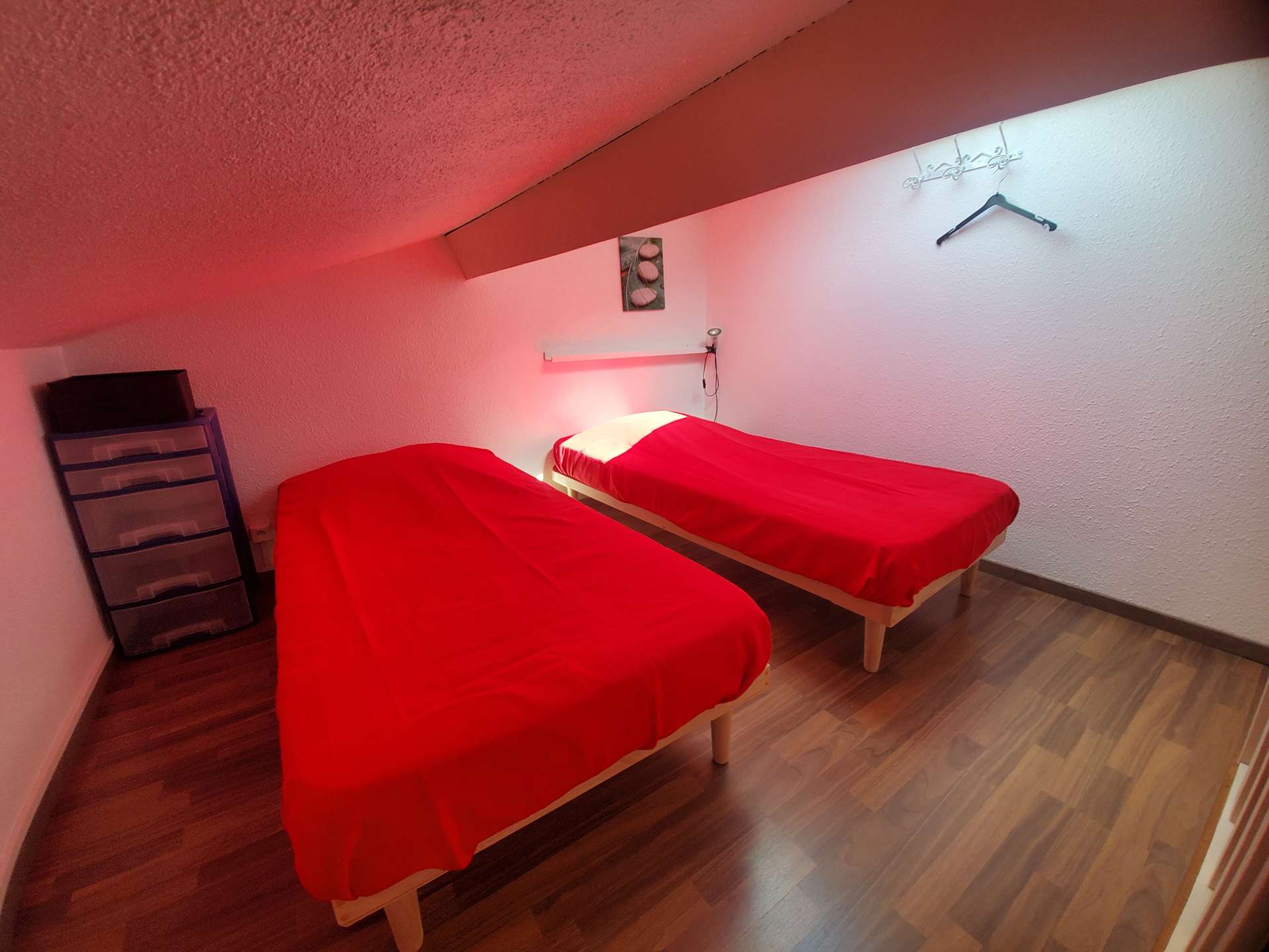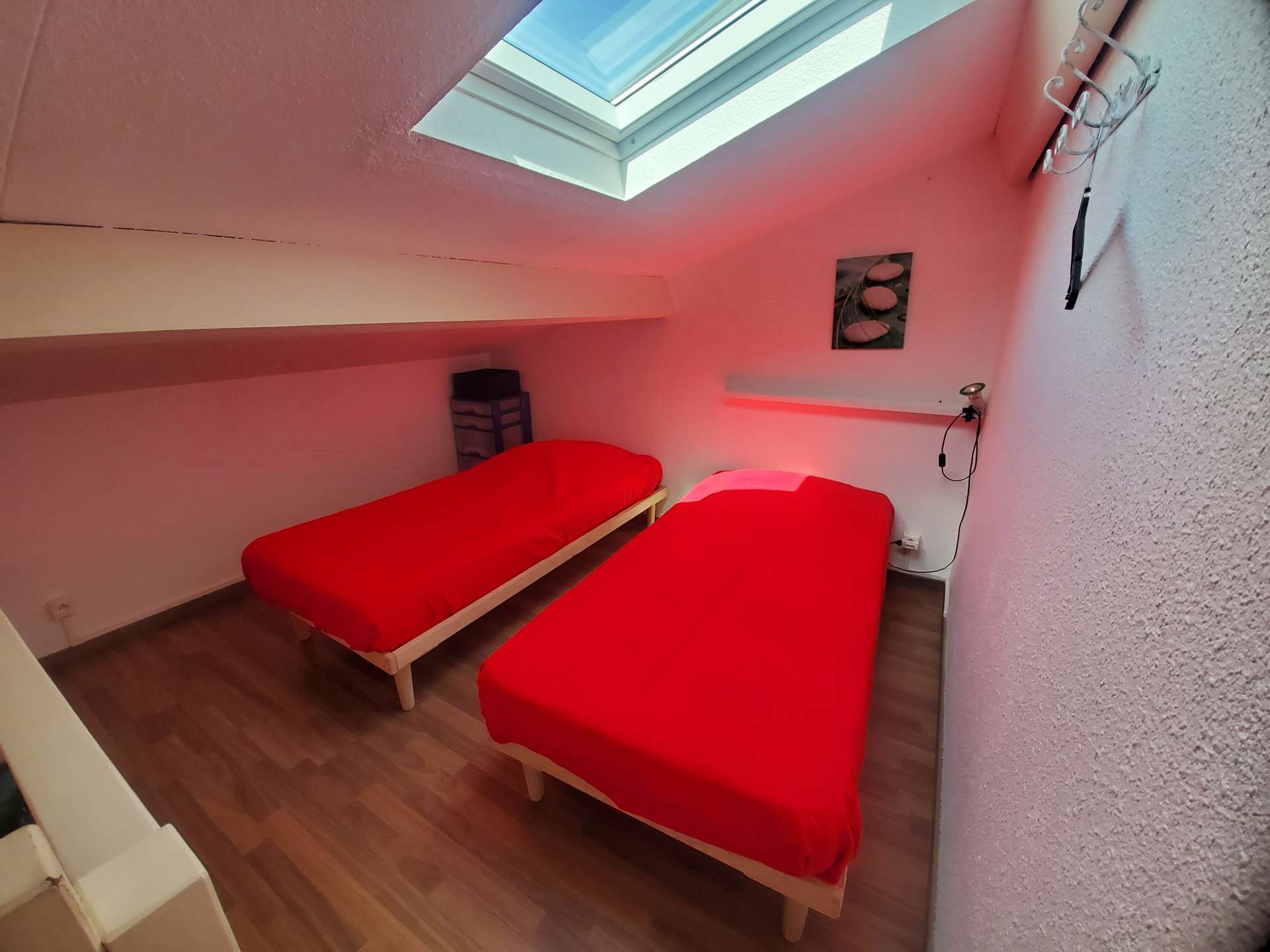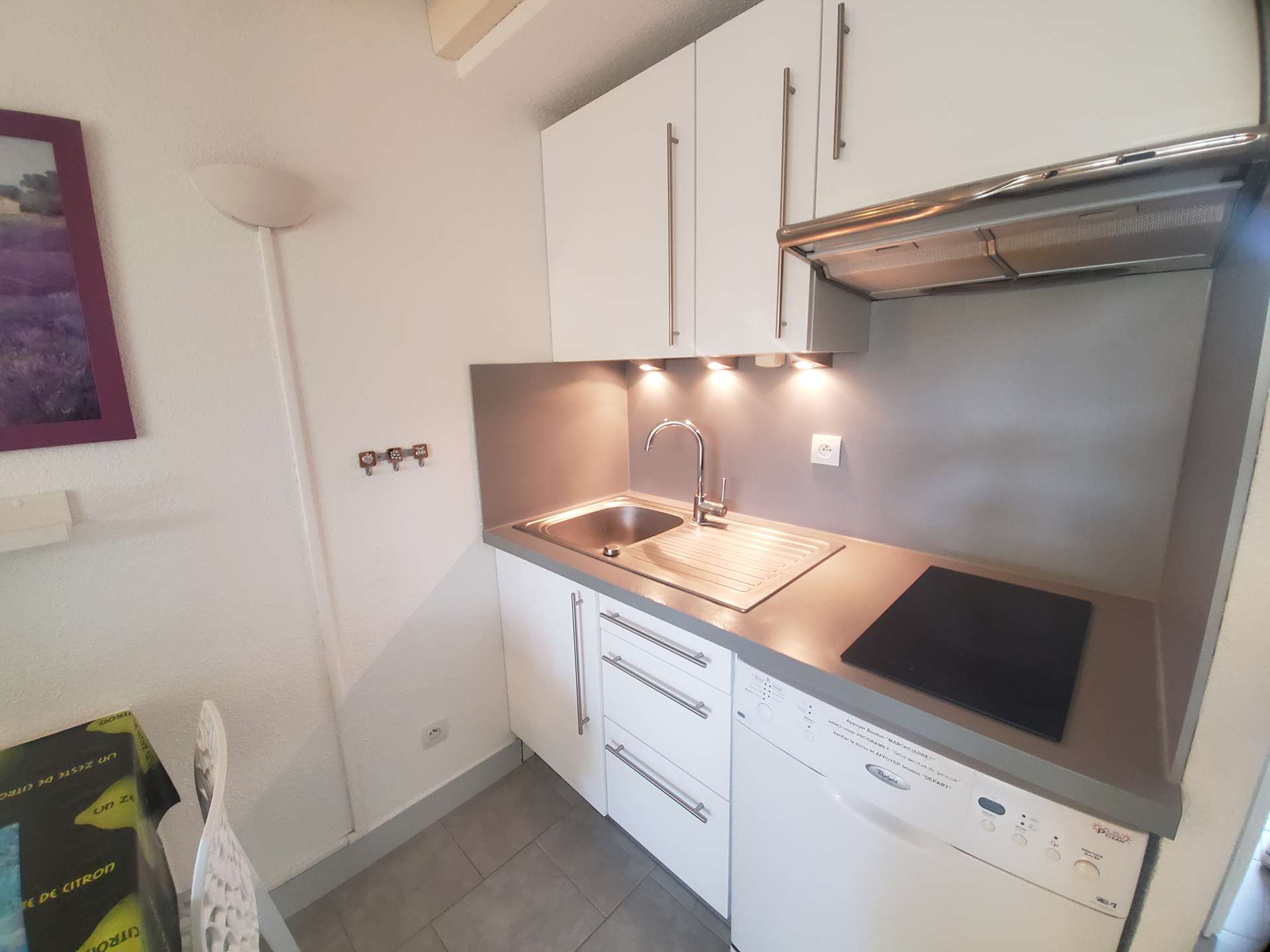 Un séjour avec kitchenette, 1 chambre, une 2ème chambre sur la mezzanine sous comble, une salle d'eau avec un WC et une terrasse.