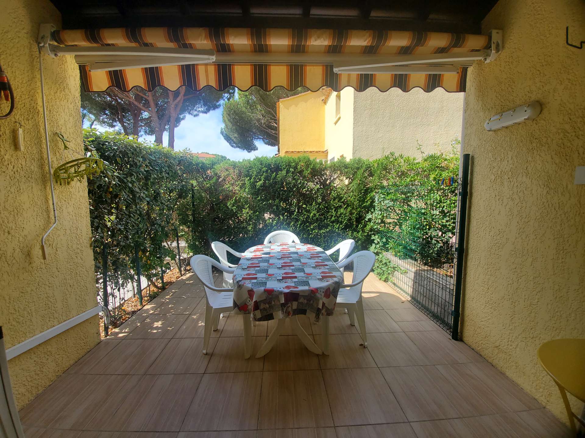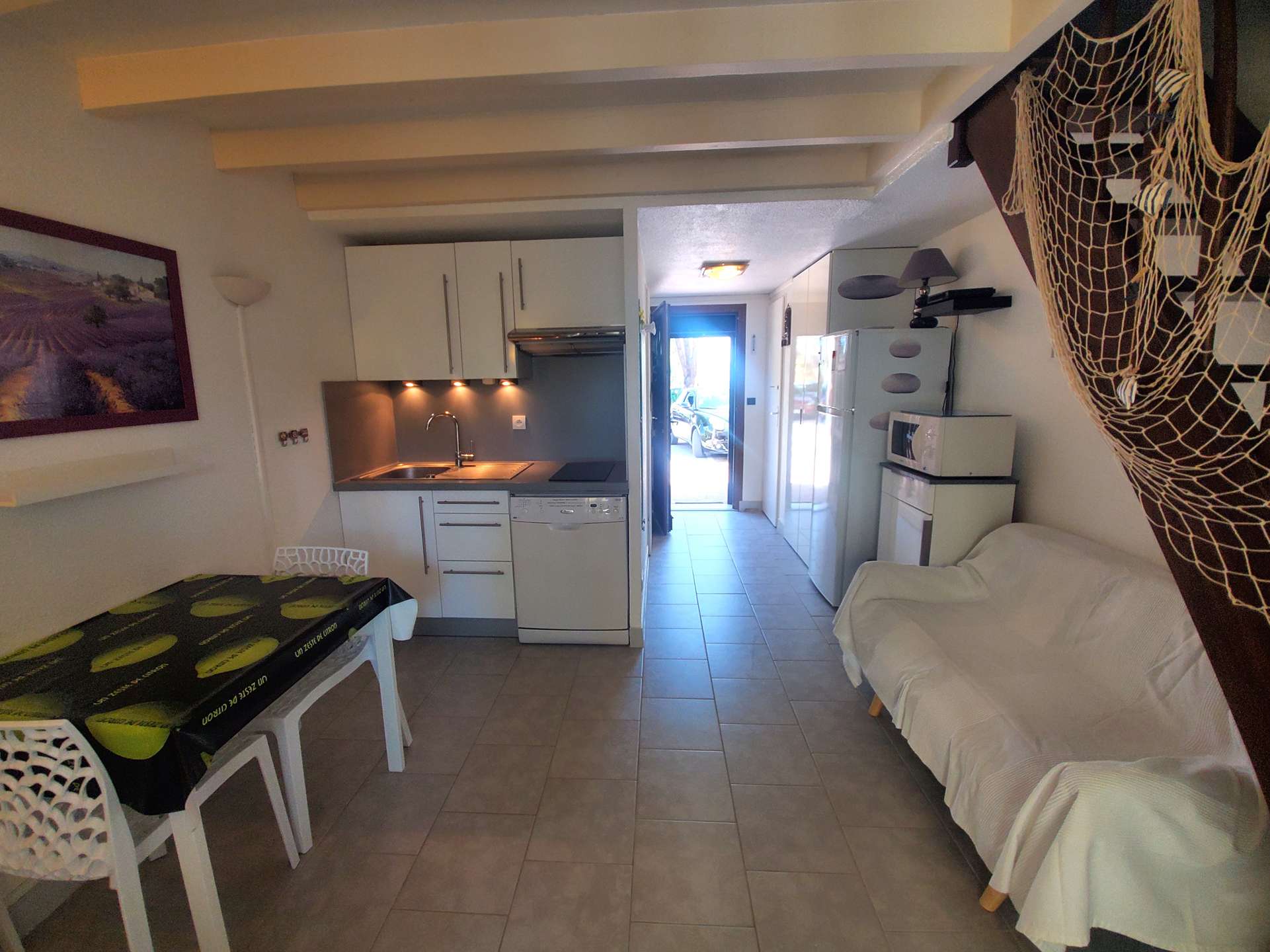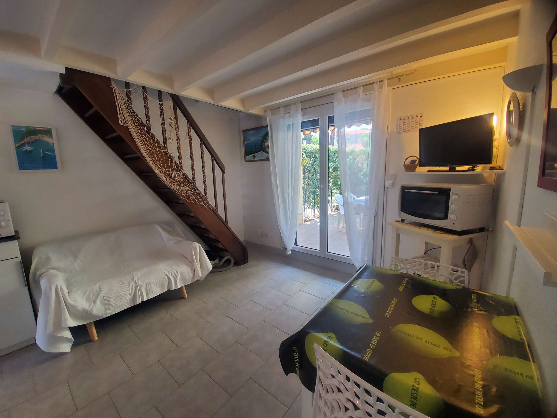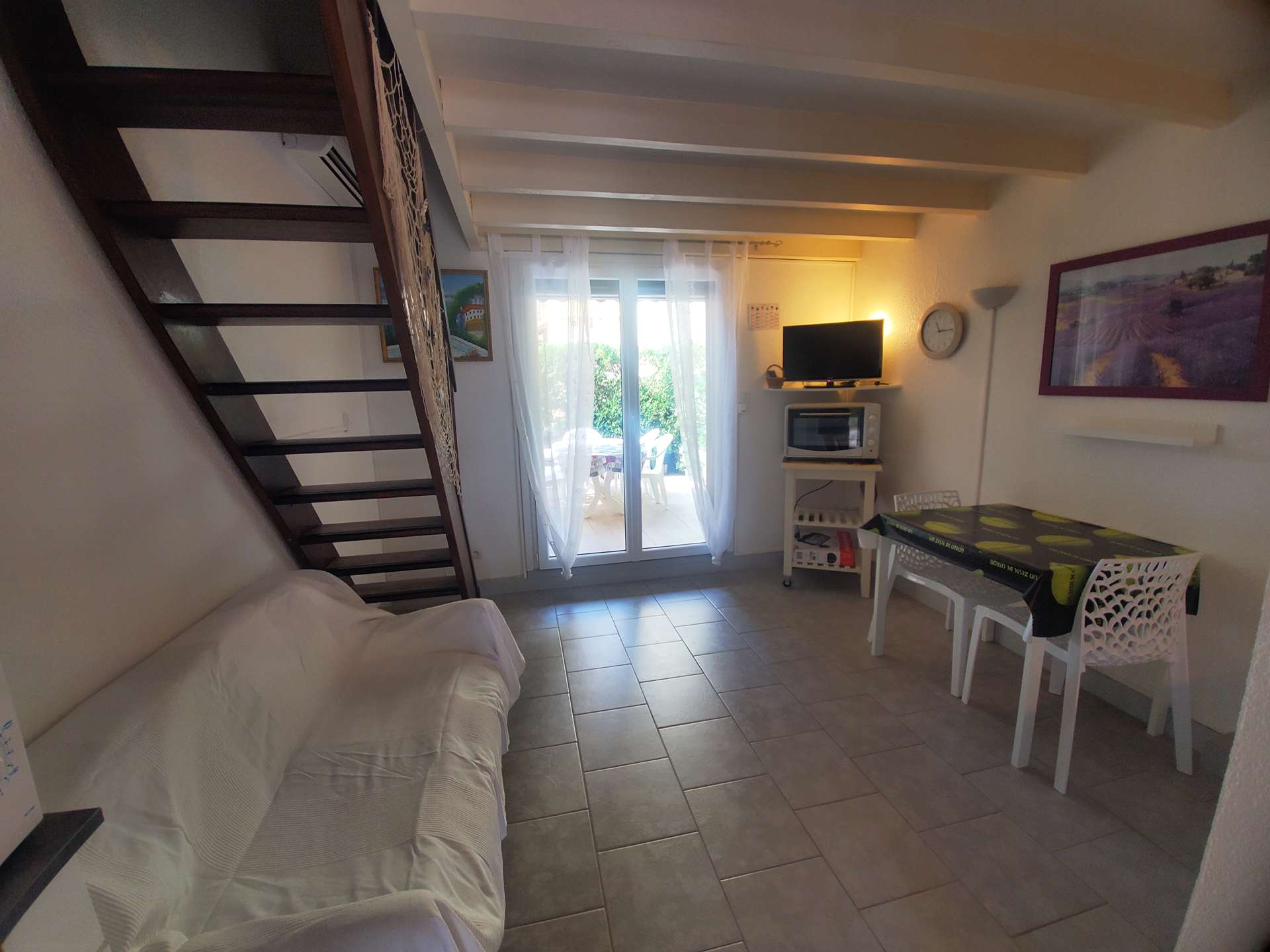Maisonnette climatisée de type 2 + Mezzanine sur deux niveaux pour 4 personnes dans une résidence avec piscine à 5 mn du village de Giens sur la Presqu'île de Giens. Wifi. Parking privé. Climatisation dans le séjour.
