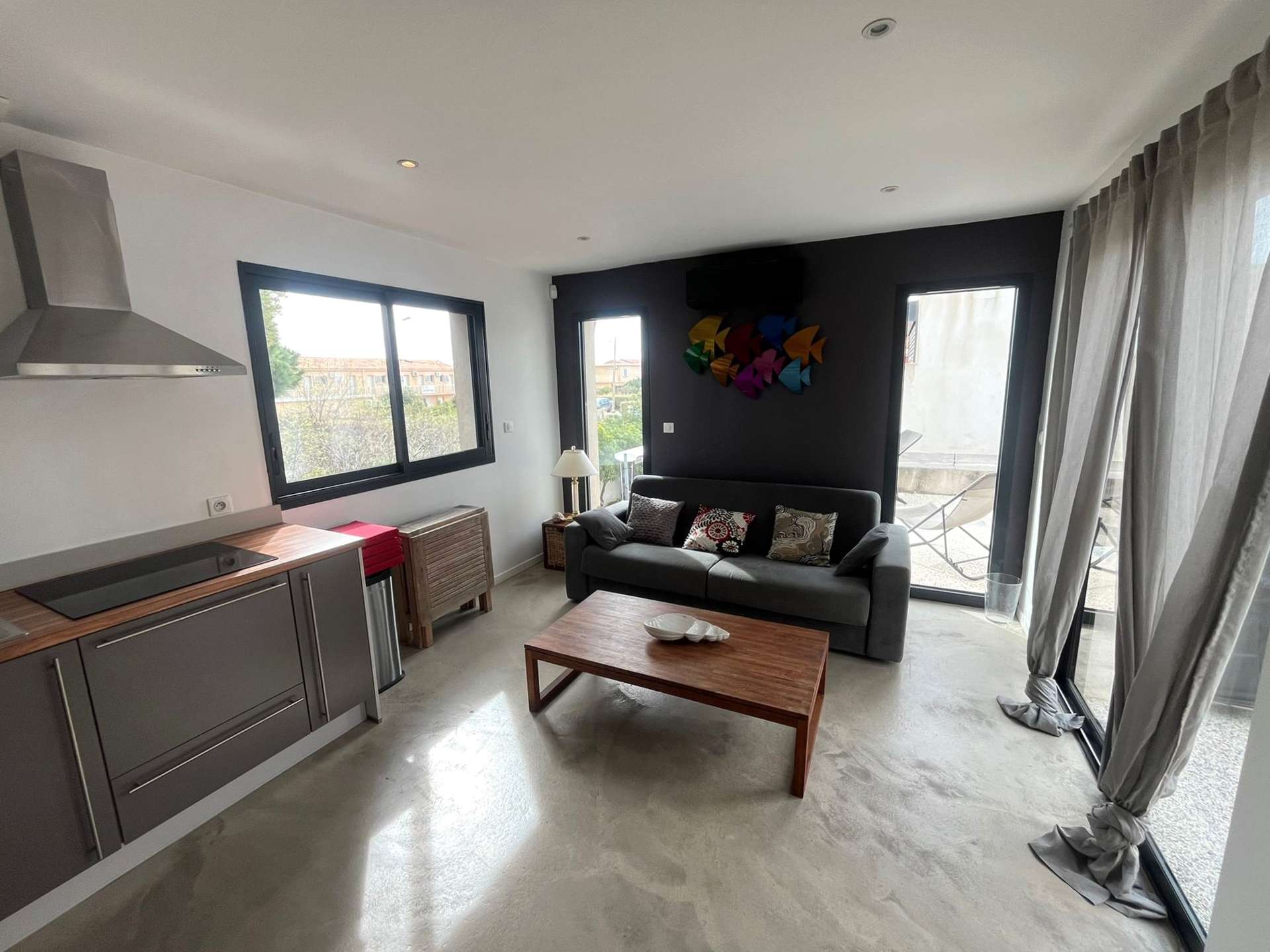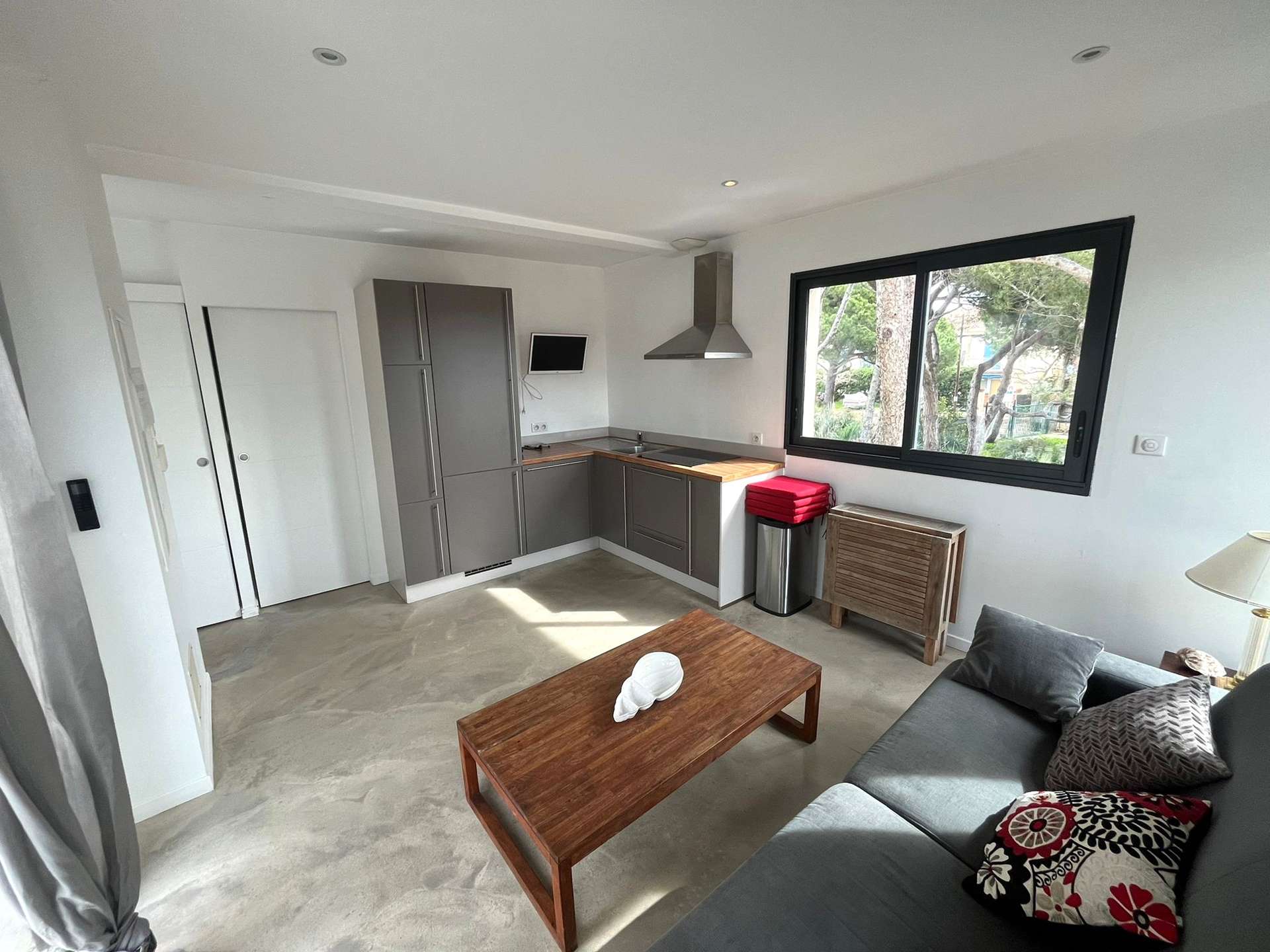 Un séjour avec cuisine, 2 chambres, une salle d’eau avec un WC et une