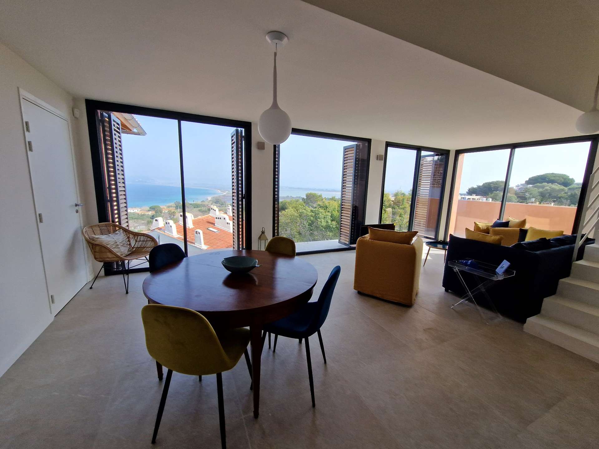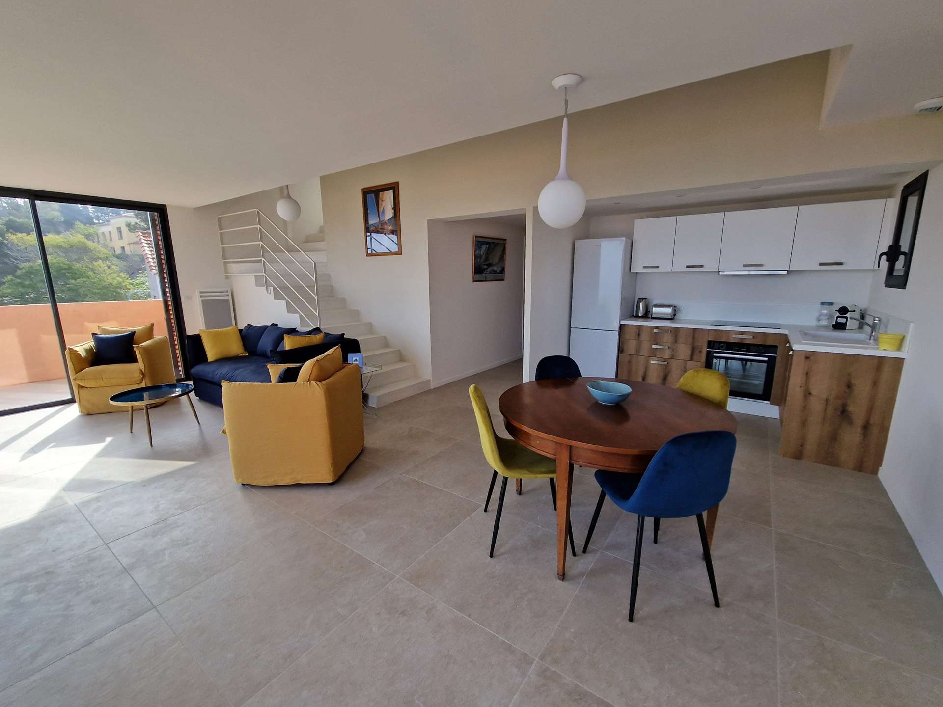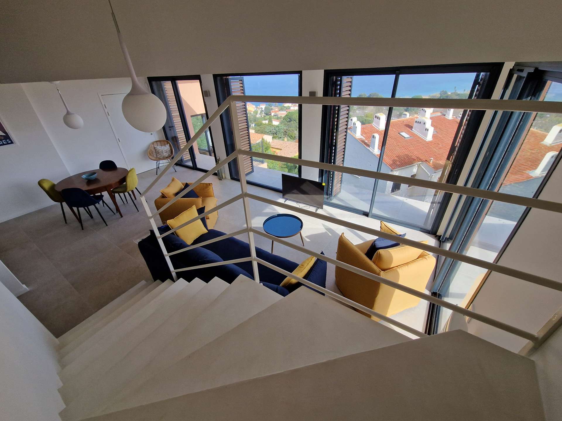 Séjour et cuisine avec très belle vue mer !! Chambre, WC indépendant, salle de bain, terrasse. A l'étage : une chambre avec un WC.