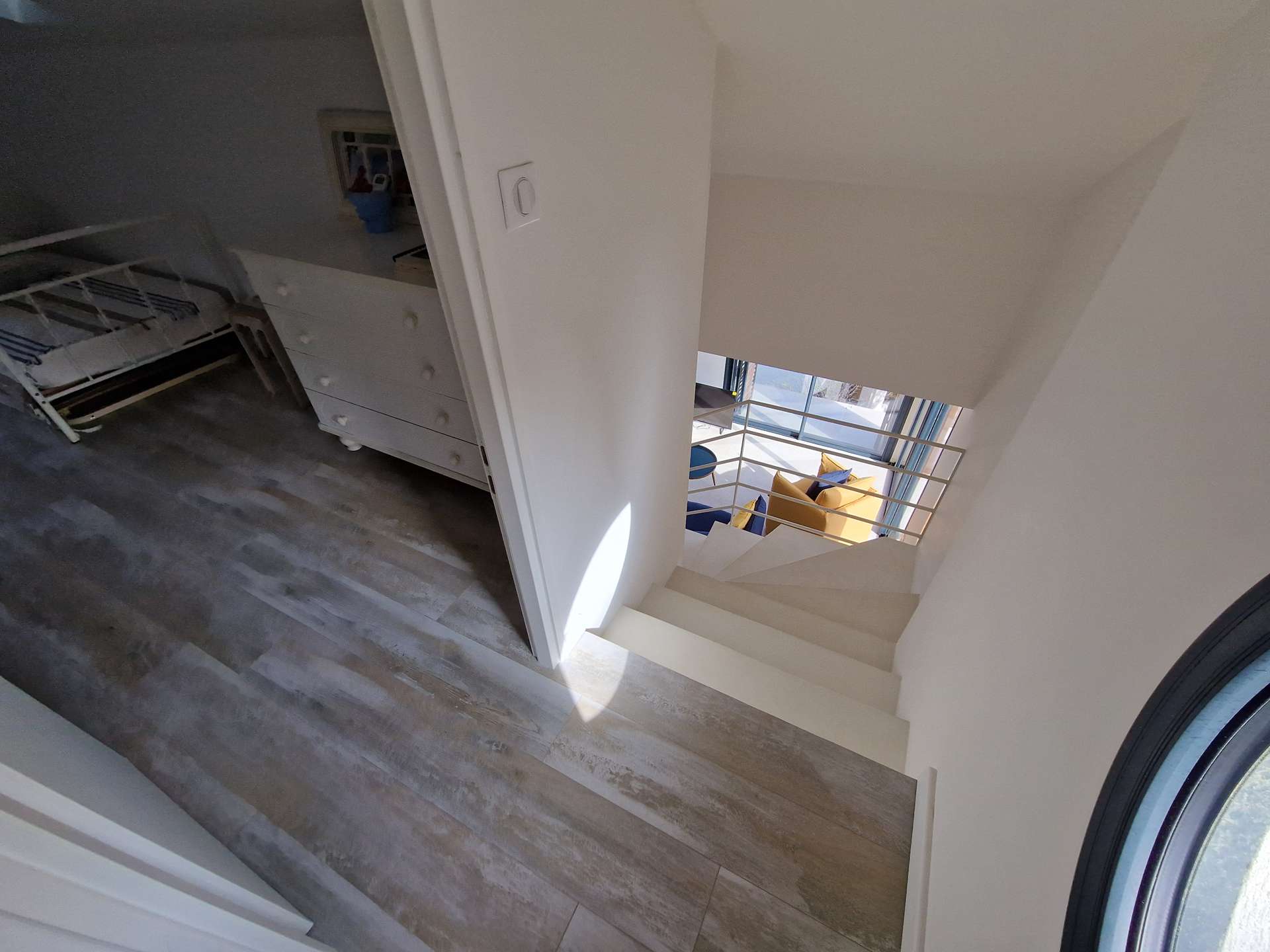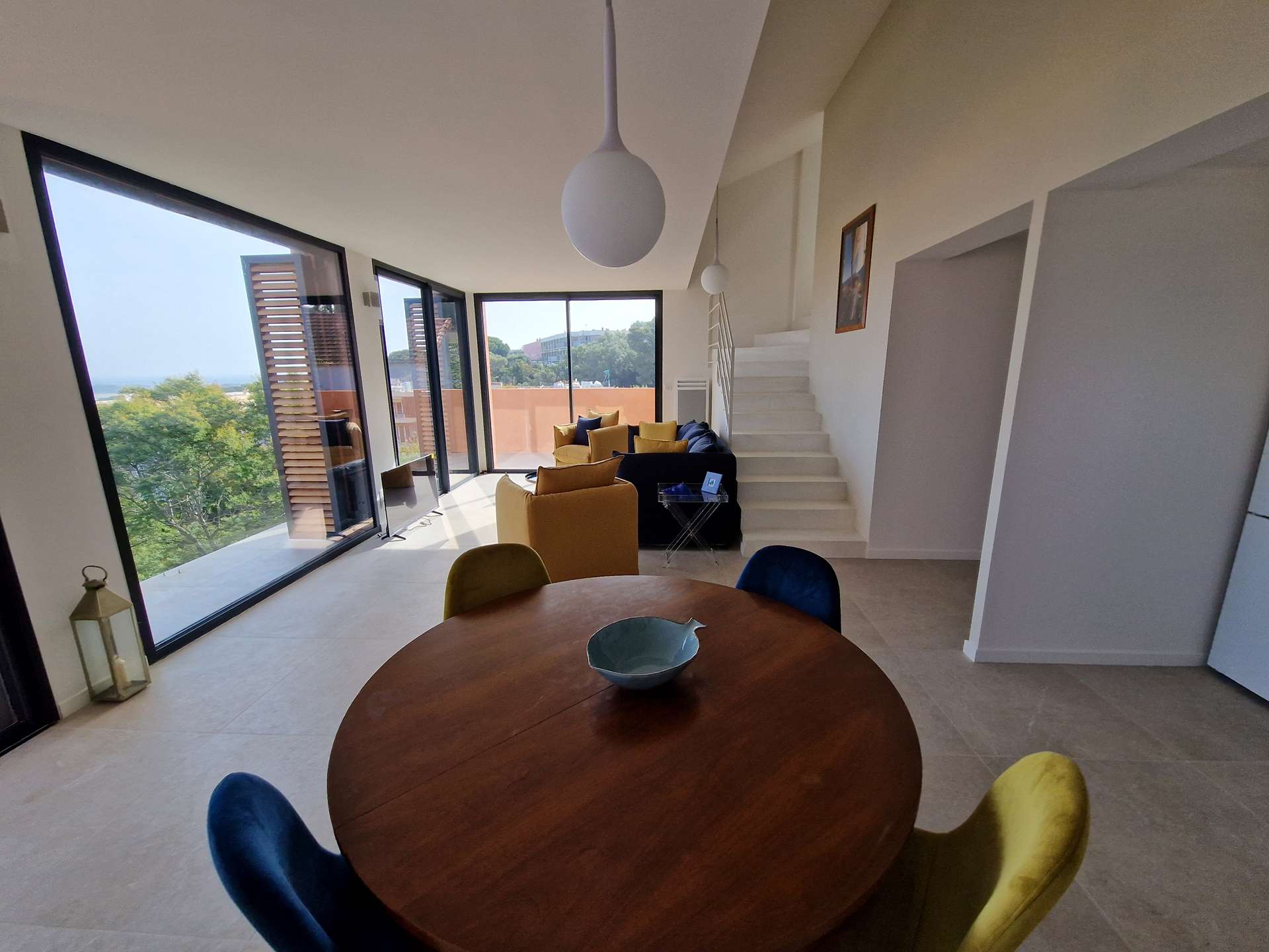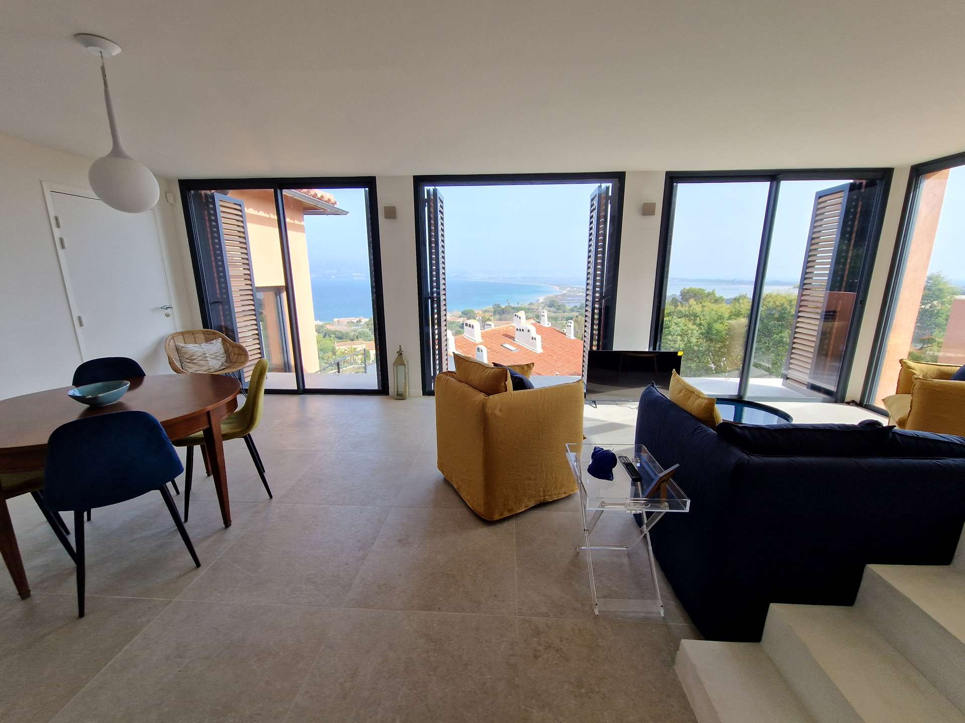 Séjour et cuisine avec très belle vue mer !! Chambre, WC indépendant, salle de bain, terrasse. A l'étage : une chambre avec un WC.